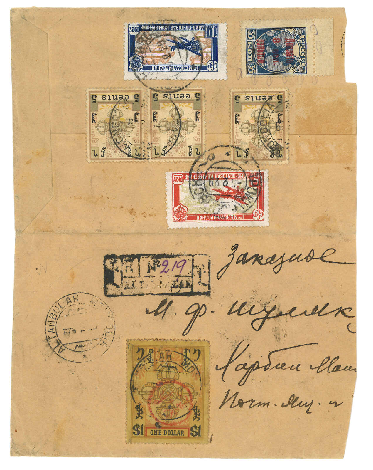 Shooliack。掛號封,正貼蒙古第一版1元加蓋印花用紅色圓戳,背貼5分x3 + 一枚掉票,銷阿勒坦布拉格日戳。加貼蘇聯票3枚,銷恰克圖2.6日戳。封剖開以作展示。蒙古第一版票曾被加蓋紅色圓戳以作印花稅票使用,貼於信封上作郵票的例子十分珍罕。此封見於Hellrigl記錄中,但由於收件人身份以及混貼蘇聯票而非中國欠資票,故應為集郵封。Hellrigl著《The Postal History of Mongolia 1841-1941》第330頁圖236原件。(Image 1)