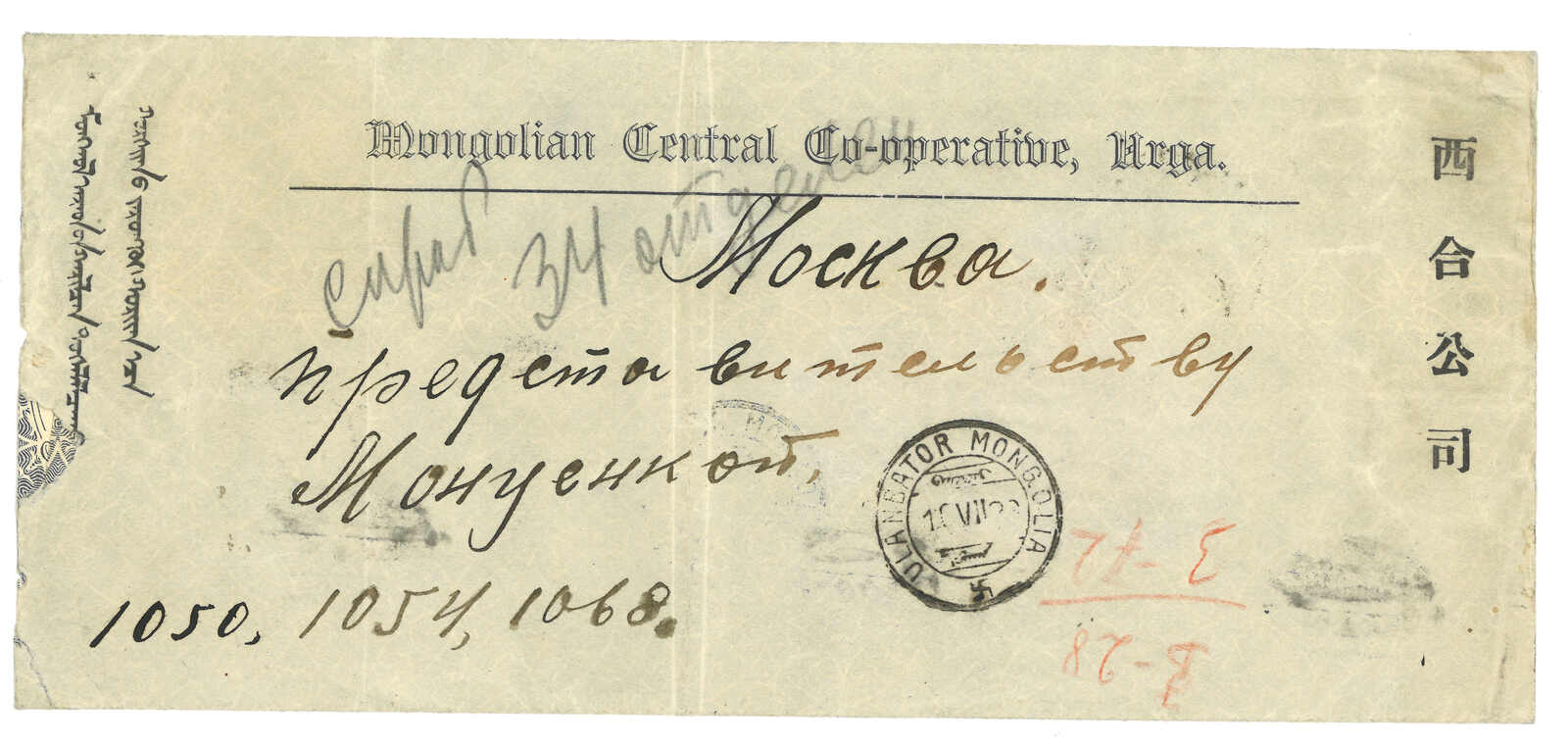 1926 Ulanbator (Jul) to Moscow. Mongolian Central Cooperative cover, f.w. unovpt. revenue stamp 20c in pair + ovpt POSTAGE in violet 10c, tied by Ulanbator cds. Arrived Moscow (25 Jul). Not listed in the record of covers f.w.