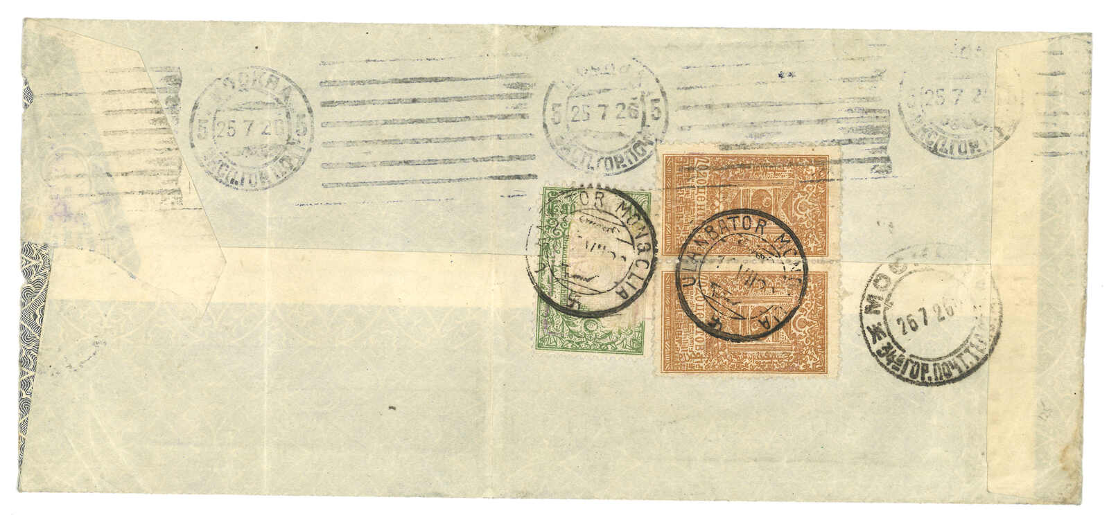 1926.7 烏蘭巴托寄莫斯科。西合公司封,背貼未加蓋印花稅票20分雙連 + 紫色加蓋“POSTAGE”10分,銷烏蘭巴托日戳。7.25抵莫斯科。未列於Hellrigl所記錄貼用未加蓋印花稅票之實寄封列表中。封中折。(Image 1)
