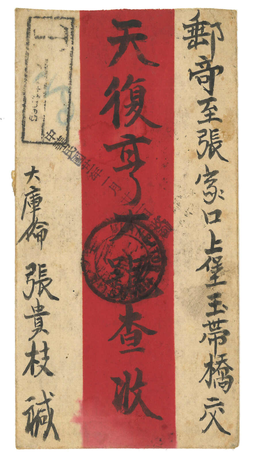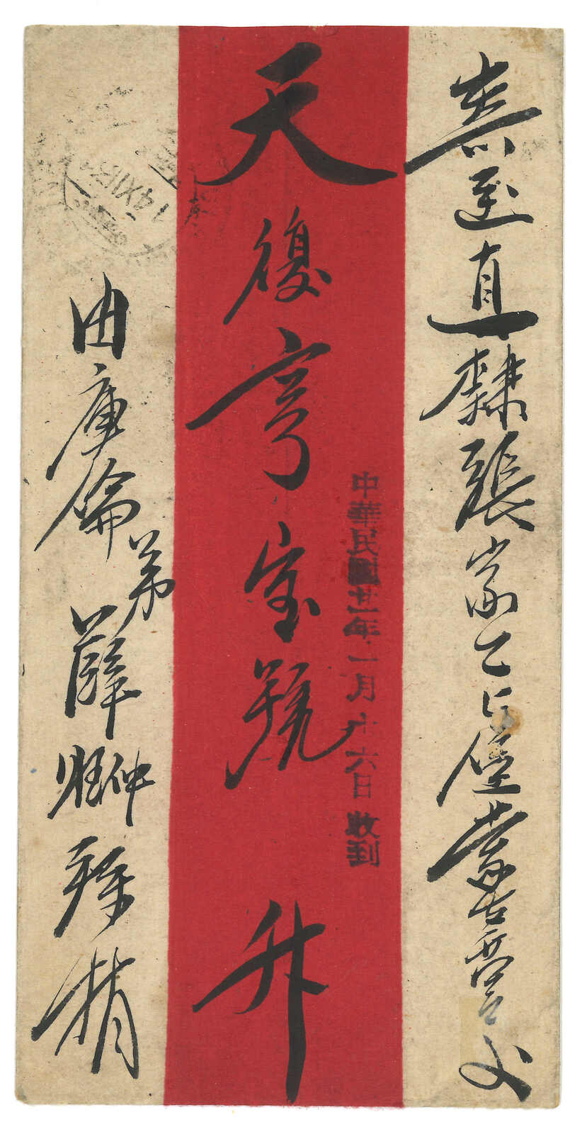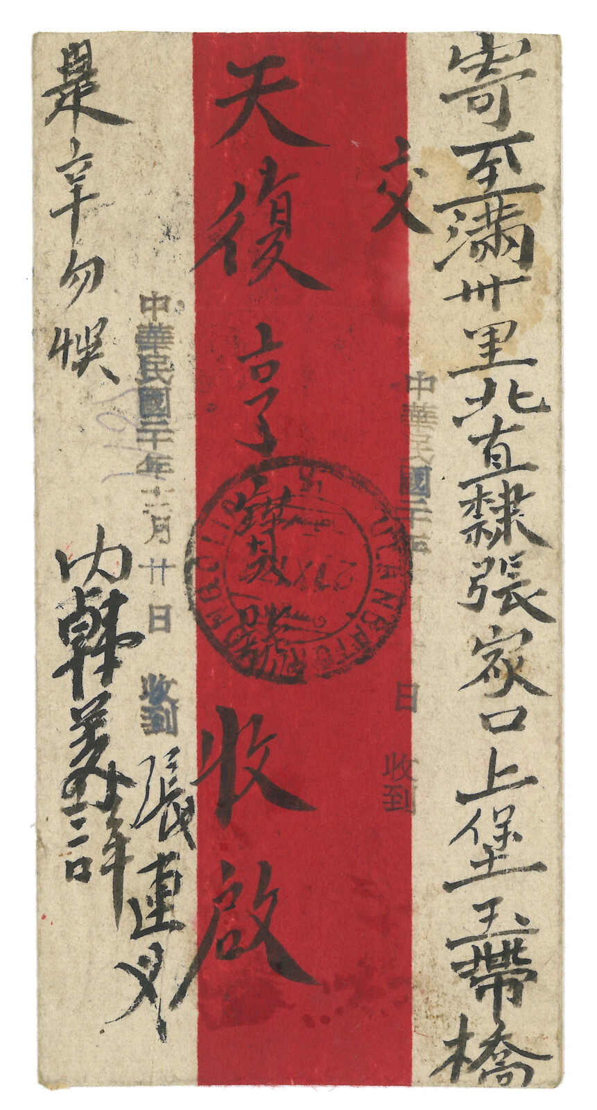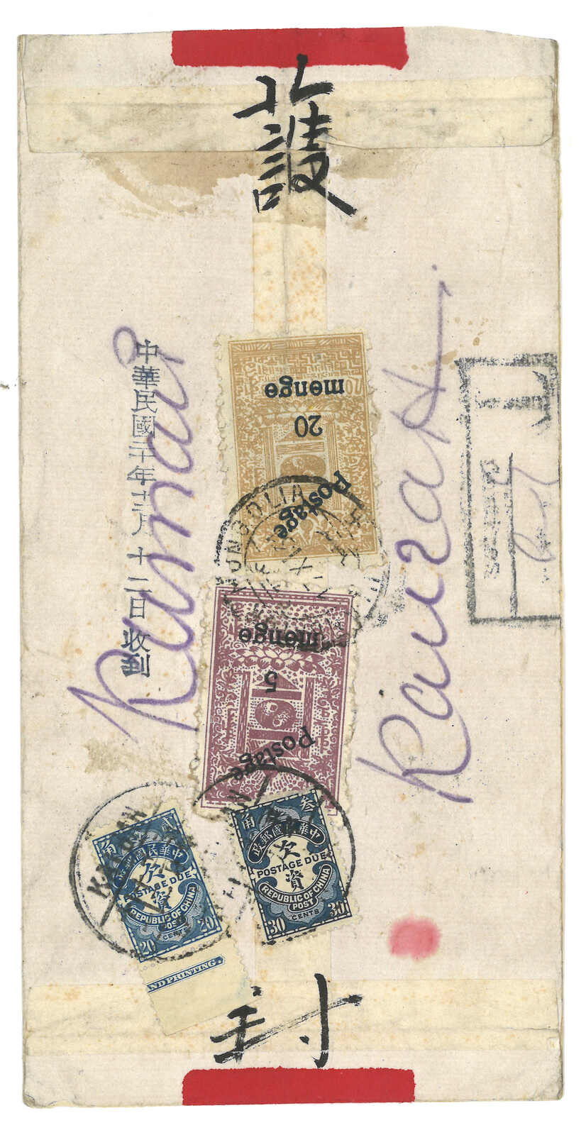 1931 Ulanbator (17 Nov) to Kalgan. Red band cover, f.w. revenue stamp surch 5 menge + 20 menge on reverse, tied by Ulanbator cds, alongside with T mark and vertical ROC d.s. (12 Dec 1931). In combination with ROC postage due