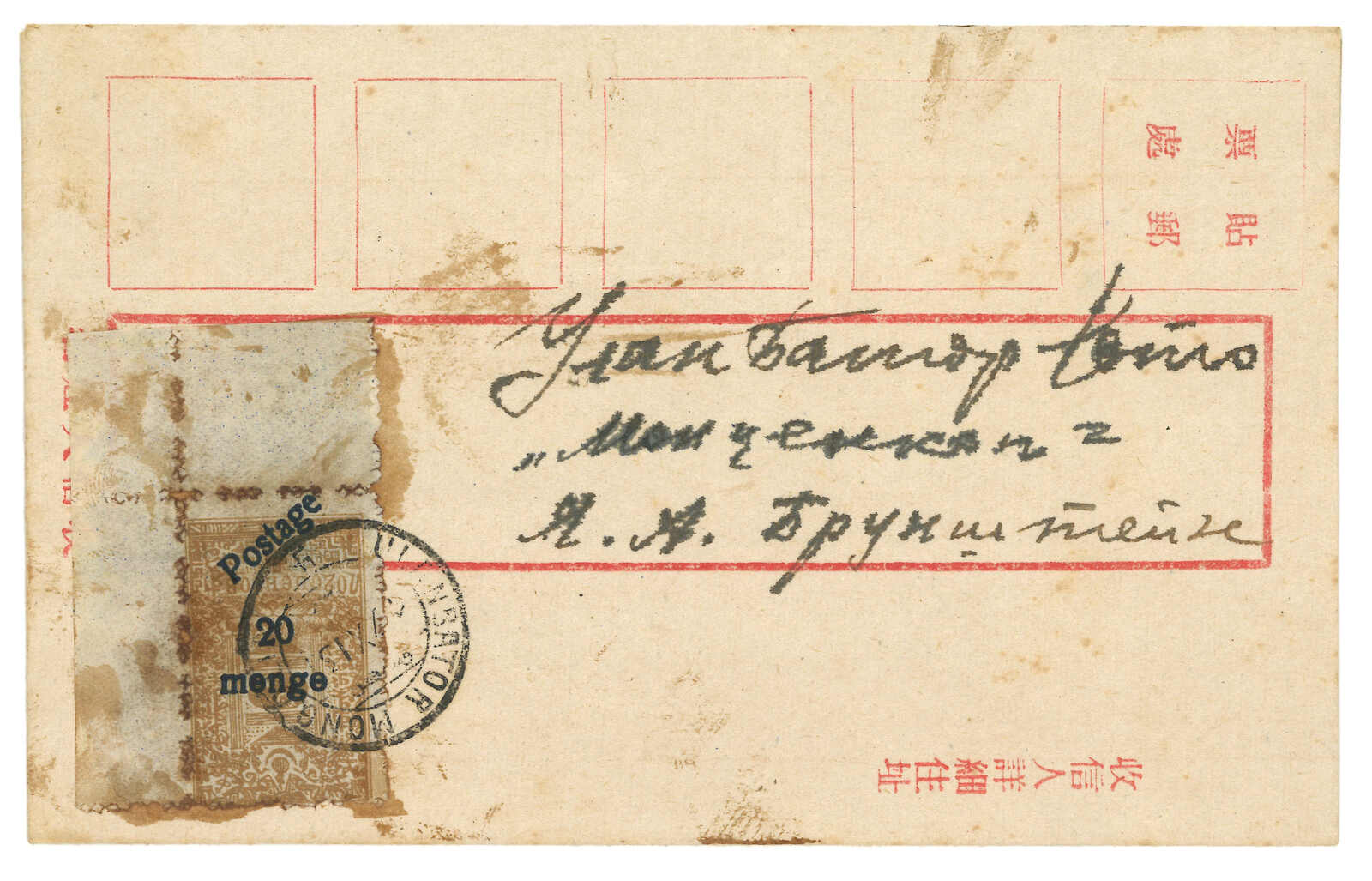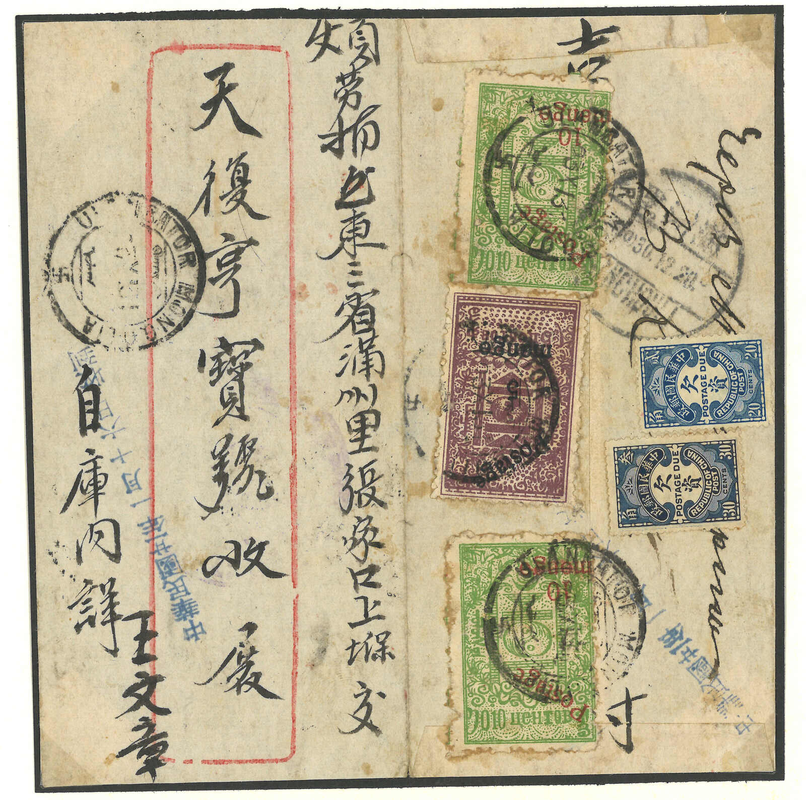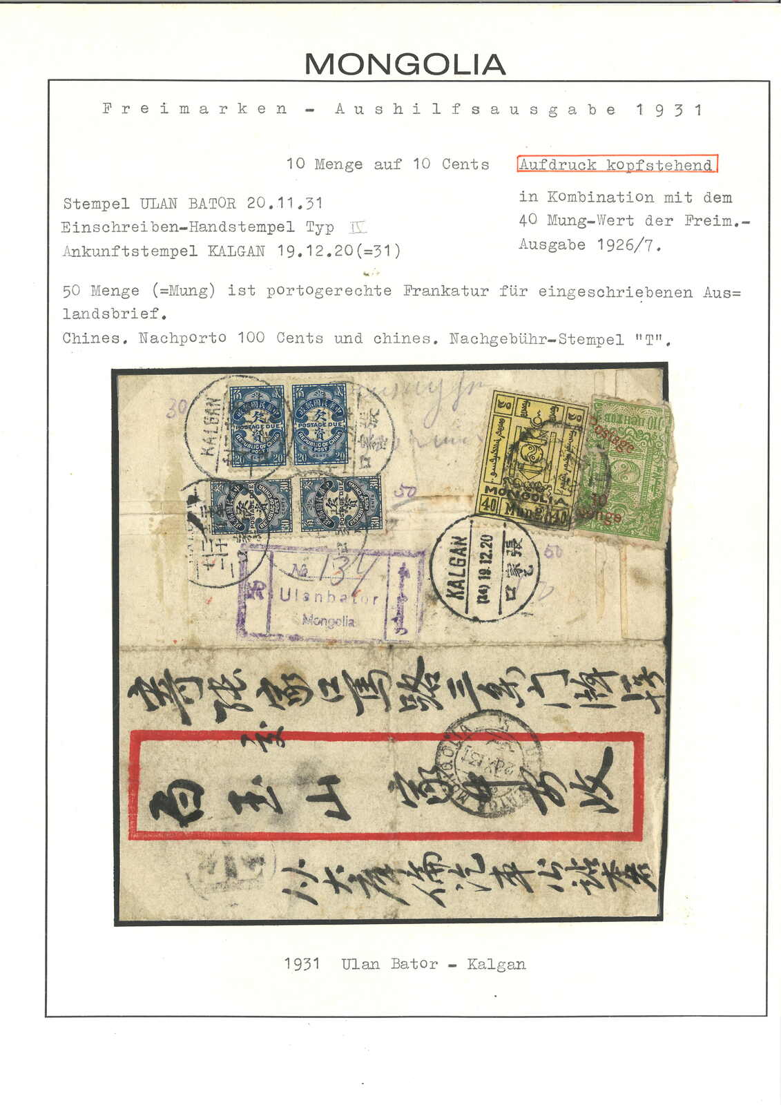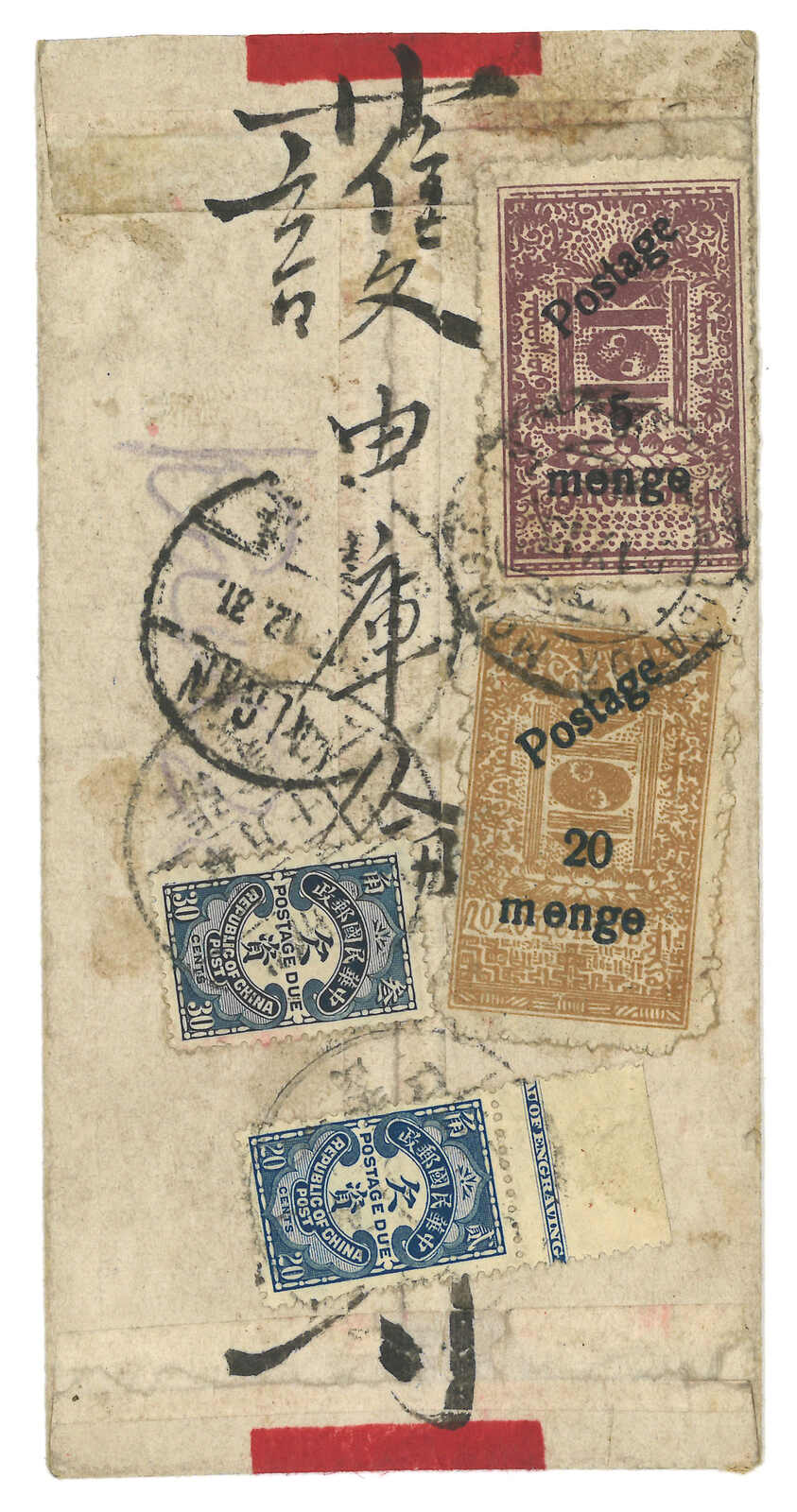 menge帶加蓋倒蓋變異,銷烏蘭巴托日戳,旁鈐掛號章。加貼民國欠資票2角雙連 + 3角雙連,銷張家口12.20到達戳。封剖開以作展示。第三版票與改值menge票混貼十分稀罕少見。(Image 1)