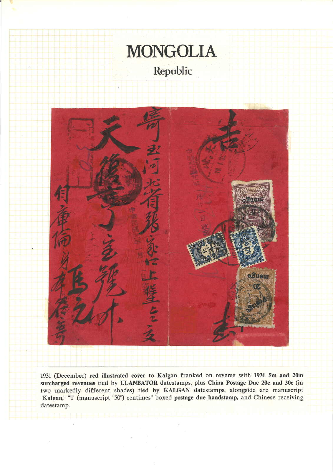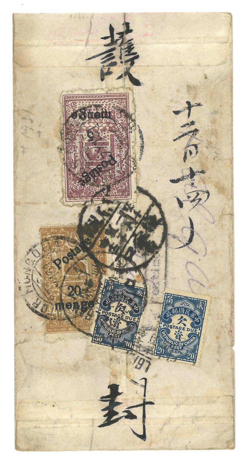 1931 Ulanbator (32 Oct; presumably intend to be 22 Oct) to Kalgan. Chinese style cover, f.w. imperforated revenue stamp surch 5 menge + 1 dropped stamp, tied by Ulanbator cds. In combination with ROC postage due 20c + 30c, tied