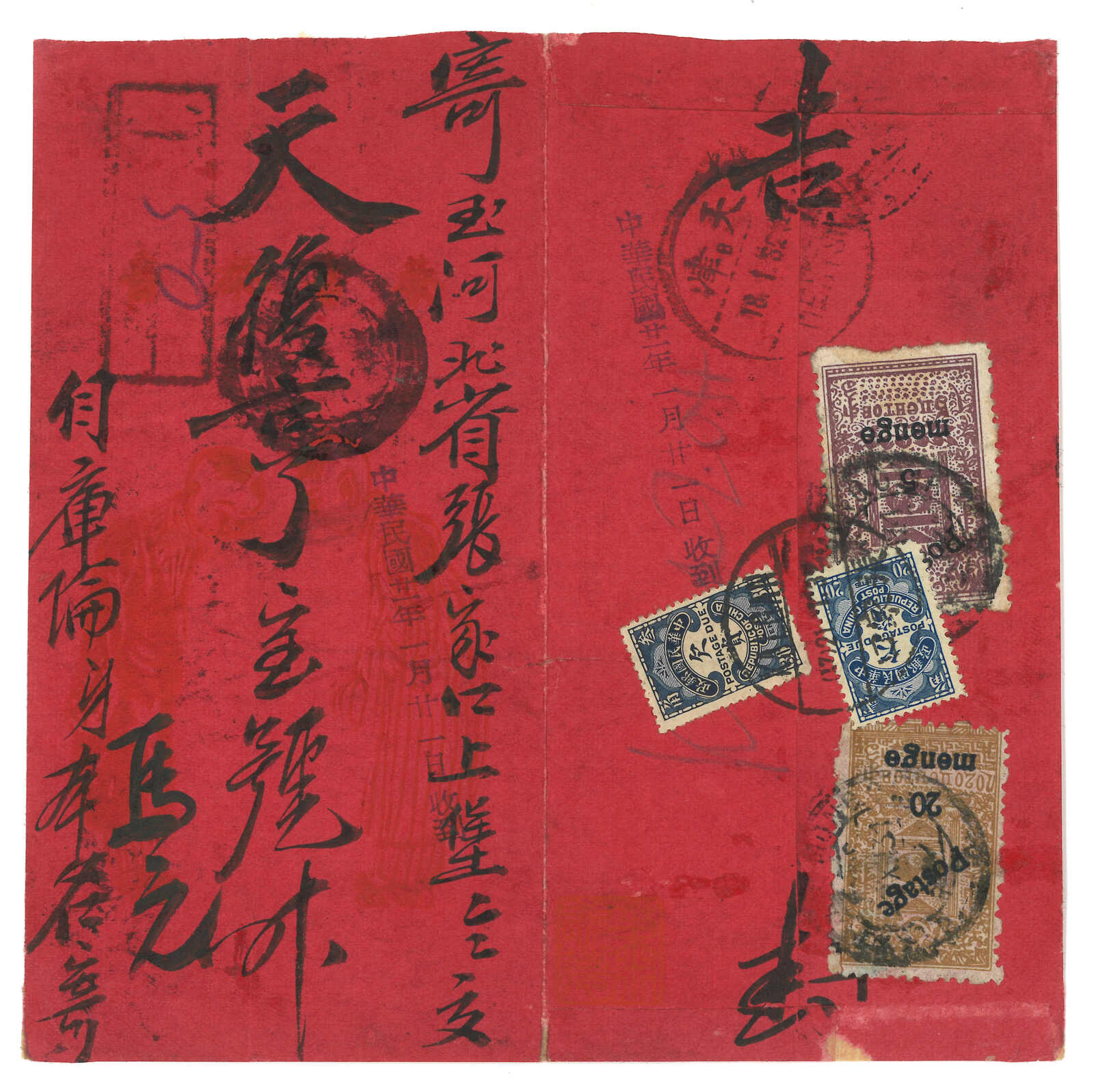 1931 Ulanbator (25 Nov) to Kalgan. Chinese style cover, f.w. revenue stamp surch 5 menge + 20 menge, tied by Ulanbator cds. In combination with ROC postage due 20c + 30c, tied by Kalgan (22 Dec) arrival cds. Cover opened out