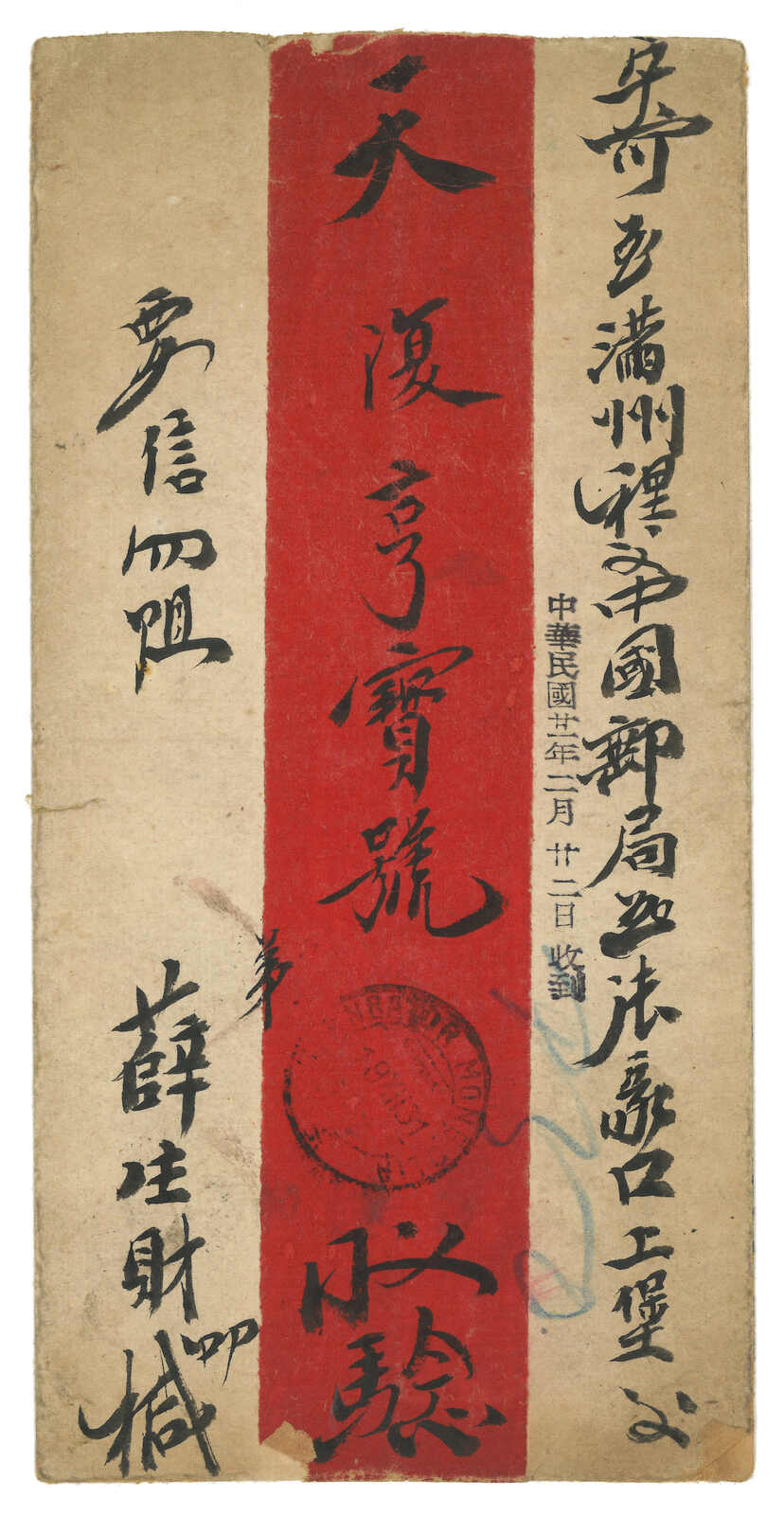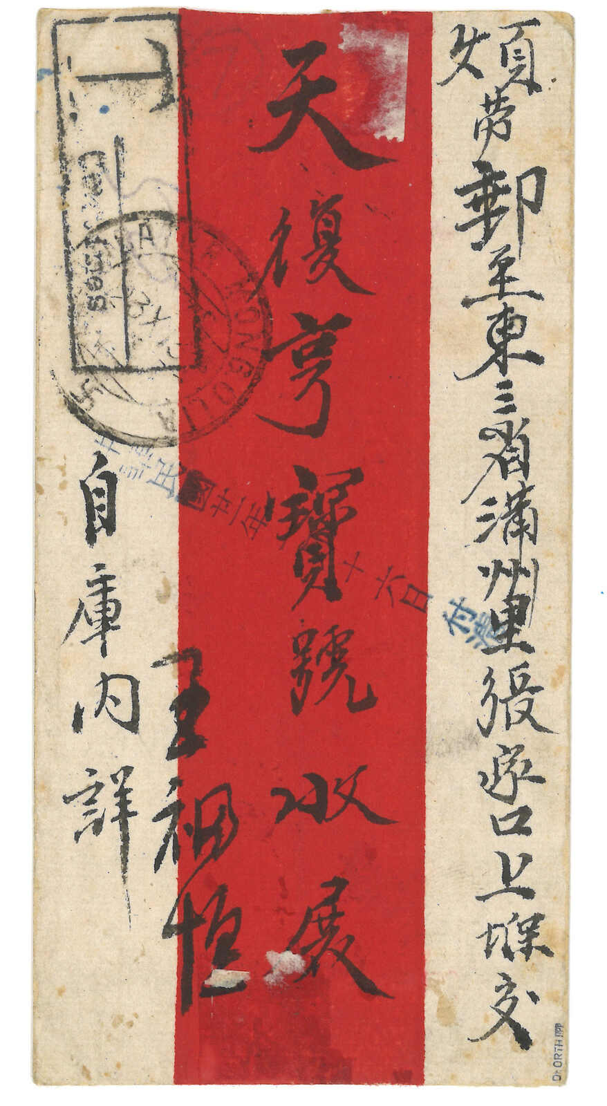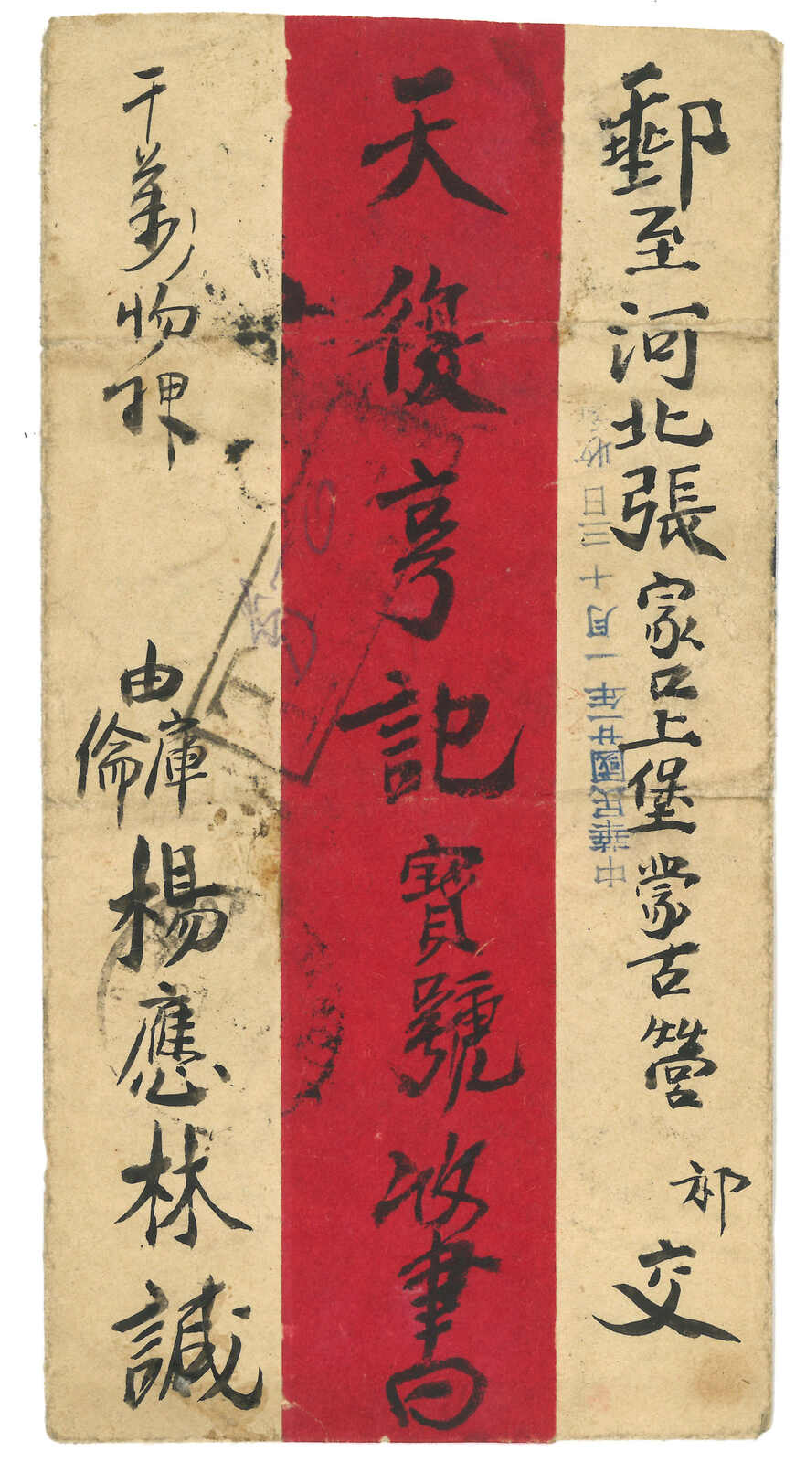 1931 Ulanbator (14 Dec) to Kalgan. Red band cover, f.w. unovpt. revenue stamp perforated 10c x2 + surch 5 menge on reverse, former uncancelled while latter tied by Ulanbator cds. Transit Manchouli (23 Dec). In combinatino with