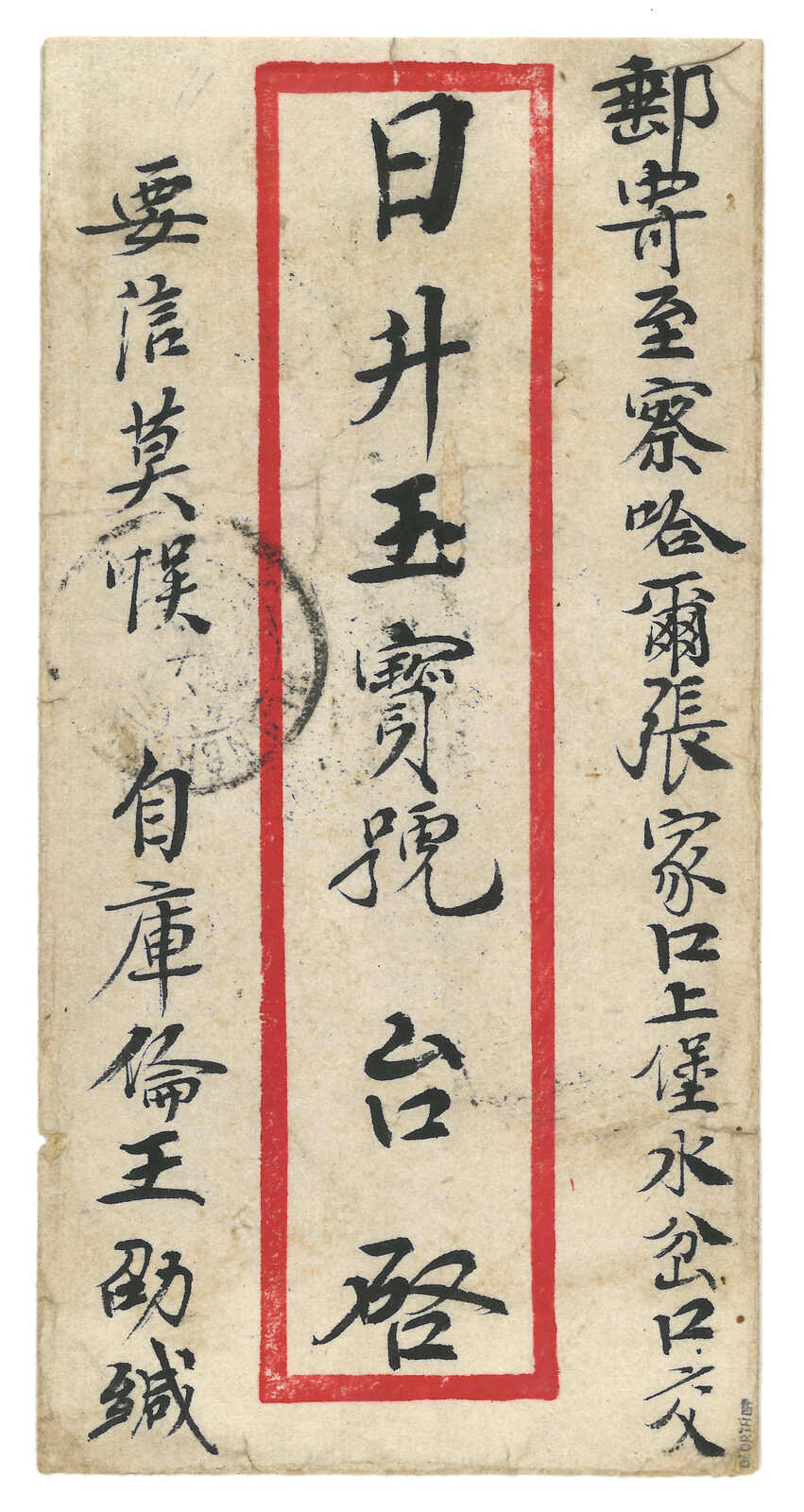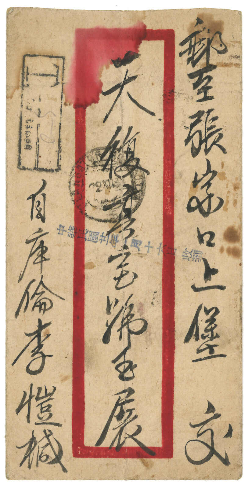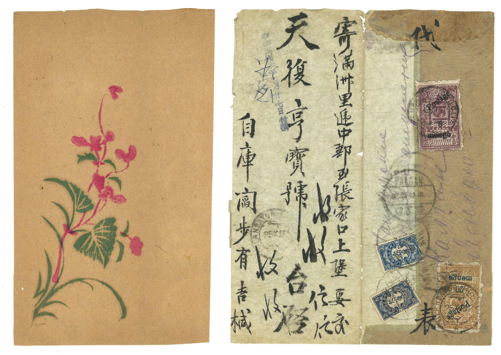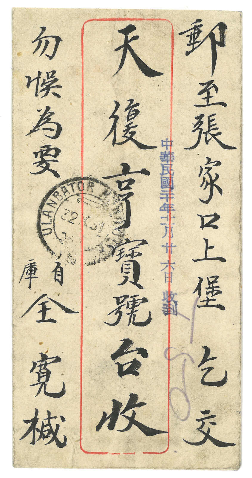 1931.11.25 烏蘭巴托寄張家口。中式封,背貼印花稅票改值5 menge + 20 menge,銷烏蘭巴托日戳。加貼民國欠資票2角 + 3角,銷張家口12.22到達戳。地址表紙與手繪圖案封身分離。(Image 1)