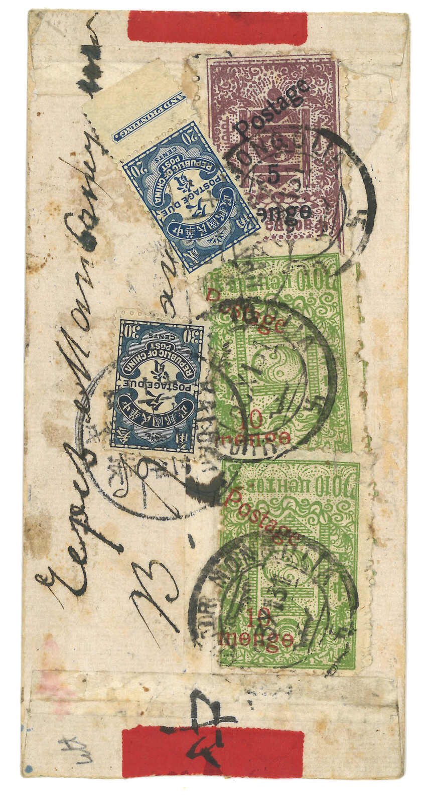 1931.10.19 烏蘭巴托寄北平。紅條封,背貼印花稅票加蓋Postag 10分橫雙連 + 無齒改值5 menge,銷烏蘭巴托日戳。旁鈐欠資章。加貼民國欠資票1角直三連,銷北平11.6到達戳。混貼加蓋Postag及menge票本已出色,無齒5