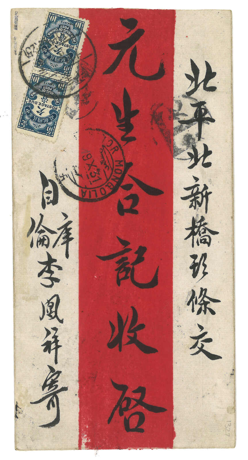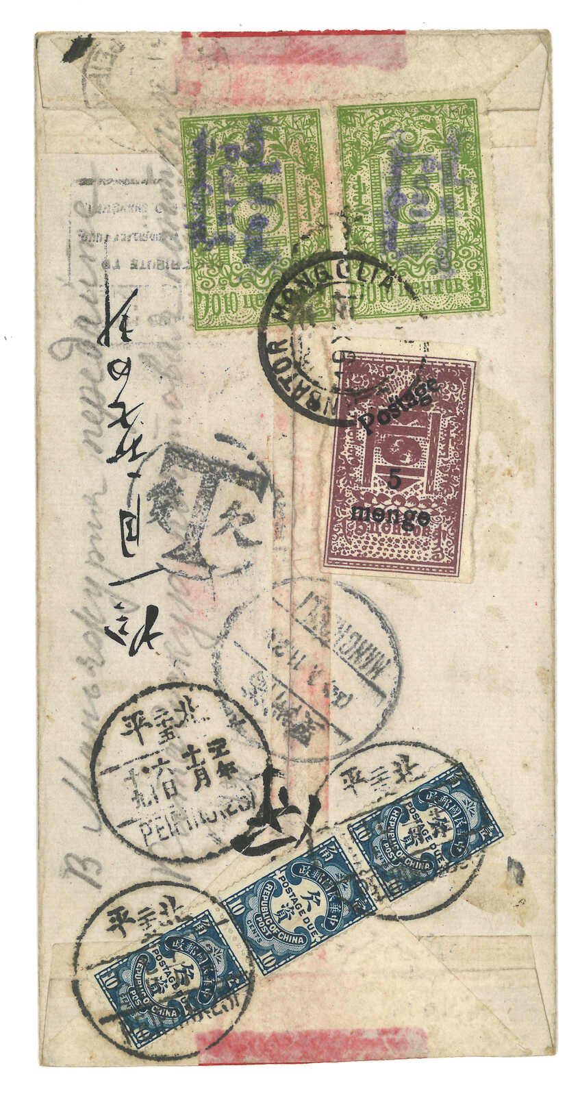 1931 Ulanbator (19 Oct) to Peiping. Red band cover, f.w. Revenue stamp ovpt. Postag 10c in horizontal pair + imperf surch 5 menge on reverse, tied by Ulanabtor cds. Alongside with T mark, In combination with ROC postage due 10c