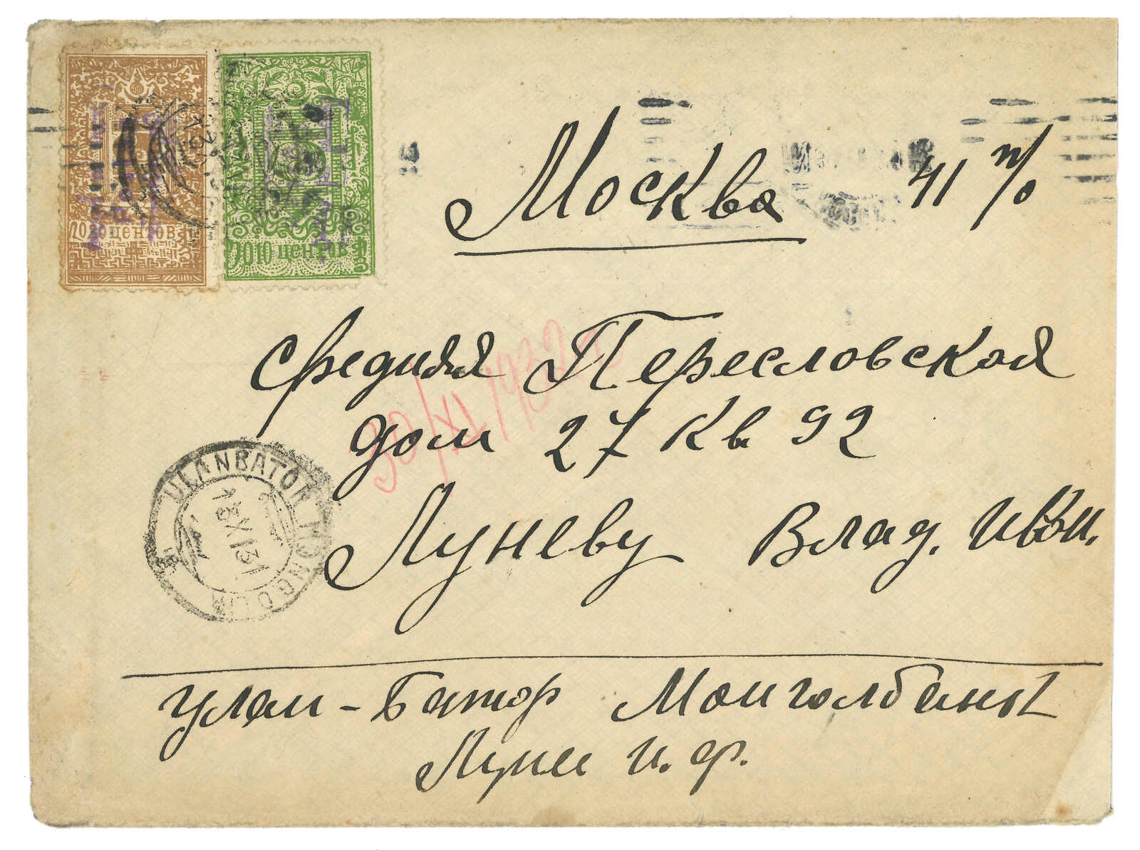1931 Ulanbator (13 Nov) to Moscow, f.w. Revenue stamp ovpt. Postag 10c + 20c with inverted ovpt variety on reverse, tied by Ulanbator cds. Arrived Moscow (30 Nov). Inverted varieties are very scarce on surch Postag issues. This