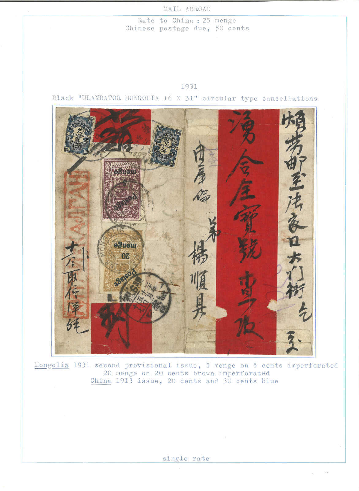 1931.10.16 烏蘭巴托寄張家口。紅條封,背貼無齒印花稅票改值5 menge + 20 menge,銷烏蘭巴托日戳。加貼民國欠資票2角 + 3角,銷張家口11.8日戳。封剖開以作展示。Hellrigl所記錄7件貼用改值menge無齒票的封片之一。(Image 1)