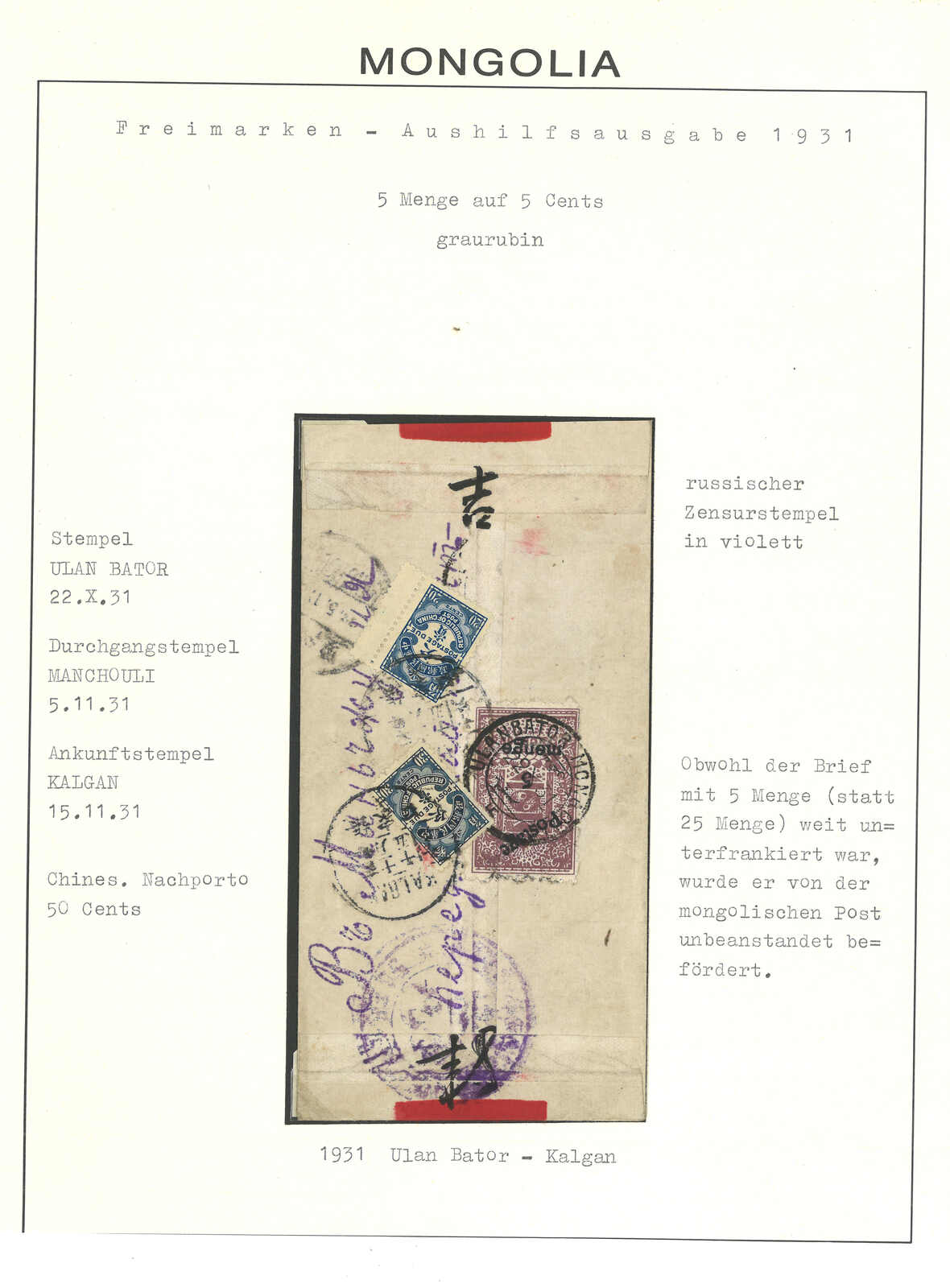 1931 Ulanbator (22 Oct) to Kalgan. Red band cover, f.w. revenue stamp surch 5 menge + 1 dropped stamp on reverse, tied by Ulanbator cds. Alongside with censor mark. Transit Manchouli (15 Nov). In combination with ROC postage