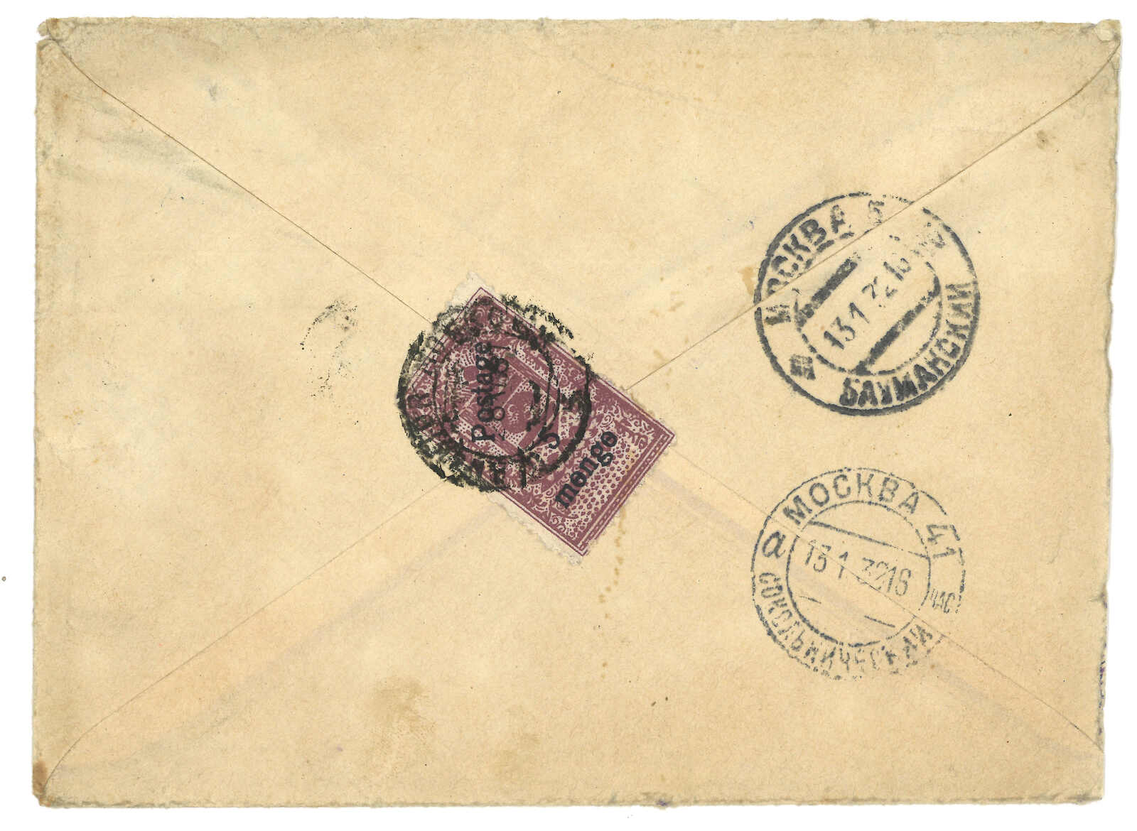 1931.11 烏蘭巴托寄莫斯科。掛號封,正貼印花稅票加蓋“Postag”10分x3 + 20分x2,背貼改值5 menge,銷烏蘭巴托日戳,旁鈐掛號章。1.13抵莫斯科。(Image 1)
