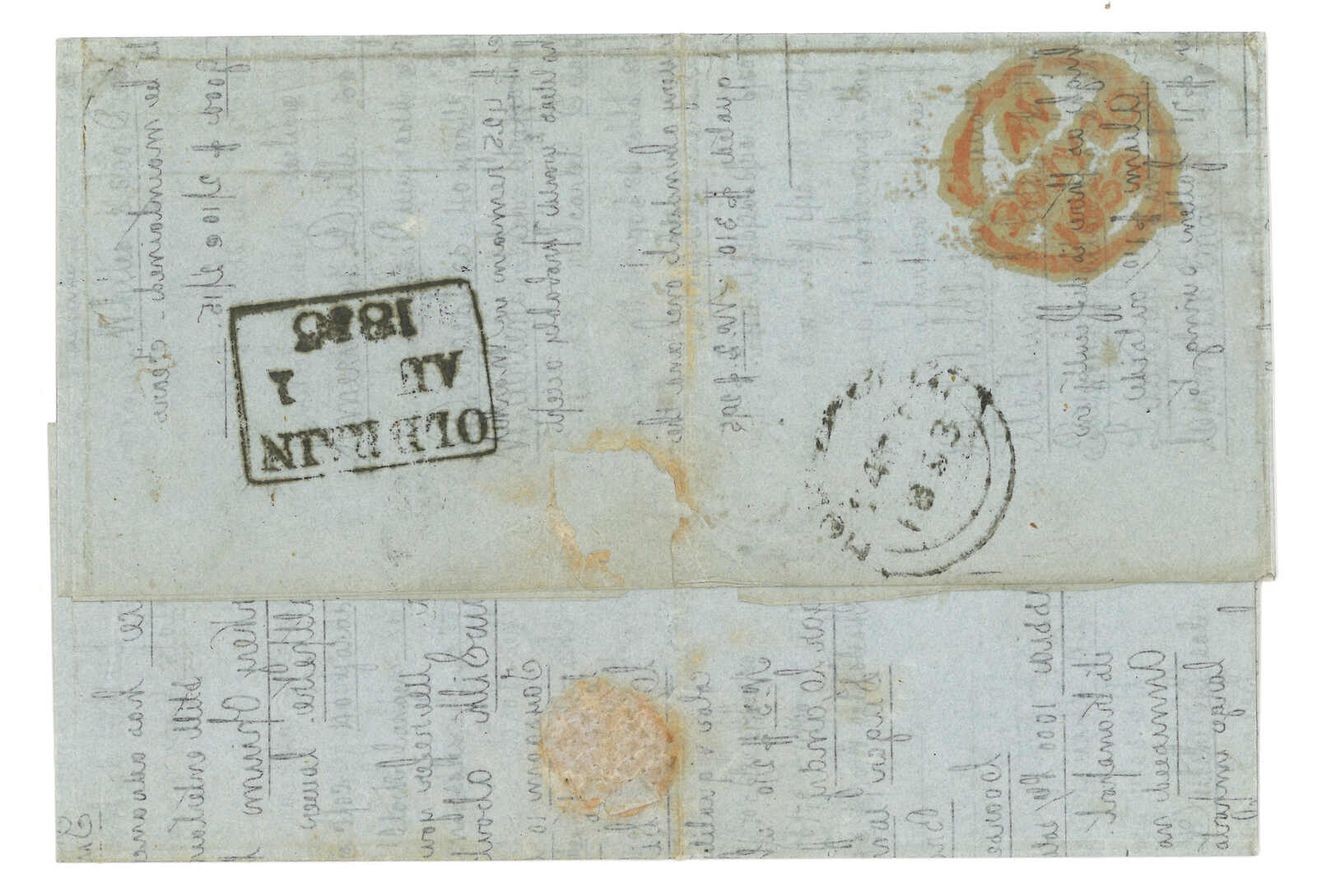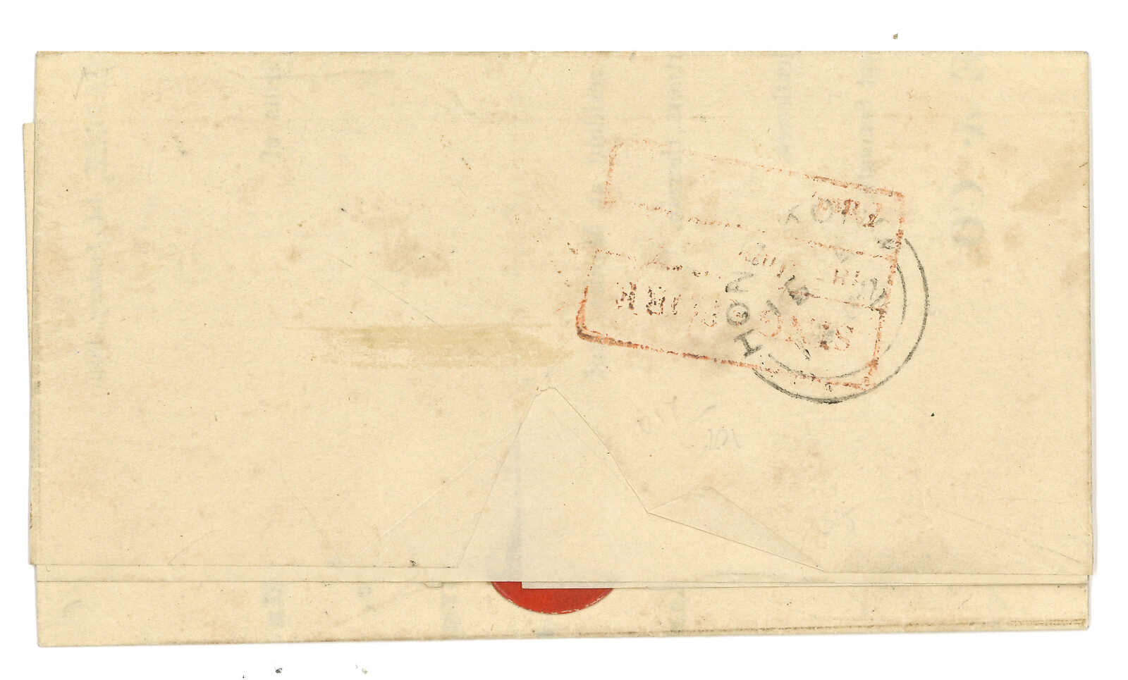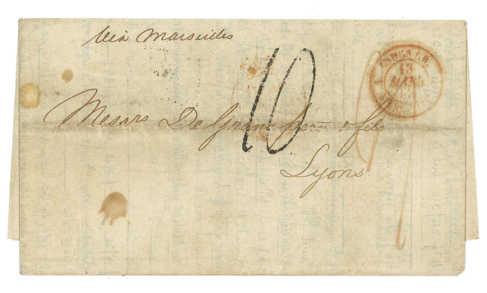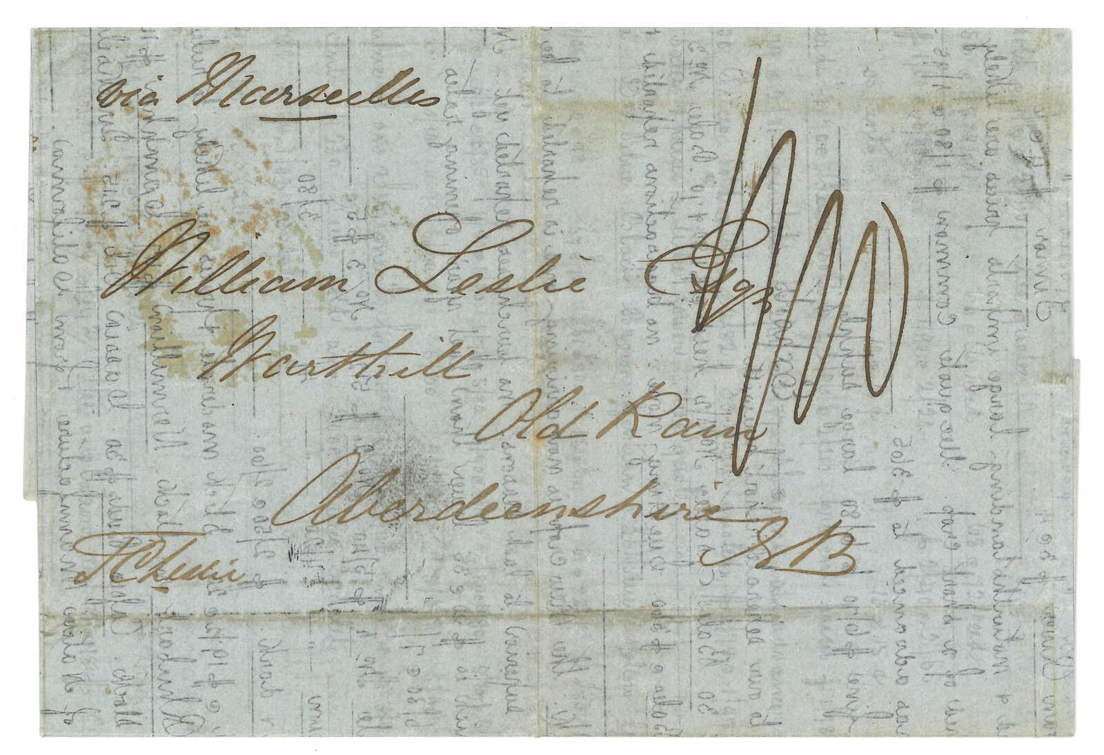 1853 Russell & Co., Canton (22 May) to William Leslie, Scotland. Entire letter, sent “via Marseilles” and rated “1/10”, applied with Hong Kong (24 May) transit cds. Transit London (30 Jul). Arrived Oldrain (1 Aug). This