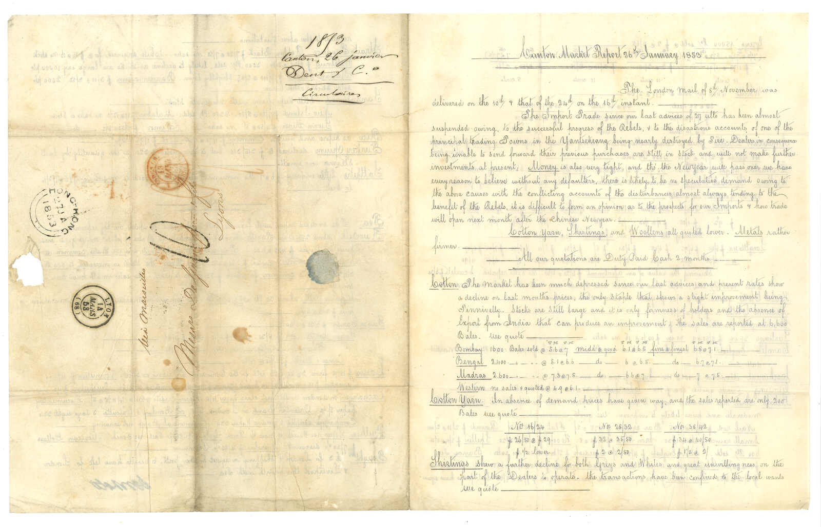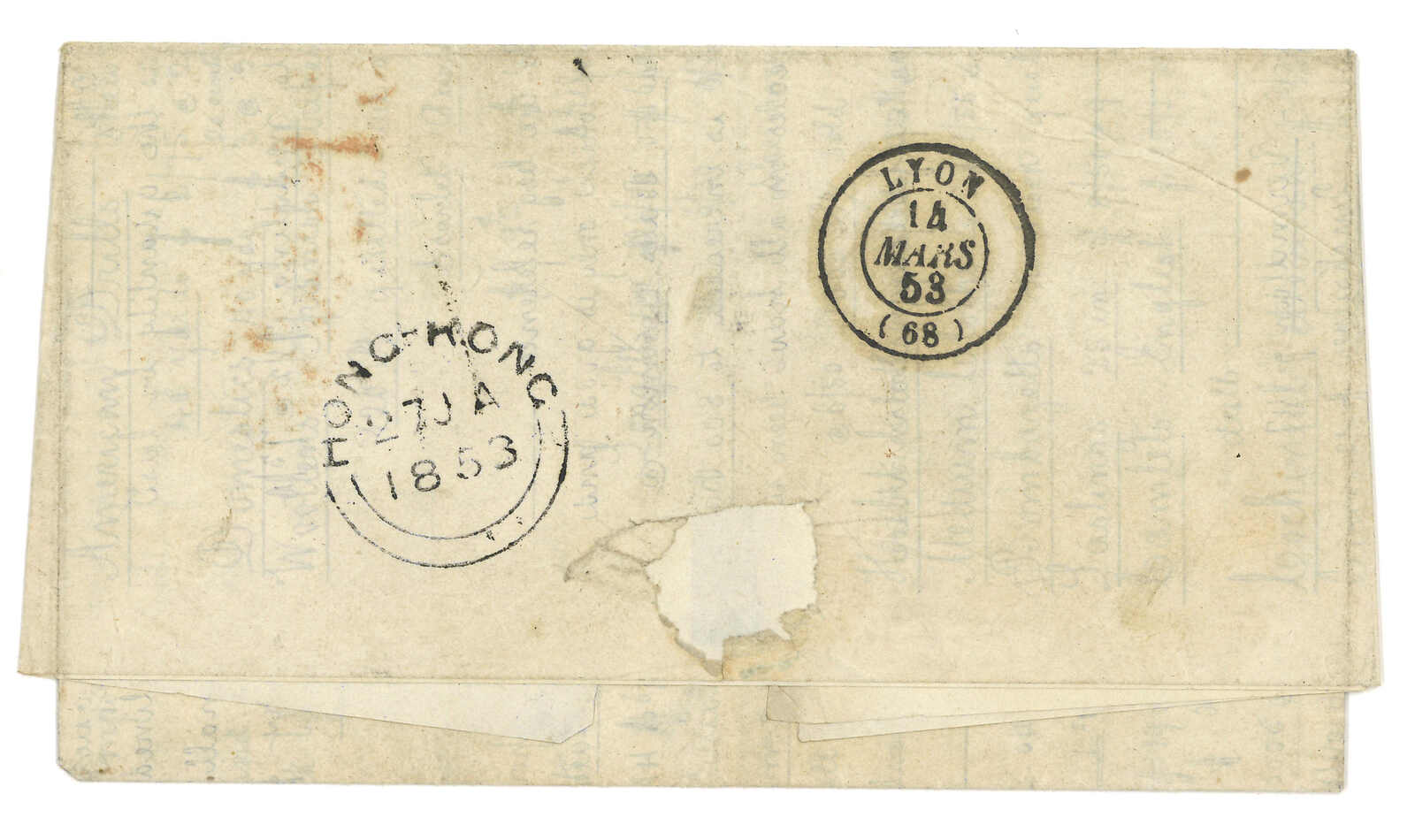 1853 (26 Jan) “Canton Market Report” entire letter to France via Hong Kong, sent “via Marseilles” and rated “10”, with small crowned “PAID AT HONG KONG” Webb type 11 h.s and Hong Kong double-arc cds. Arrived Lyon (14 Mar).