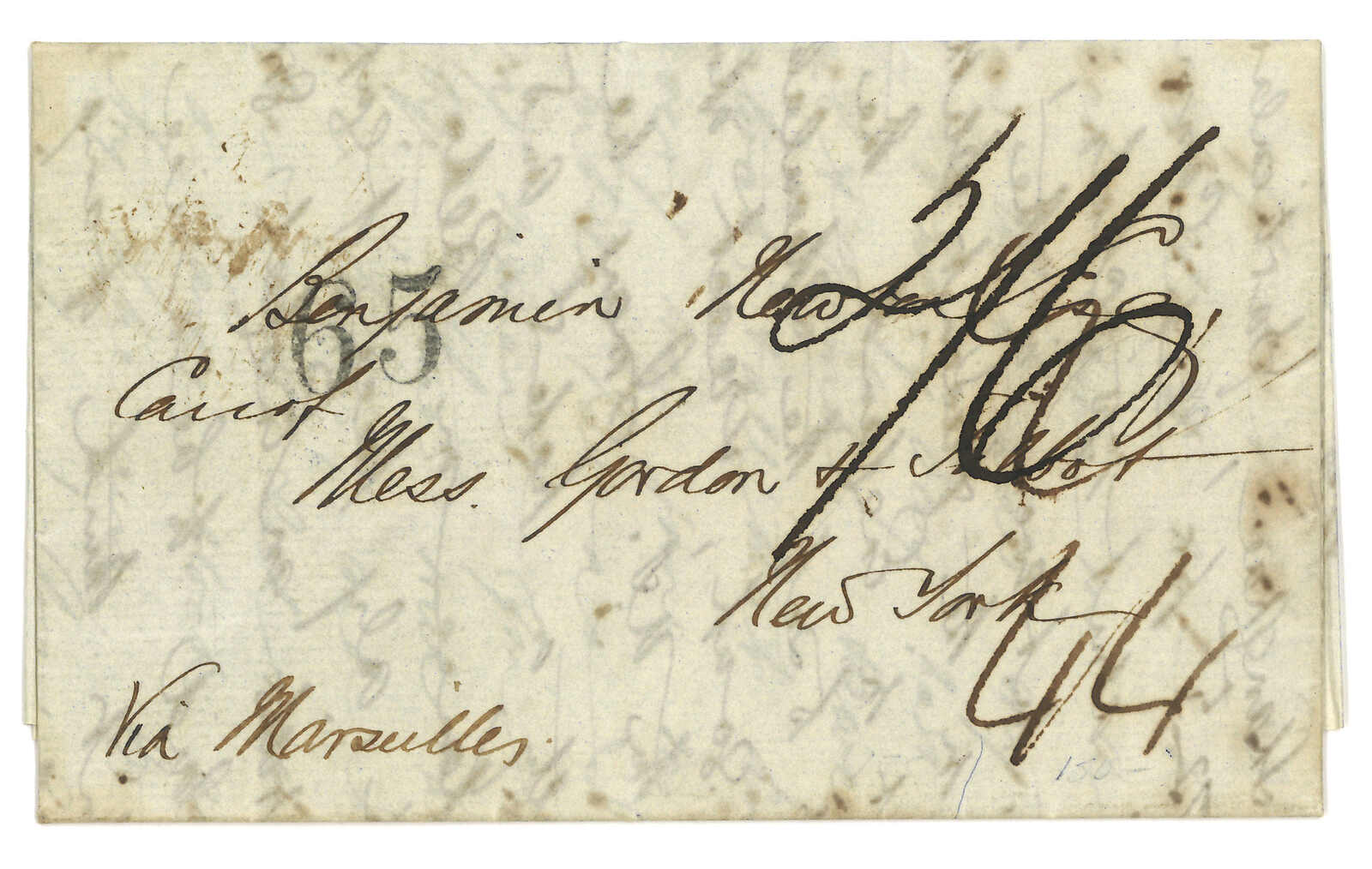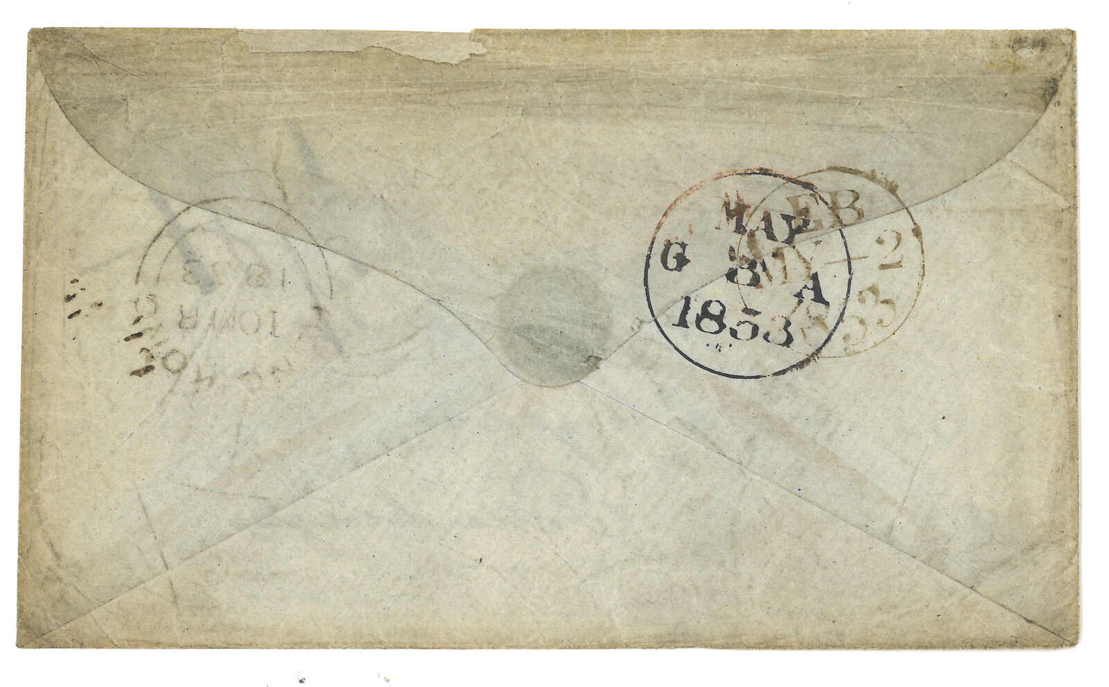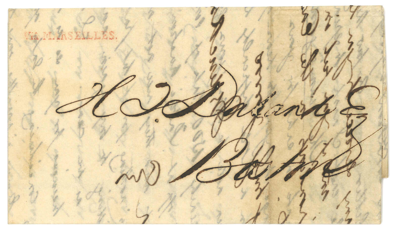 1853 Canton (8 Feb) to USA, sent “VIA MARSEILLES”. No postmark as this mail was carried privately.