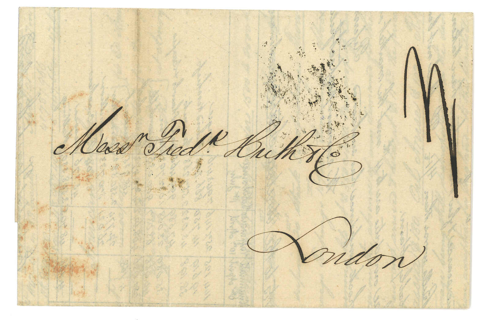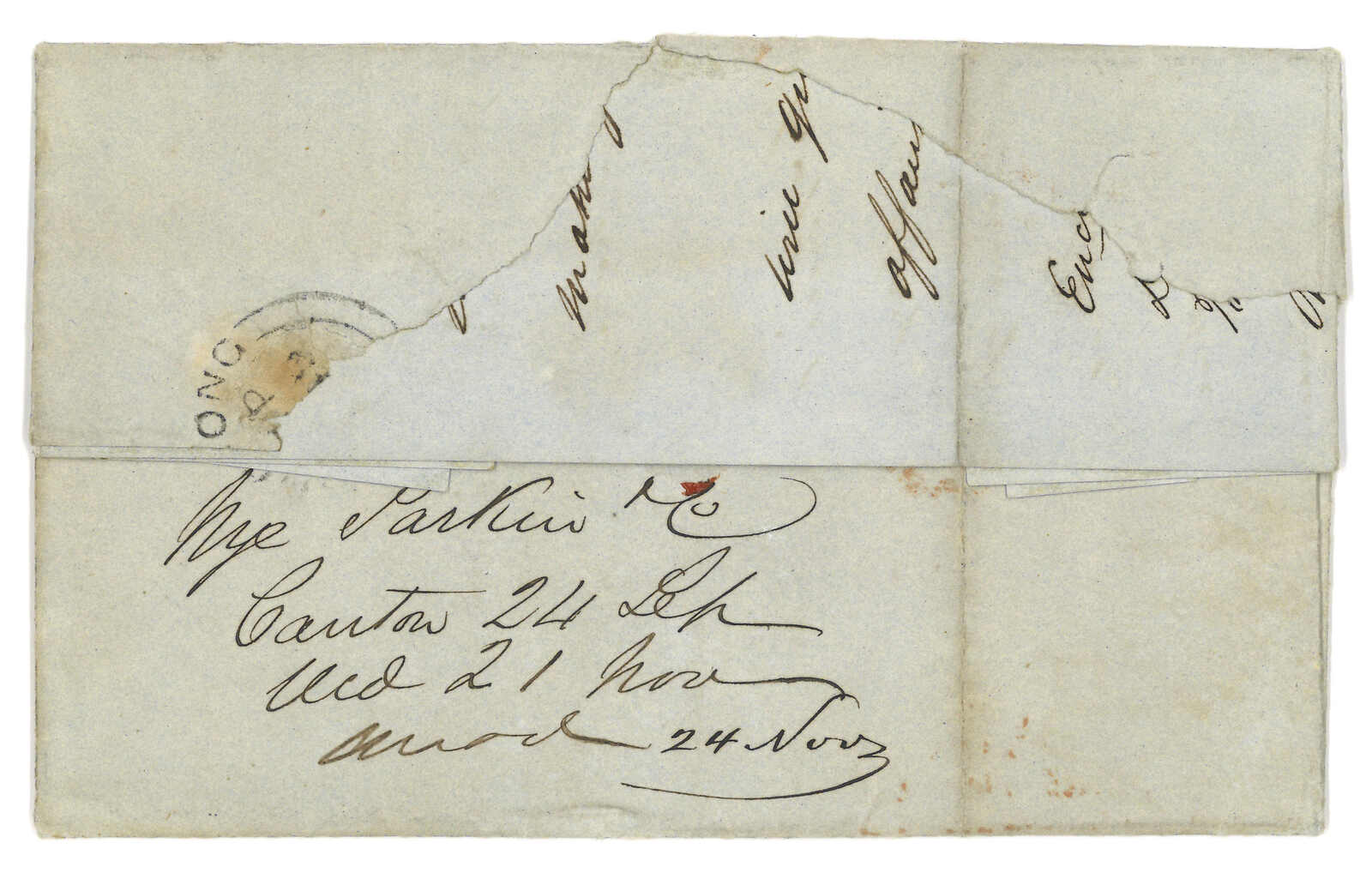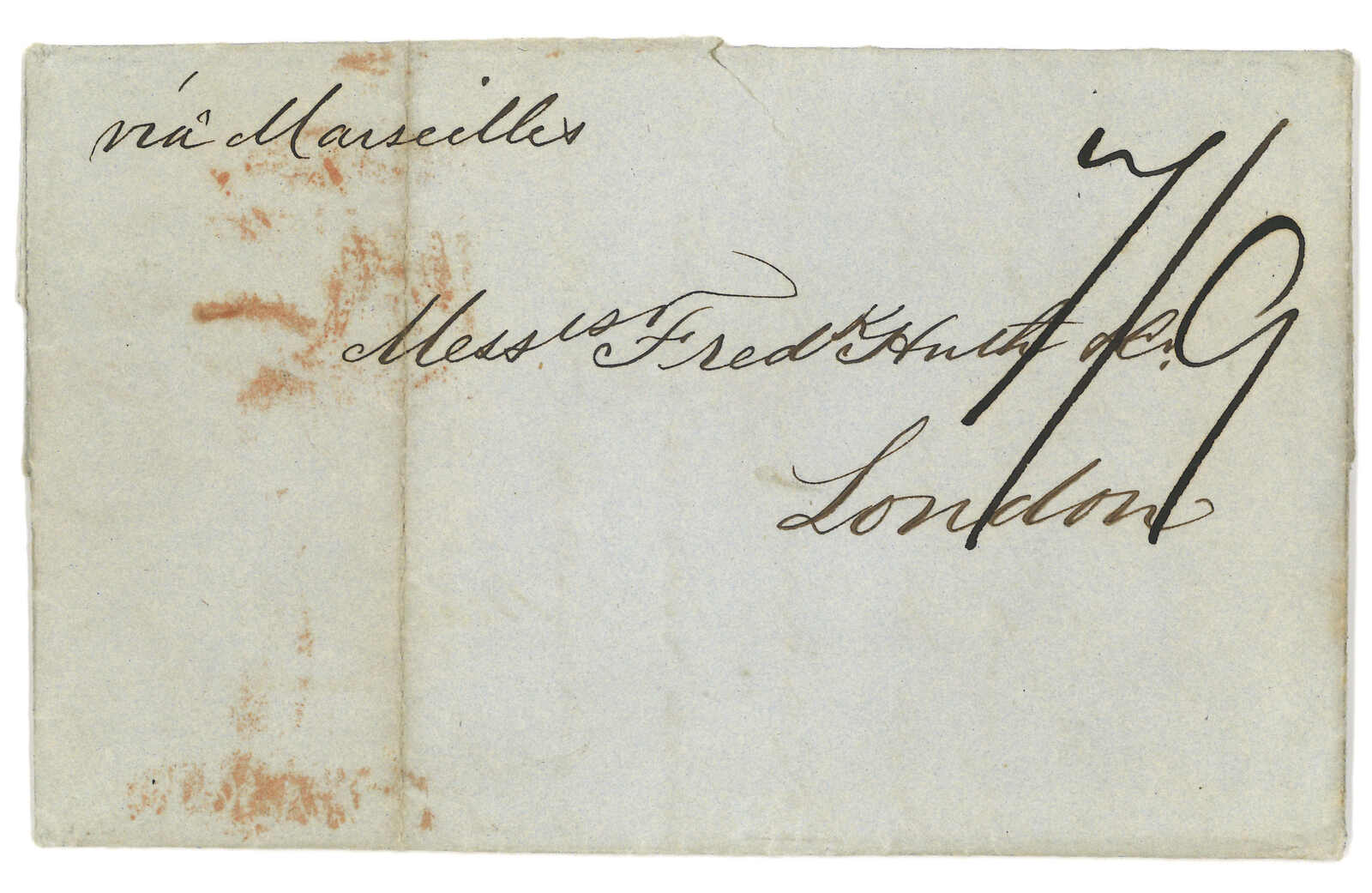 1849.9.24 廣州寄倫敦Frederick Huth & Co.。郵簡,寫有“via Marseilles”及郵資“7/9”,鈐香港9.28雙弧日戳。高郵資例子。此封經Achilles、Haddington、Ripon及Admiralty號送遞。(Image 1)