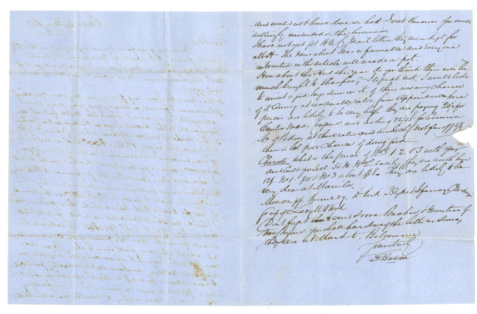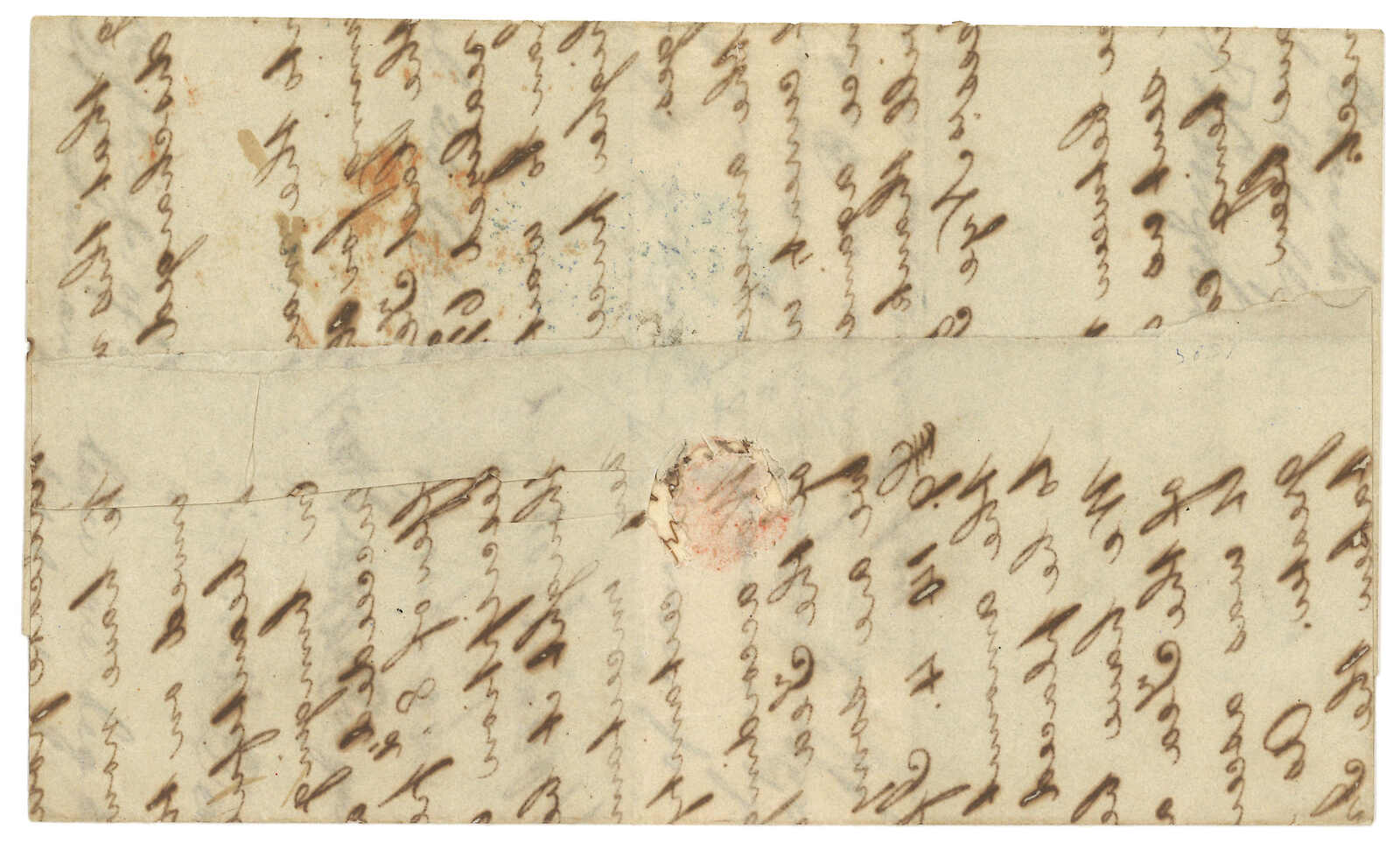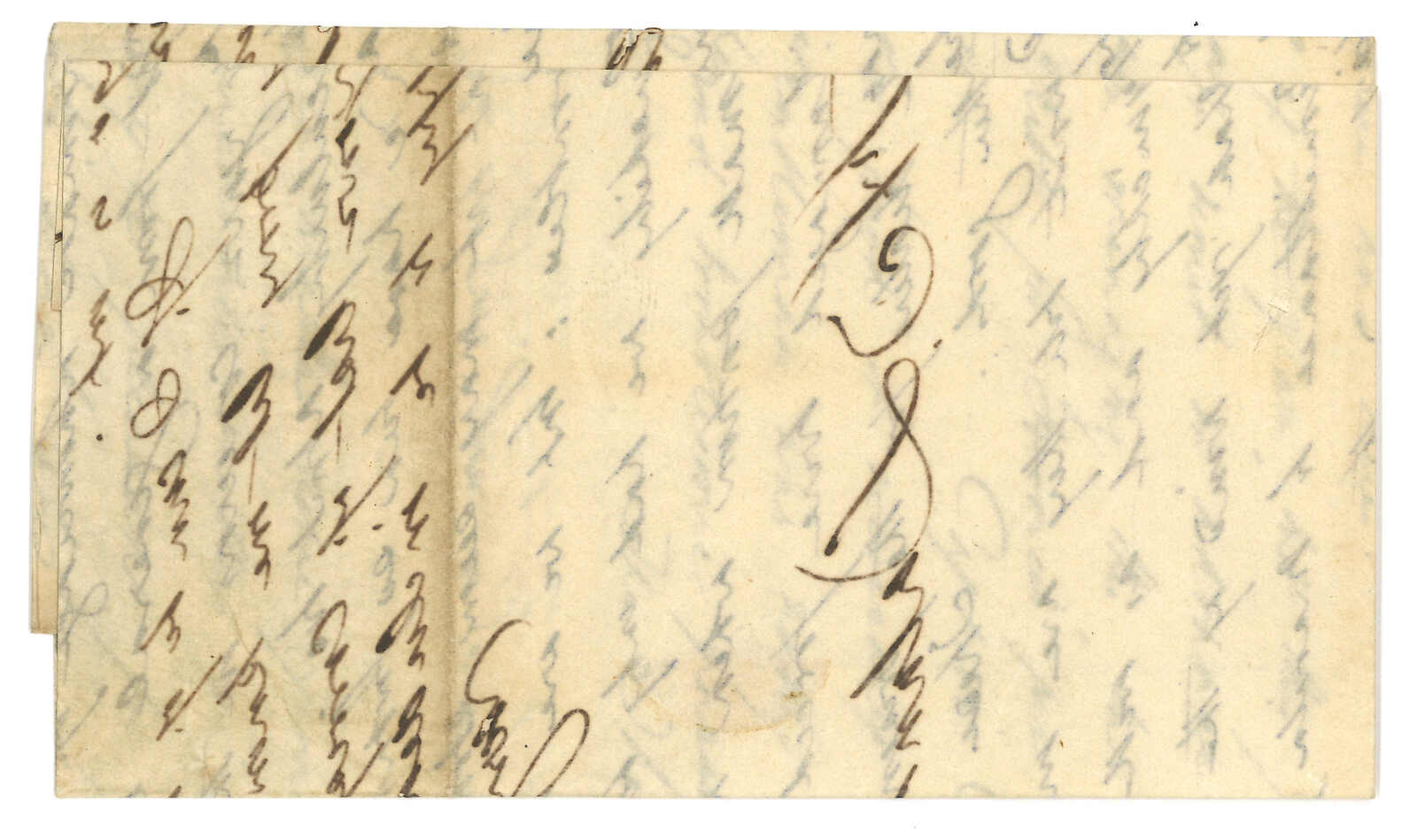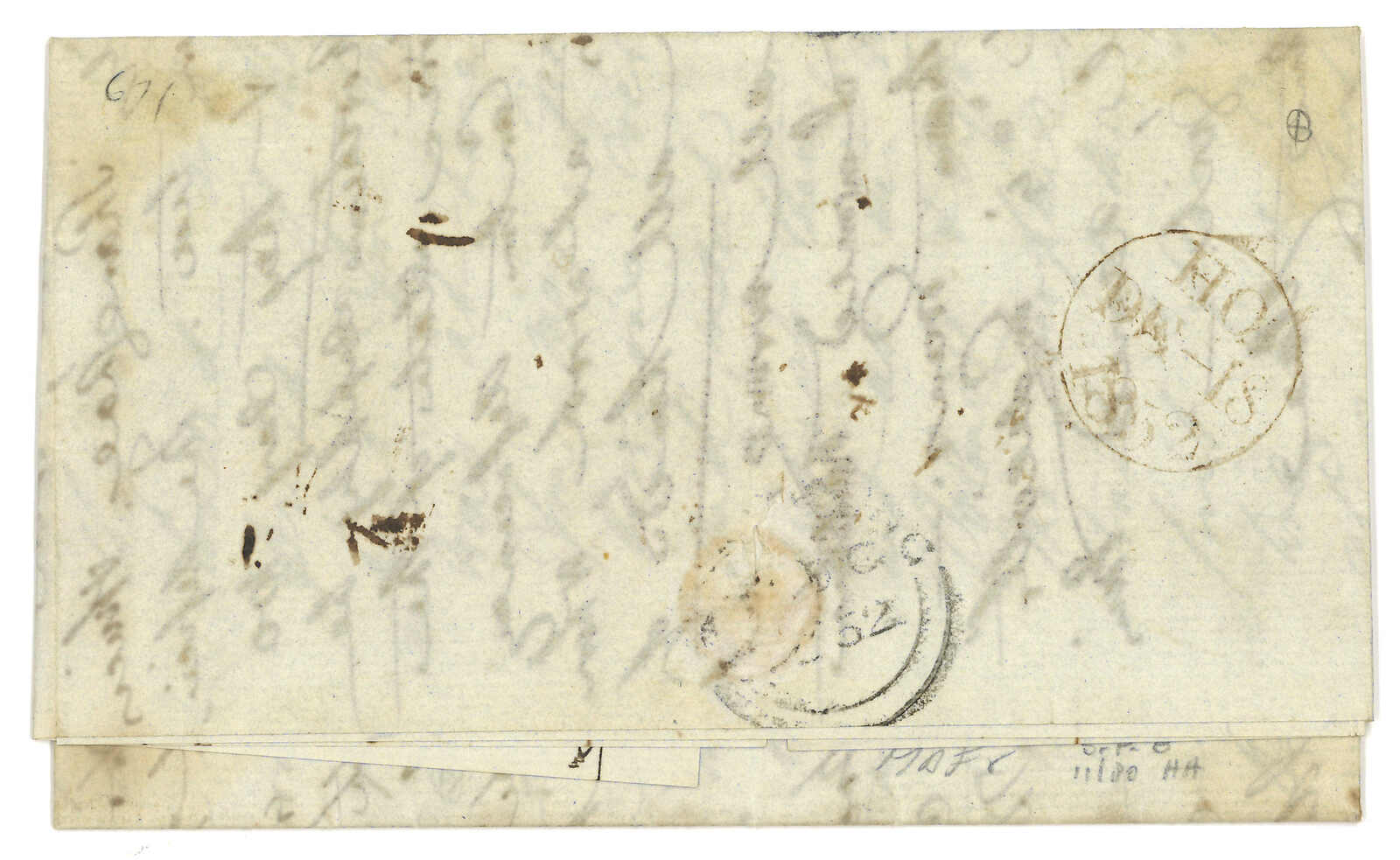 1849.9.24 廣州寄倫敦Frederick Huth & Co.。郵簡,寫有“via Marseilles”及郵資“7/9”,鈐香港9.28雙弧日戳。高郵資例子。此封經Achilles、Haddington、Ripon及Admiralty號送遞。(Image 1)