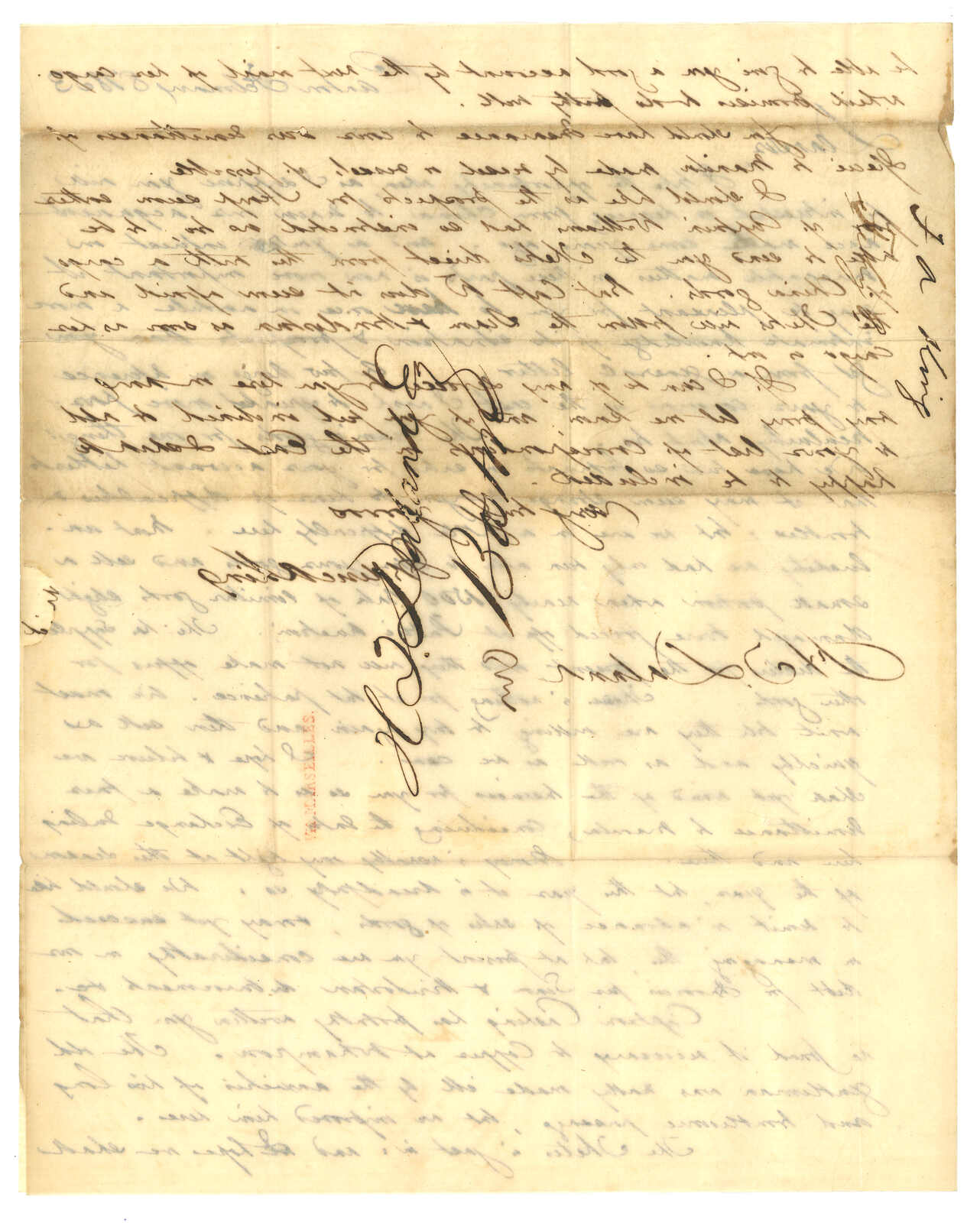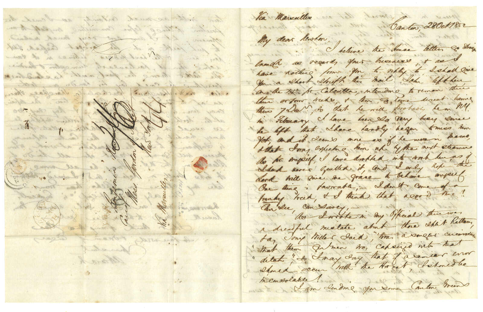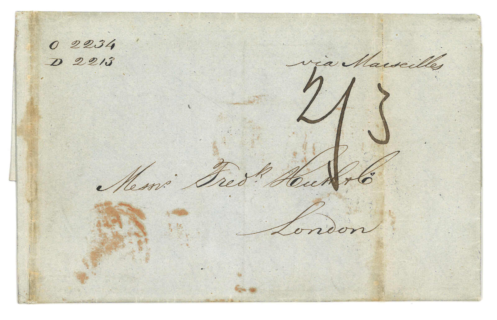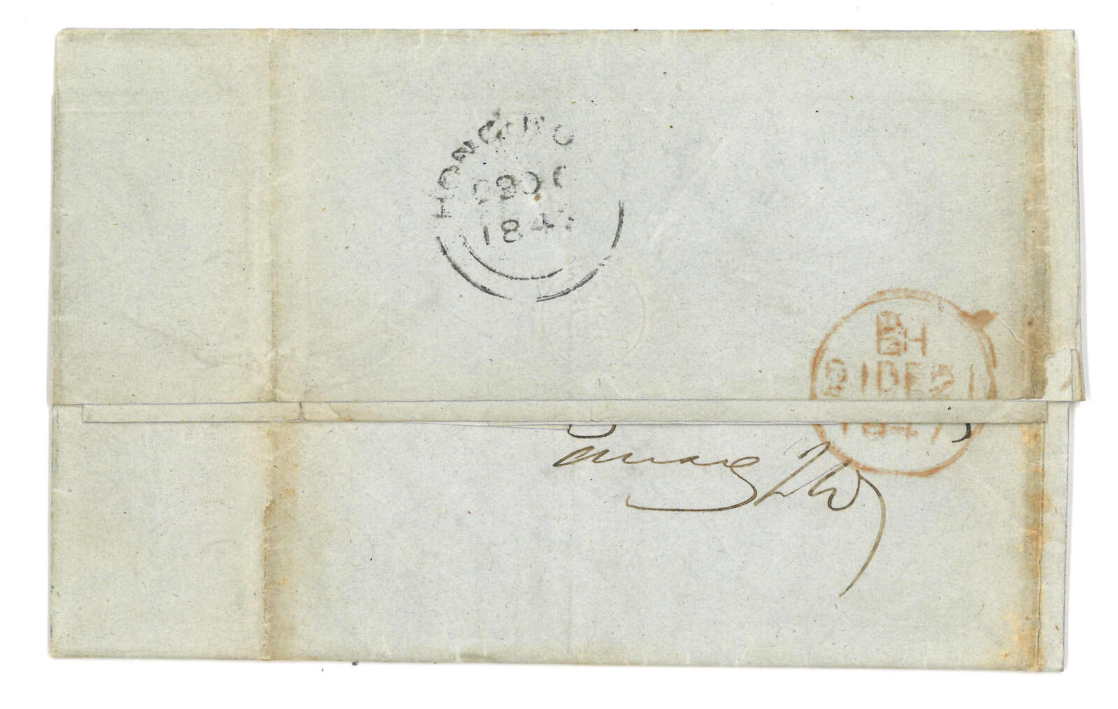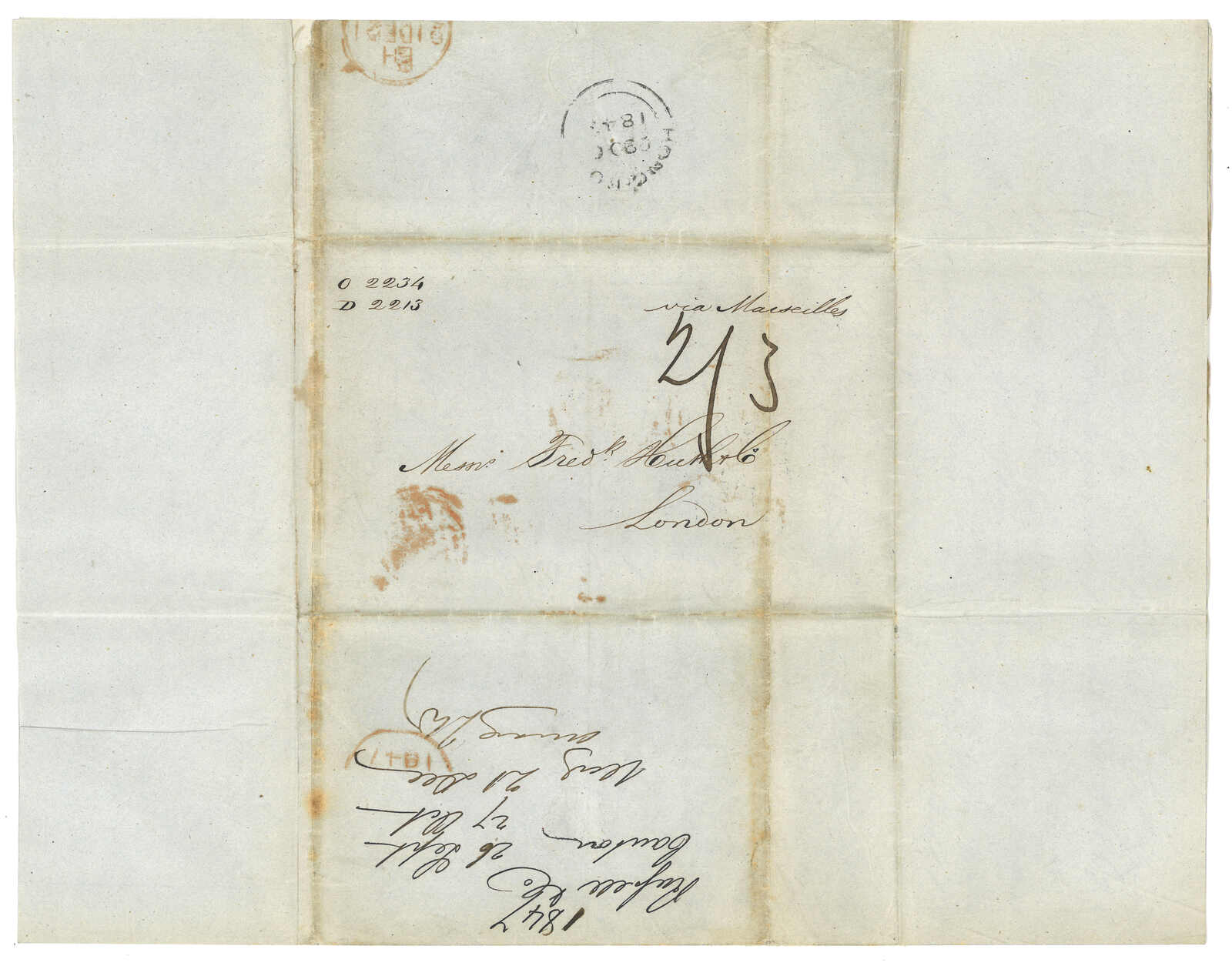 1847 Canton (27 Oct) to Frederick Huth & Co., London. Entire letter, sent “via Marseilles” and rated “2/3”, applied with Hong Kong (29 Oct) transit cds. Arrived London (22 Dec). This mail was carried by Lady Mary Wood,