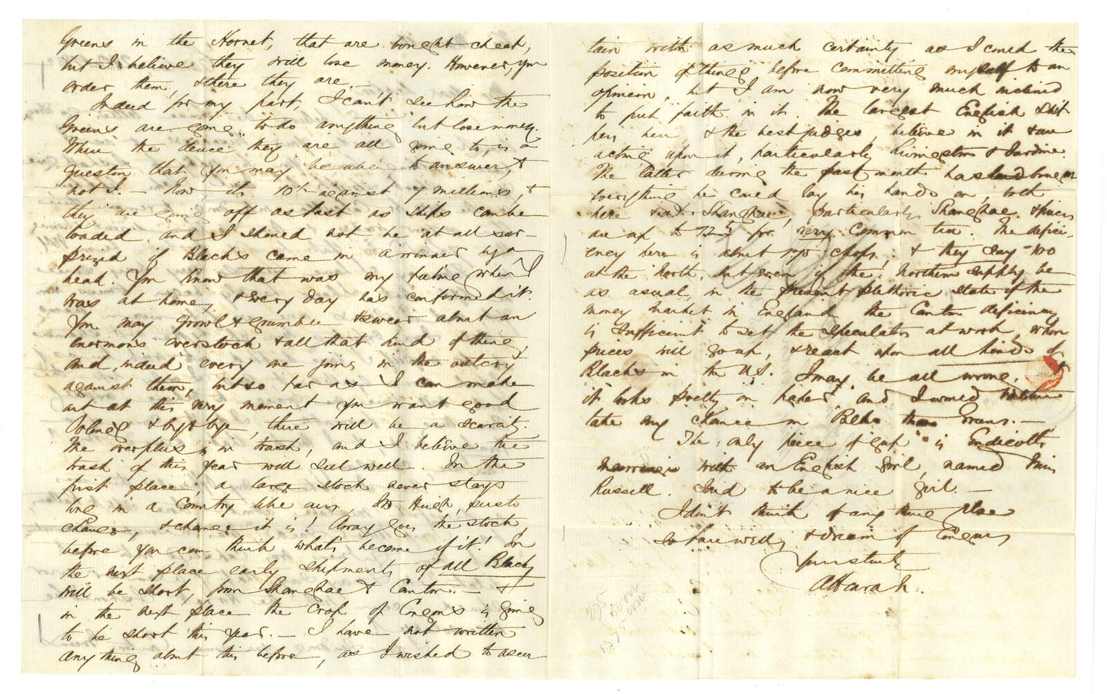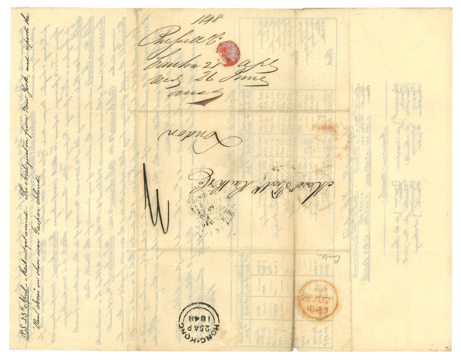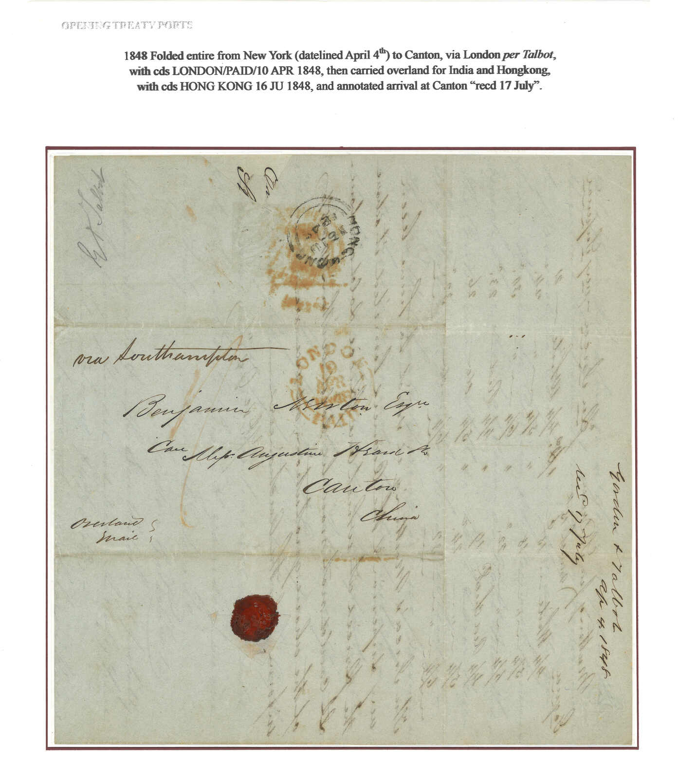 1848 USA (4 Apr) to Canton. Entire letter, sent “via Southampton”, applied with London transit cds (10 Apr). Further transit Hong Kong (16 Jun). Arrived Canton (17 Jul) according to annotation. Scarce pre-adhesive incoming