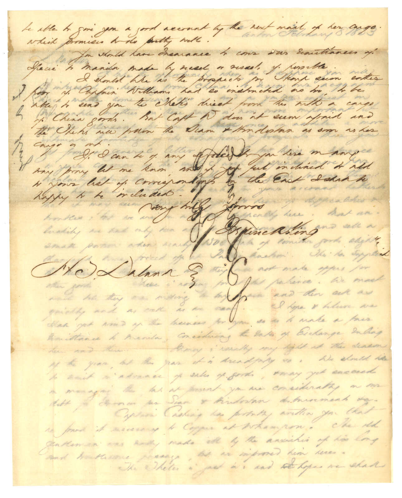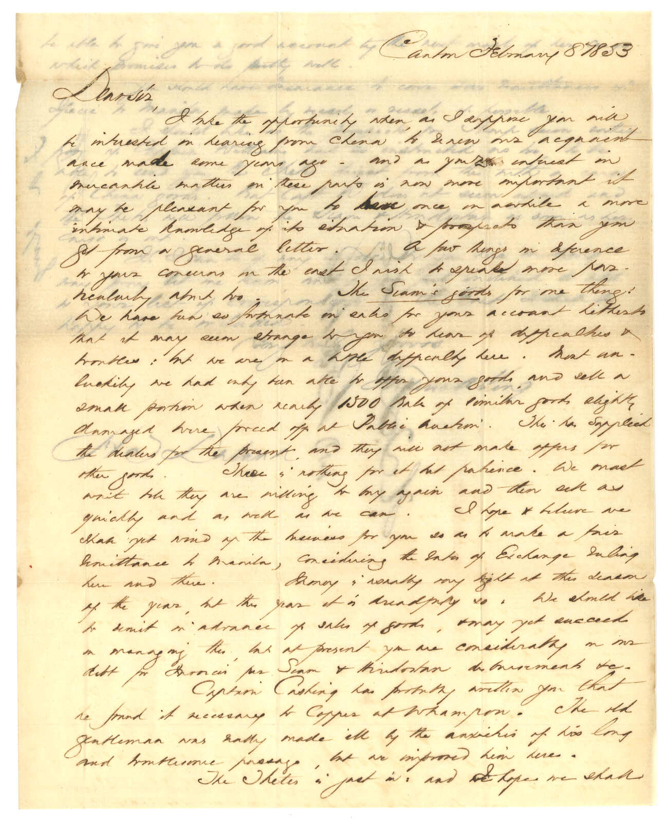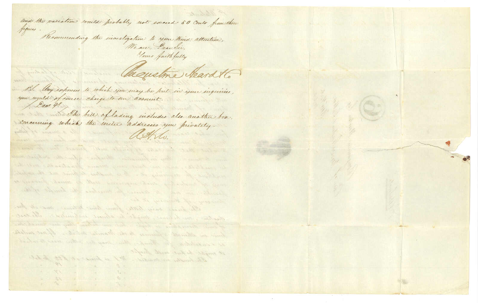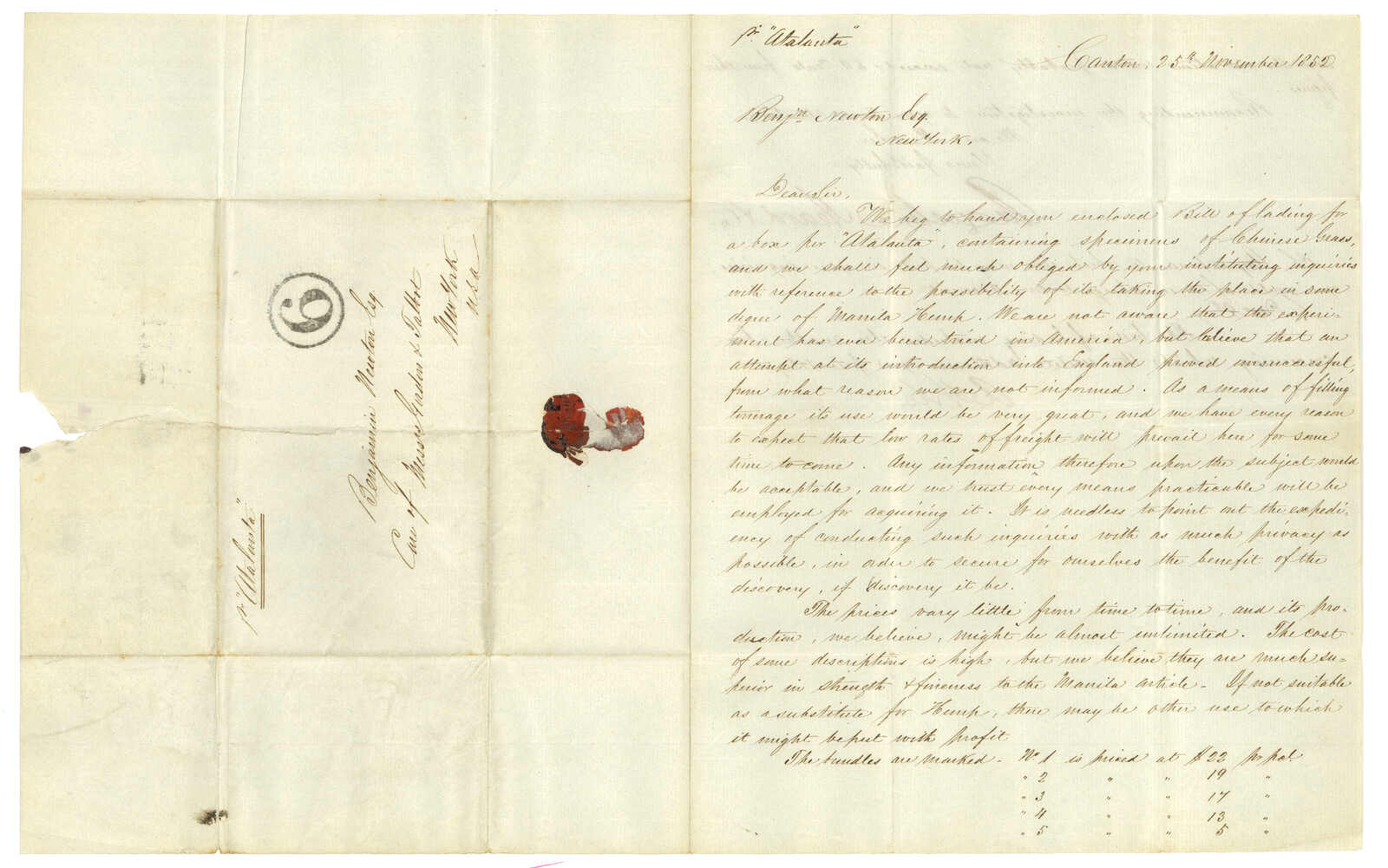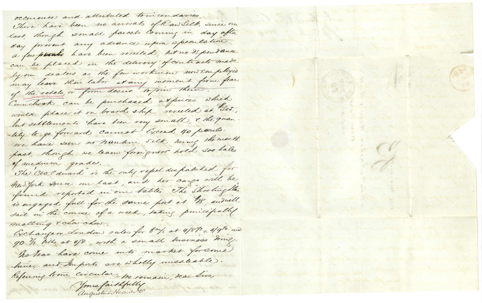 1852 Augustine Heard & Co., Canton (25 Nov) to USA. Entire letter, sent “p Atalanta” and rated “6”. This mail was first privately carried to New York. Folded at middle.