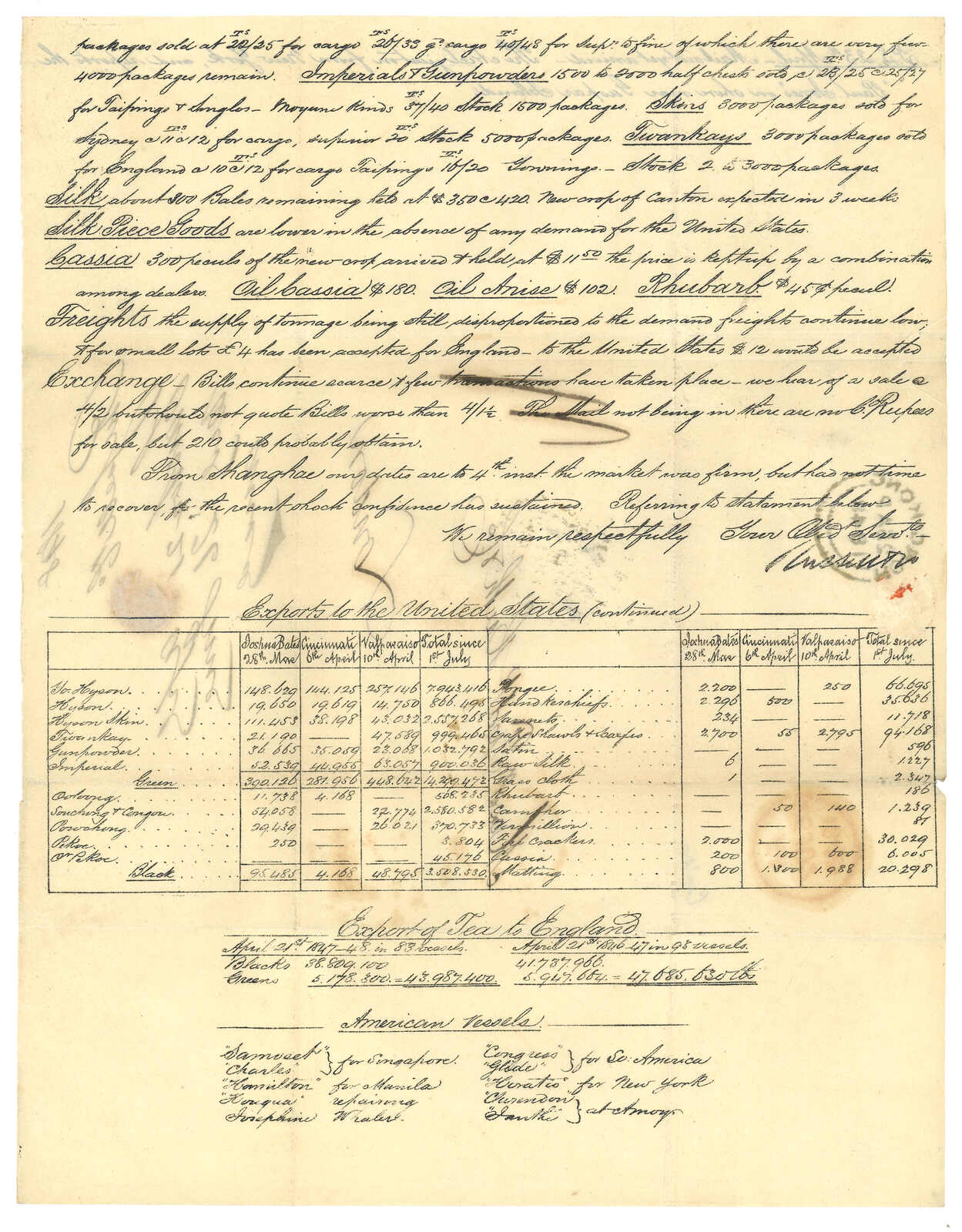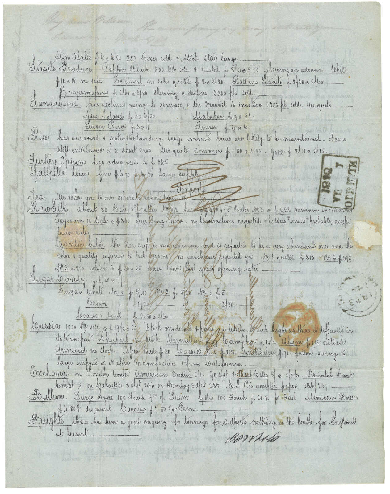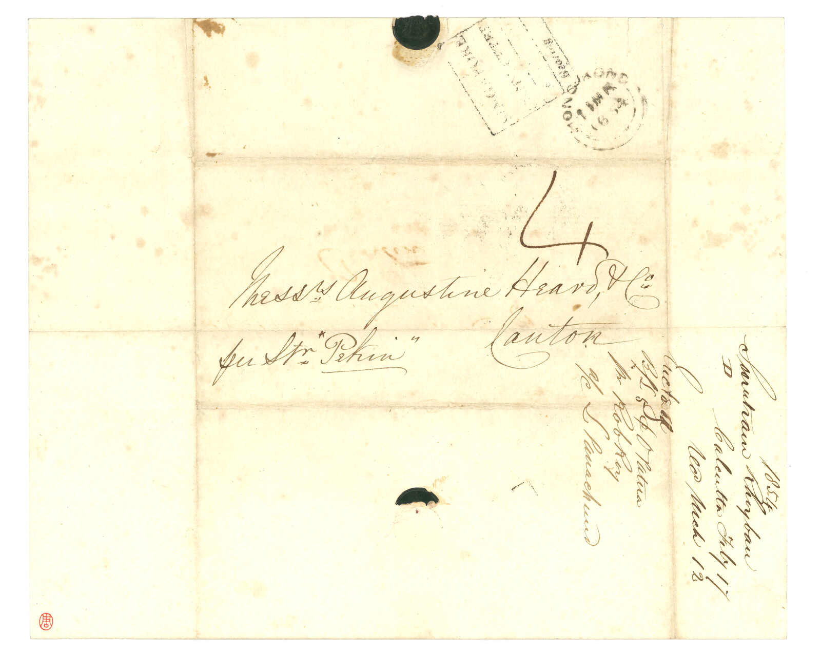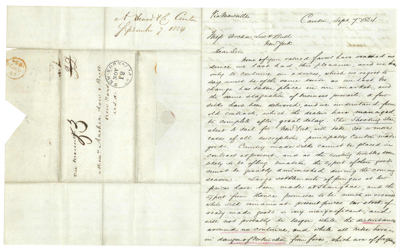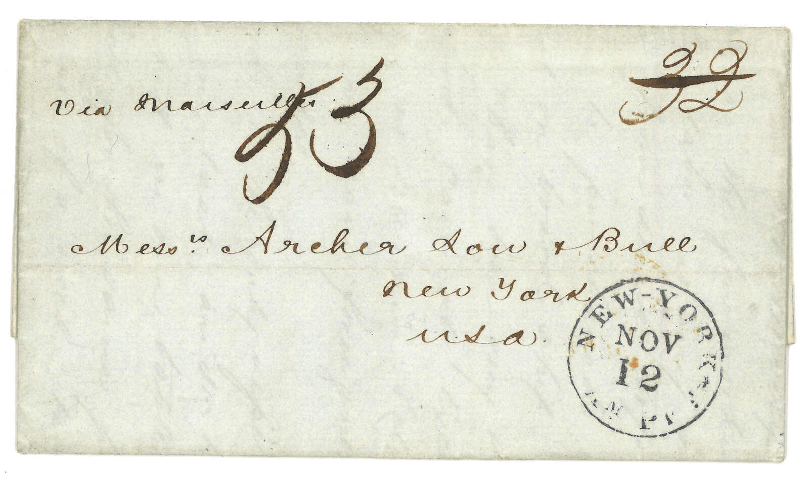 1854 Augustine Heard & Co., Canton (7 Sep) to Archer Low & Bull, USA. Entire letter, sent “via Marseilles” and rated “32” and changed to “53”, applied with Hong Kong (10 Sep) transit cds. Transit London (28 Oct).