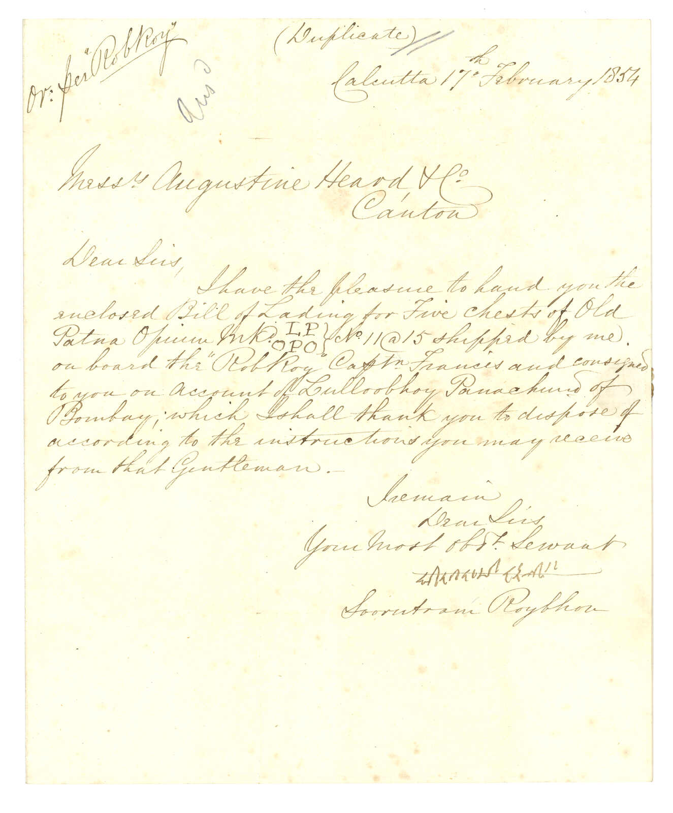 1854.2.17 加爾各答寄廣州瓊記洋行。郵簡,寫有“per str