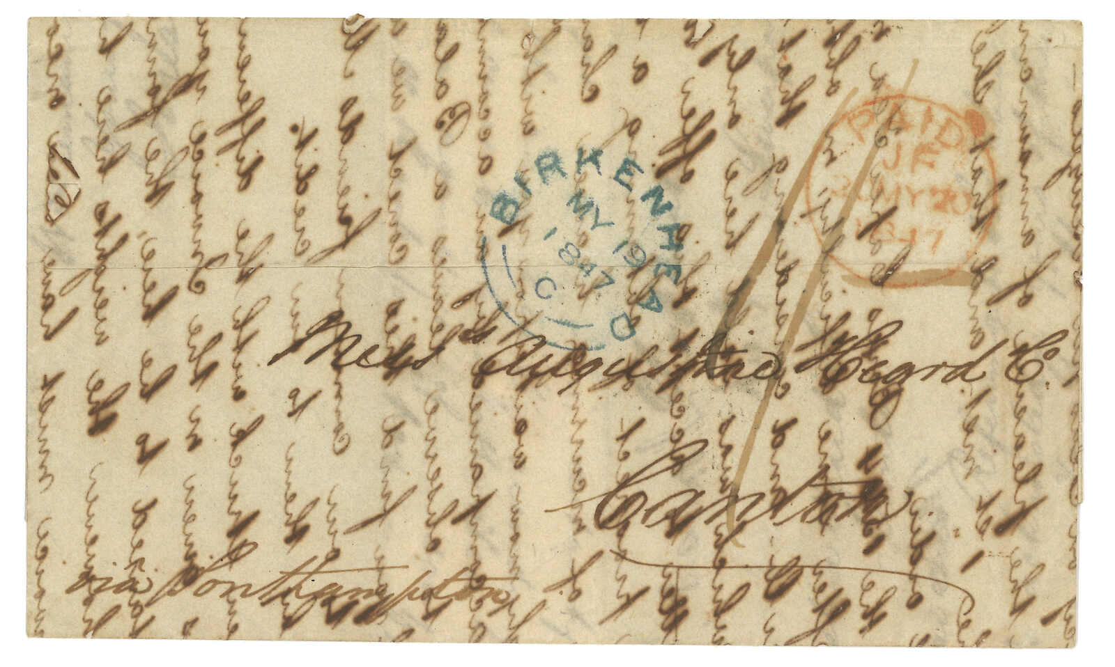 1847 England (23 Apr) to Augustine Head & Co., Canton. Entire letter, sent “via Southampton” and rated “1/-”, applied with Birkenhead double-arc cds (19 May) and London PAID (20 May) cds. This mail was carried by Ripon,
