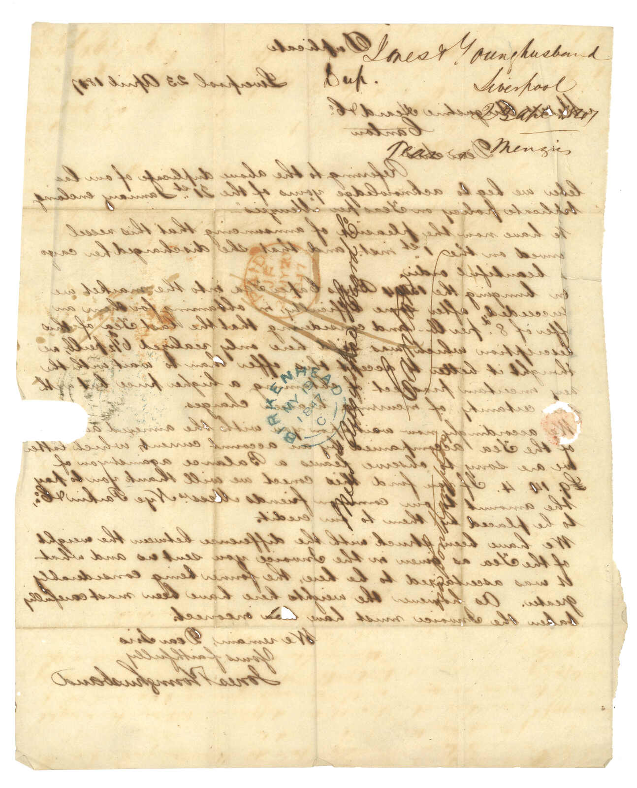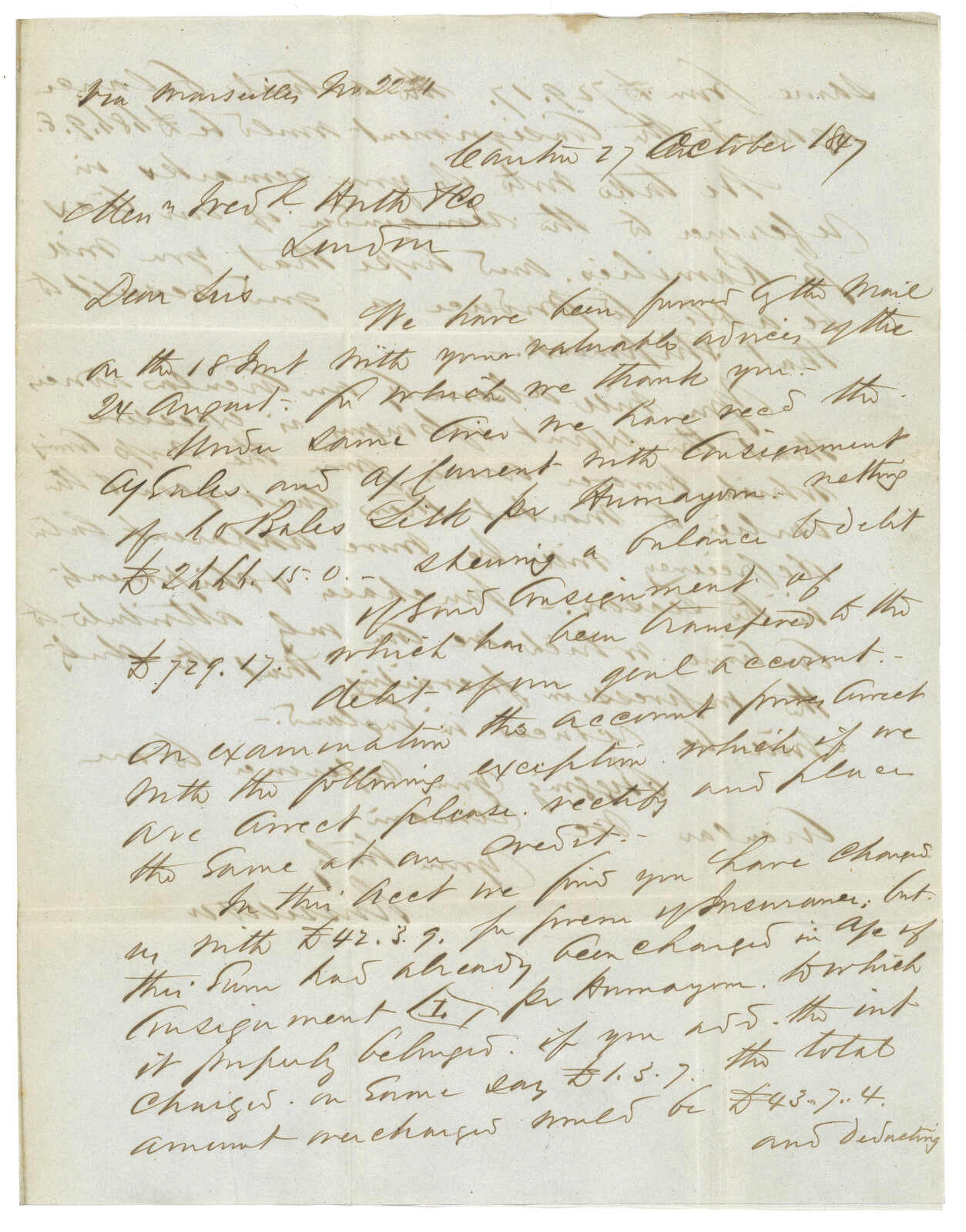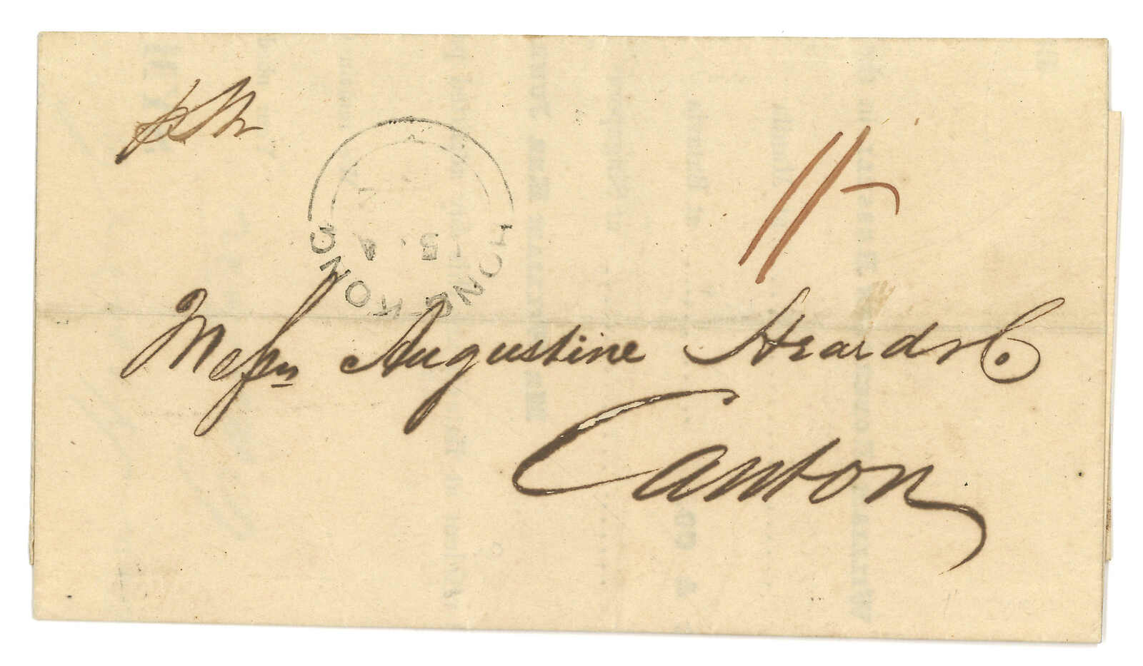 1847.10.27 廣州寄倫敦Frederick Huth & Co.。郵簡,寫有“via Marseilles”及郵資“2/3”,鈐香港10.29中轉日戳。12.22抵倫敦。此信經Lady Mary Wood、Precursor、Hindostan及Admiralty號送遞。(Image 1)