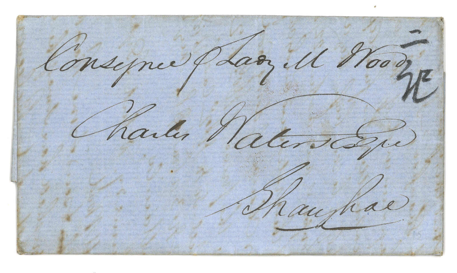 1853 Canton (24 May) to Shanghai. Consignee entire letter, showing “Consignee per Lady Mary Wood” annotation and Chinese delivery annotation by ink-brush. Given the monopoly of P&O for the extension from Hong Kong to