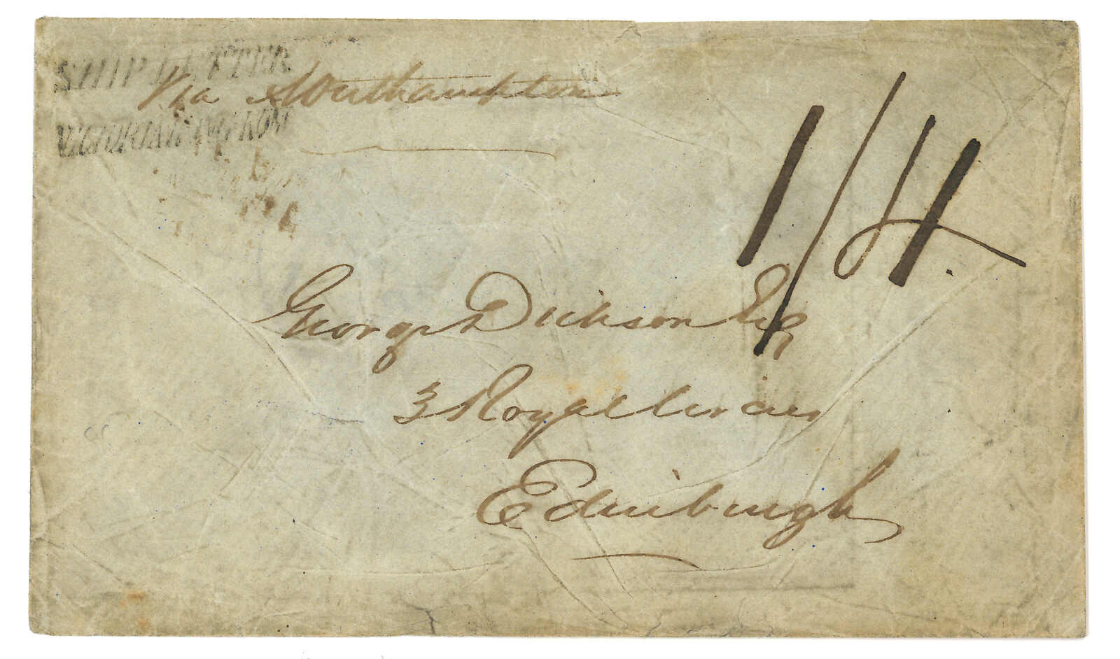 1853 Canton to Scotland. Entire letter, sent “via Southampton” and rated “1/4”, appleid with “SHIPLETTER / VICTORIA HONGKONG” cachet and Hong Kong (10 Mar) transit cds. Transit London (2 May). Arrived Edinburgh (3 May). 1sh was