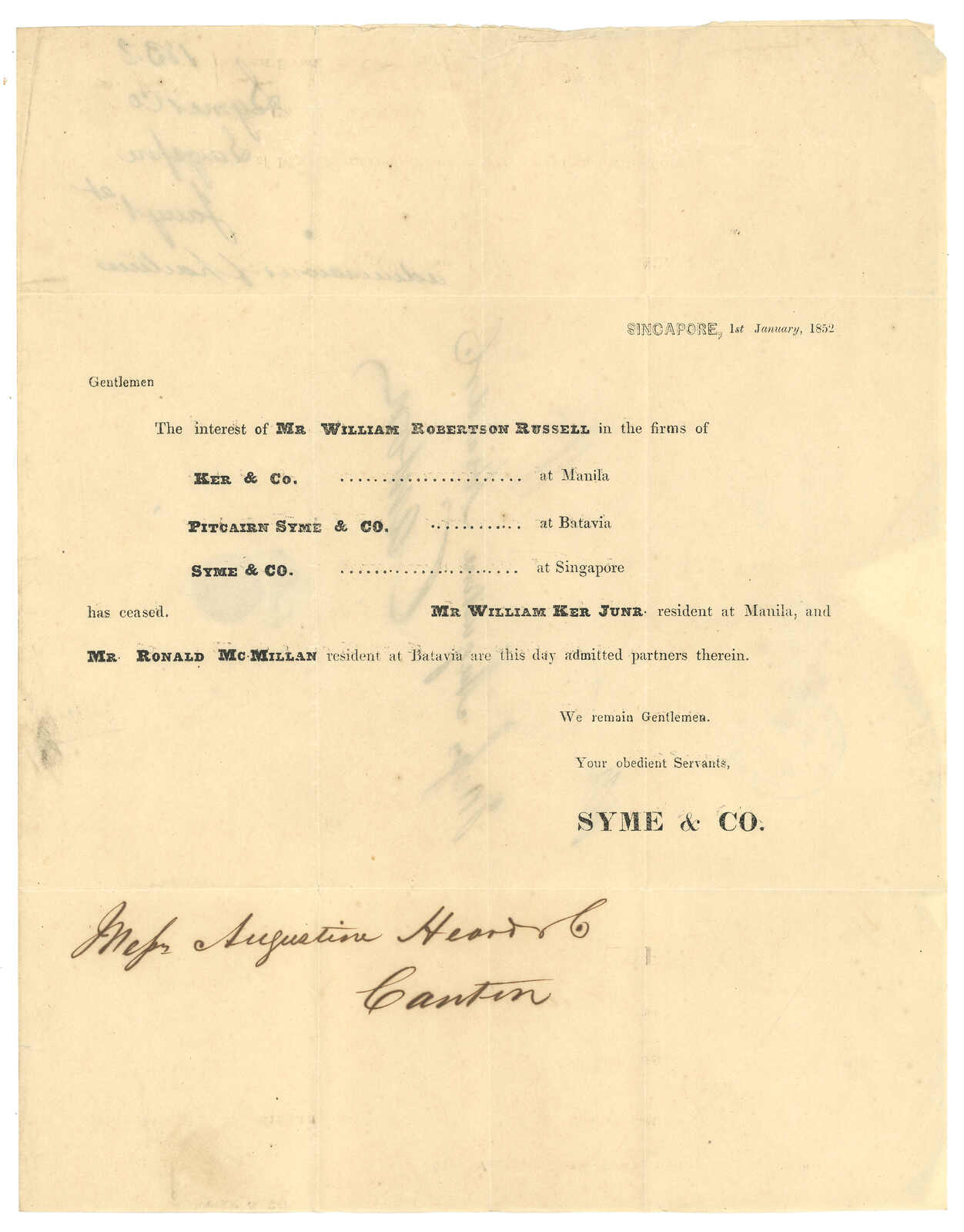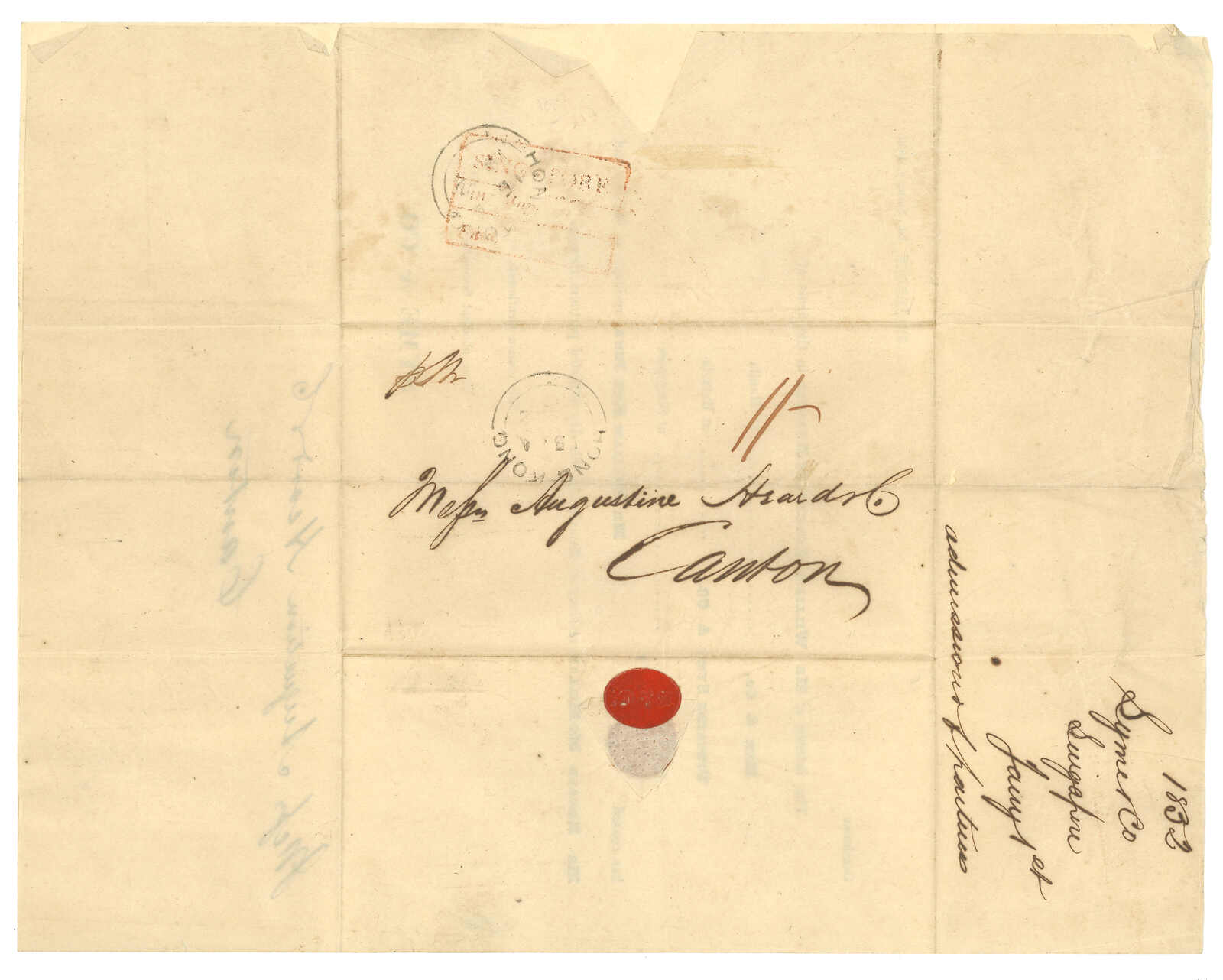 1852 Singapore (1 Jan) to Augustine Head & Co., Canton. Entire letter, sent “p Str” and rated “1/-”, applied with Singapore paid boxed d.s and Hong Kong double-arc arrival cds (15 Jan). Scarce incoming example from
