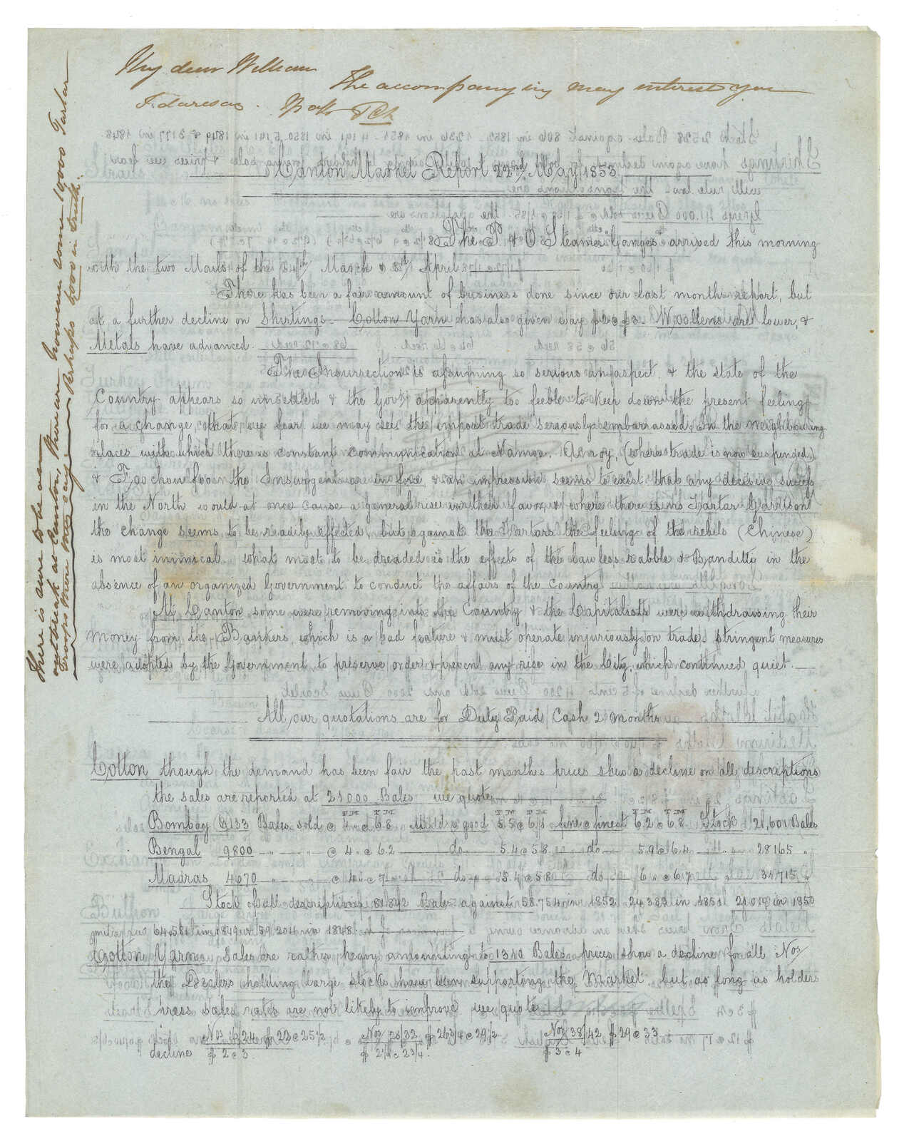 Marseilles”、郵資“32”但改作“53”,鈐香港9.10中轉戳。10.28經倫敦。11.12抵紐約。內容提到太平天國,有趣難得。此信經Ganges、Hindostan及Valetta號送遞。(Image 1)