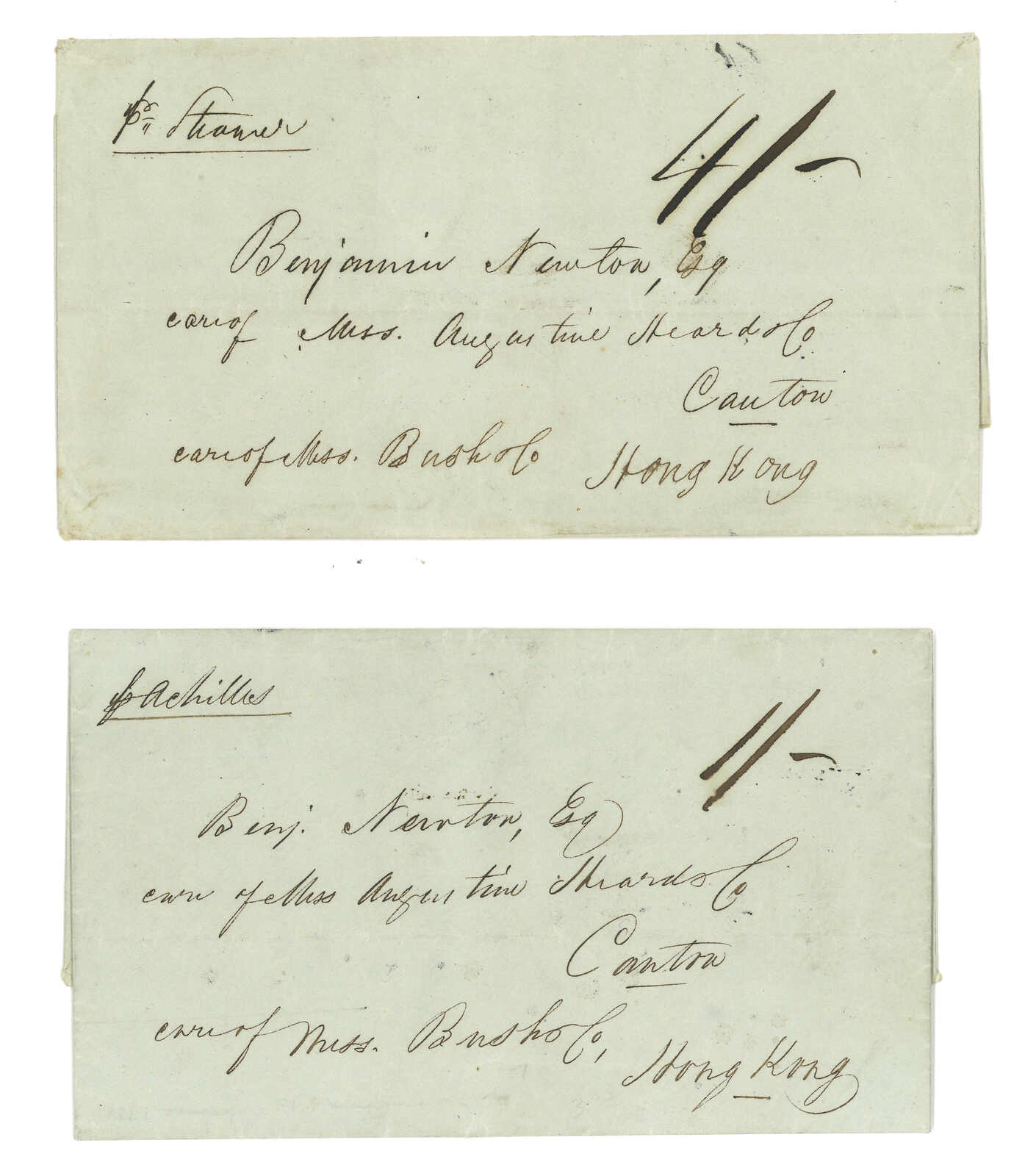 1850年一對新加坡Bonstind & Co寄廣州Benjamin Newton郵簡,分別寫有郵資“4/-”及“1/-”,鈐香港中轉戳。反映了少見難得之四倍郵資及正常郵資, 進口自新加坡更為難得。兩封分別經Pekin及Achilles號送遞。(Image 1)