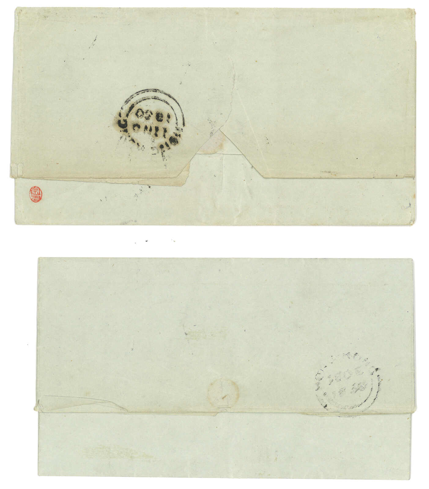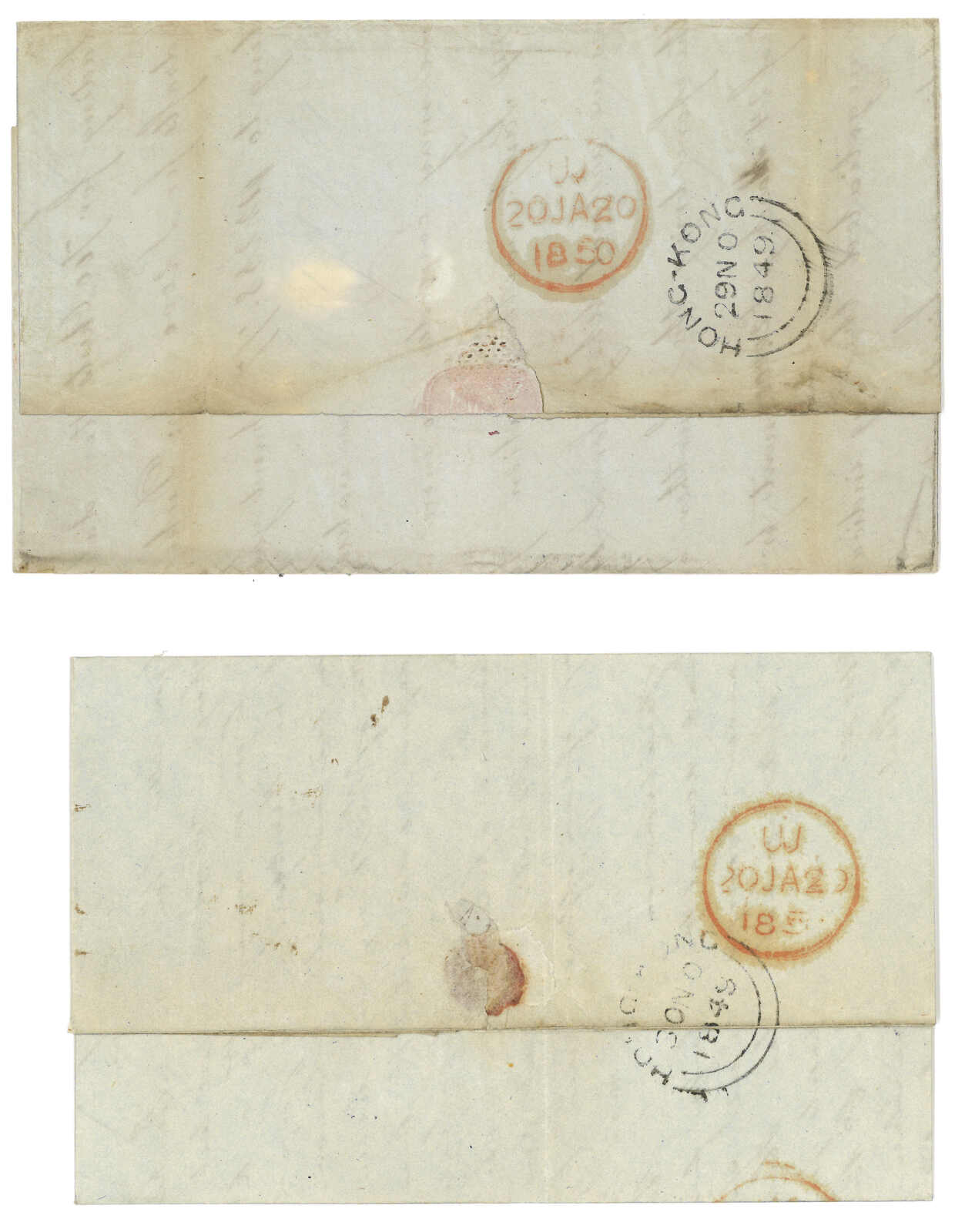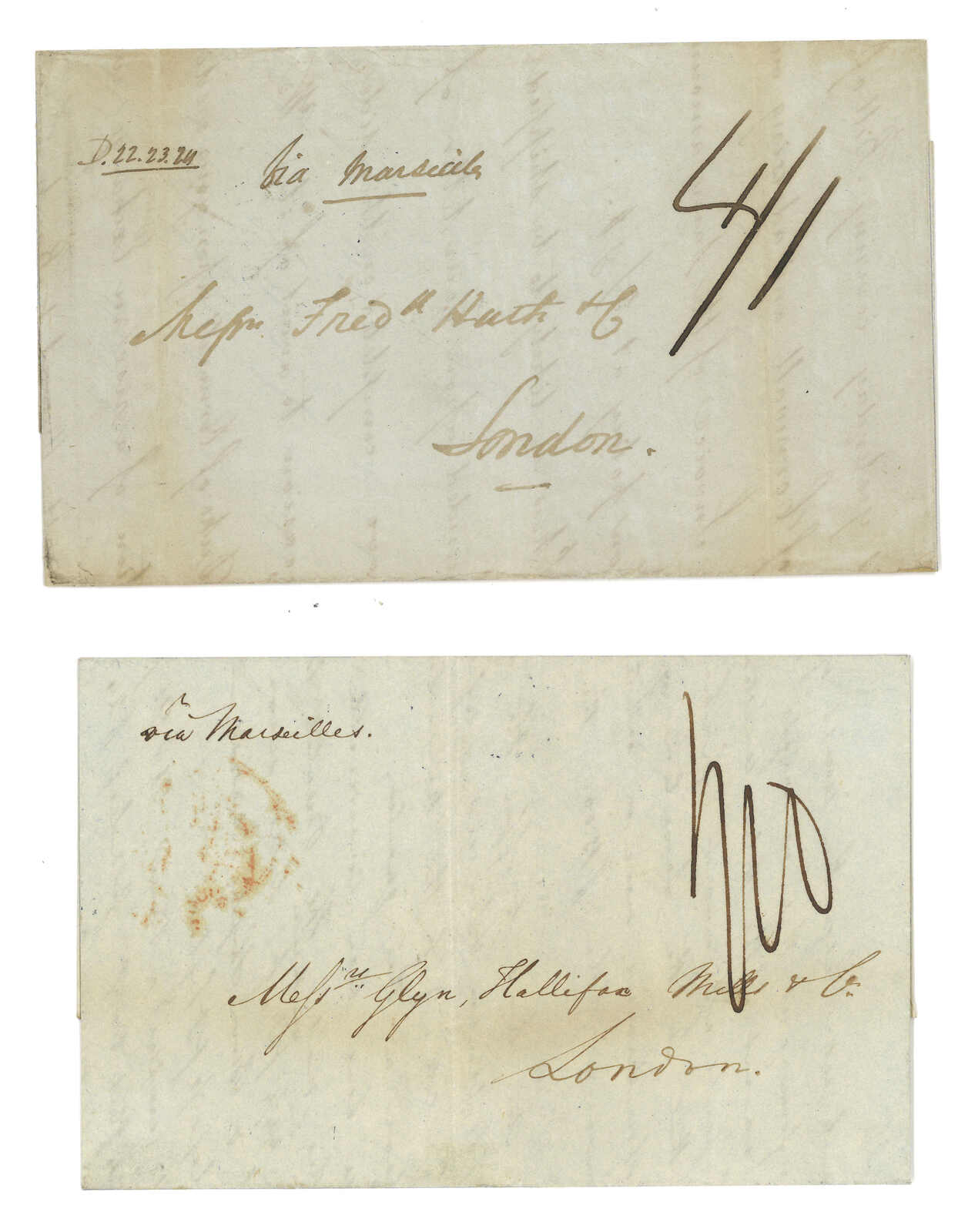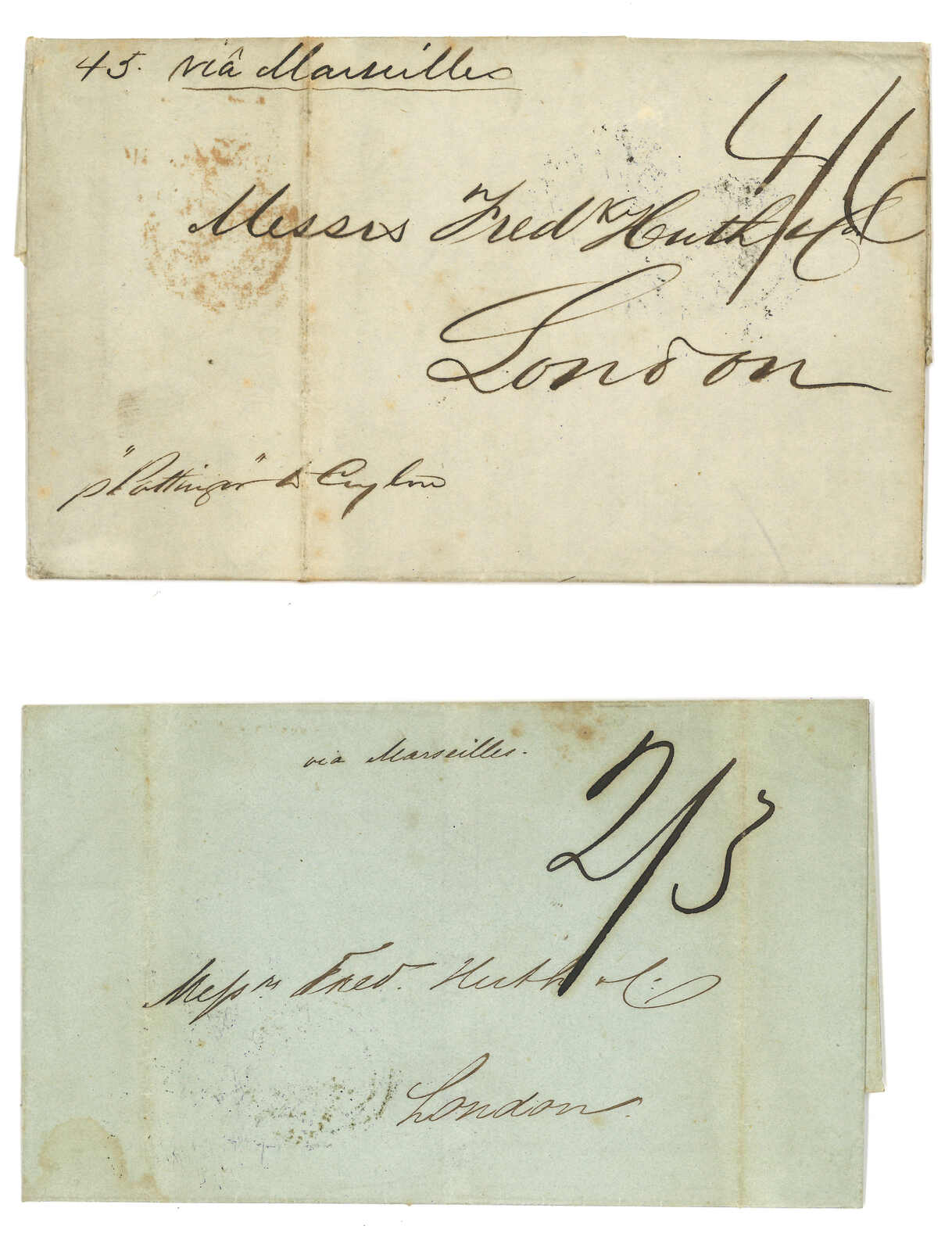 1847 (20 Nov) a pair of entire letters from Canton to Frederick Huth & Co., London, sent “via Marseilles” and rated “4/6” and “2/3” respectively, applied with Hong Kong transit cds and London arrival cds. Despite datelined