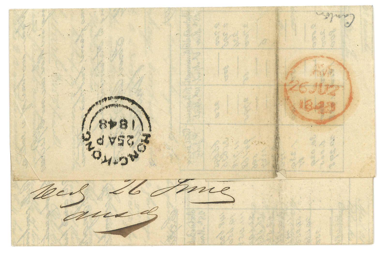 1848 Canton (21 Apr) to Frederick Huth & Co., London. Entire letter, rated “1/-”, applied with Hong Kong double-arc d.s. (25 Apr). Arrived London (26 Jun).