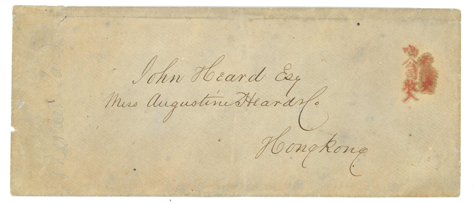 1850年代寄香港瓊記洋行John Heard西式封,鈐“香港交喝公司收入”直戳。反映了第二次鴉片戰爭期間,廣州郵件如何寄至廣州以外之外國商人。(Image 1)