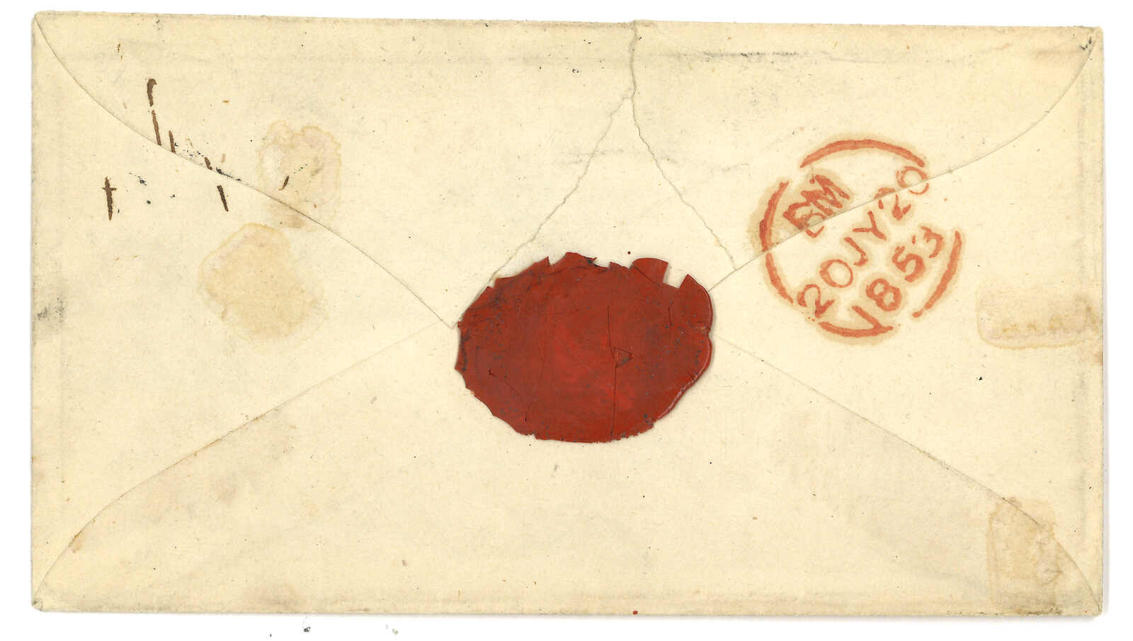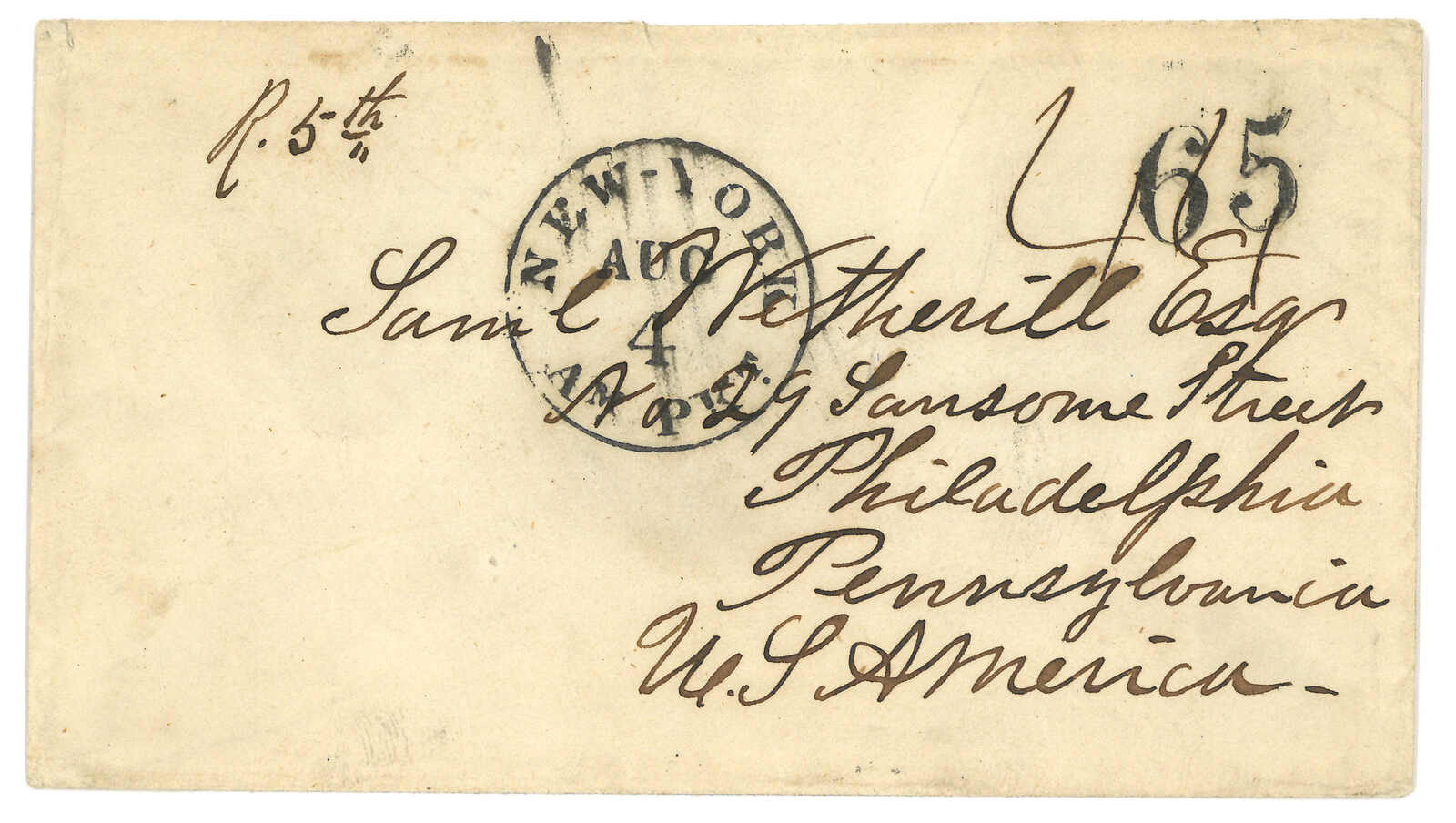 1853年西式封自中國寄美國,帶郵資“65”及“44”,鈐倫敦7.20及紐約8.4中轉戳。《Japanese Philately Vol 47 No. 5》中《Hakodada, Japan June 1855》一文原件。由於歐美國家(除荷蘭)直至1859年才可與日本貿易,故跨太平洋郵政服務要到1867年才開通。此信經馬賽航線送遞,船隻為Hindostan及Sultan號。(Image 1)