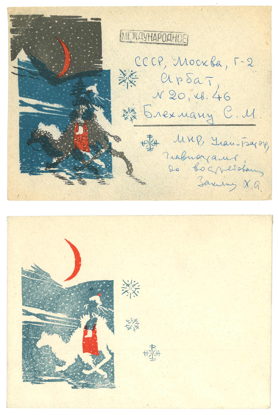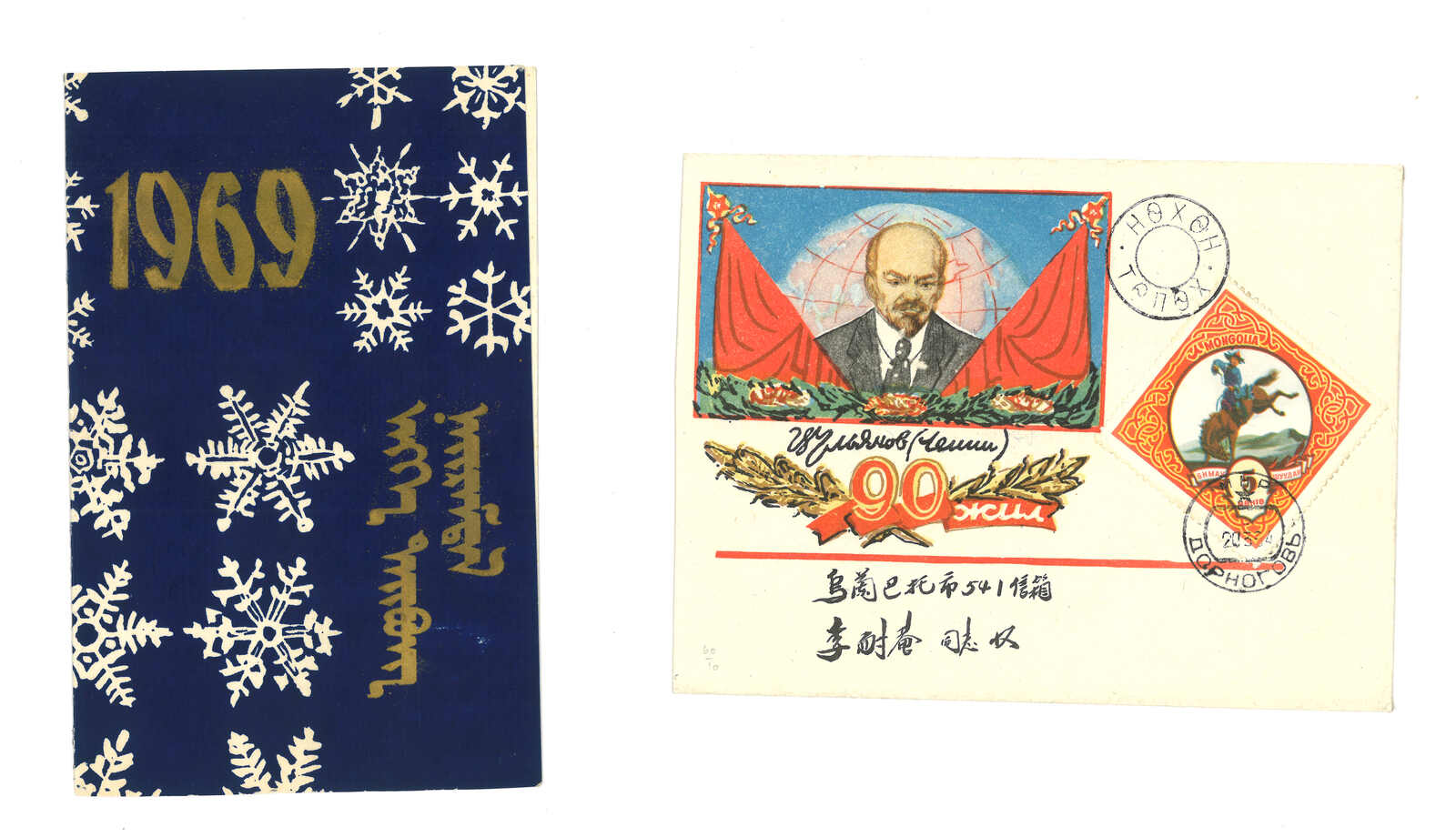 1960年代一組三件蒙古美術封,包括“那楚克道爾吉六秩壽辰”、“列寧誕辰一百週年”等,另附一件那楚克道爾肖像明信片一件。(Image 1)