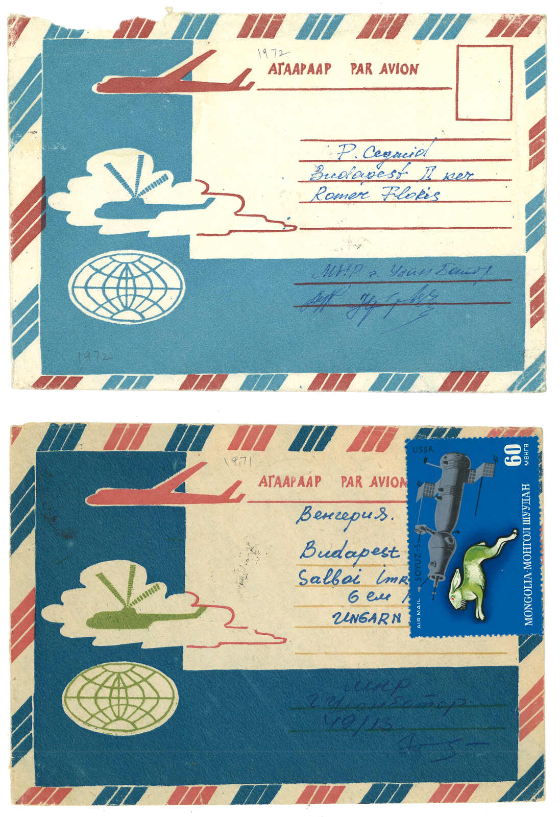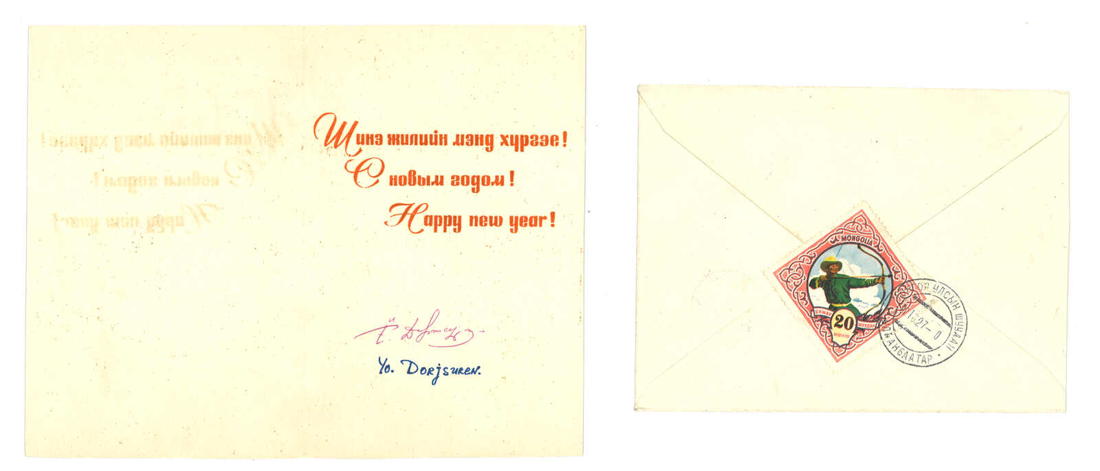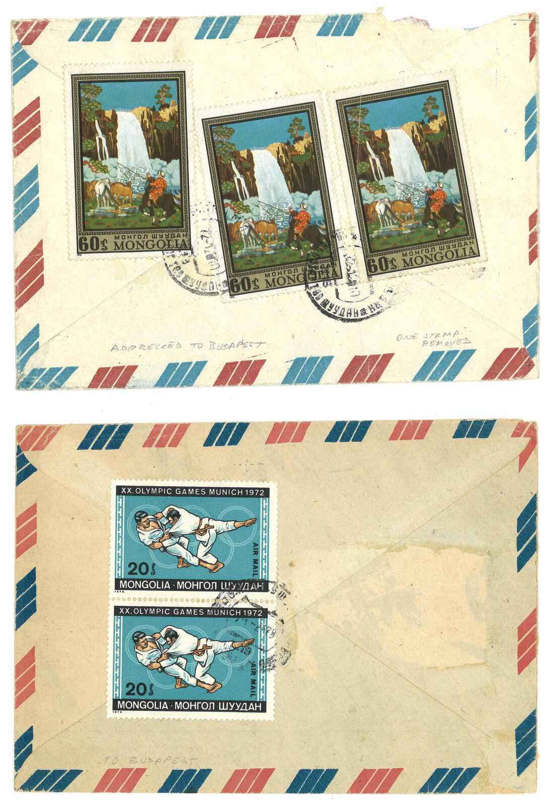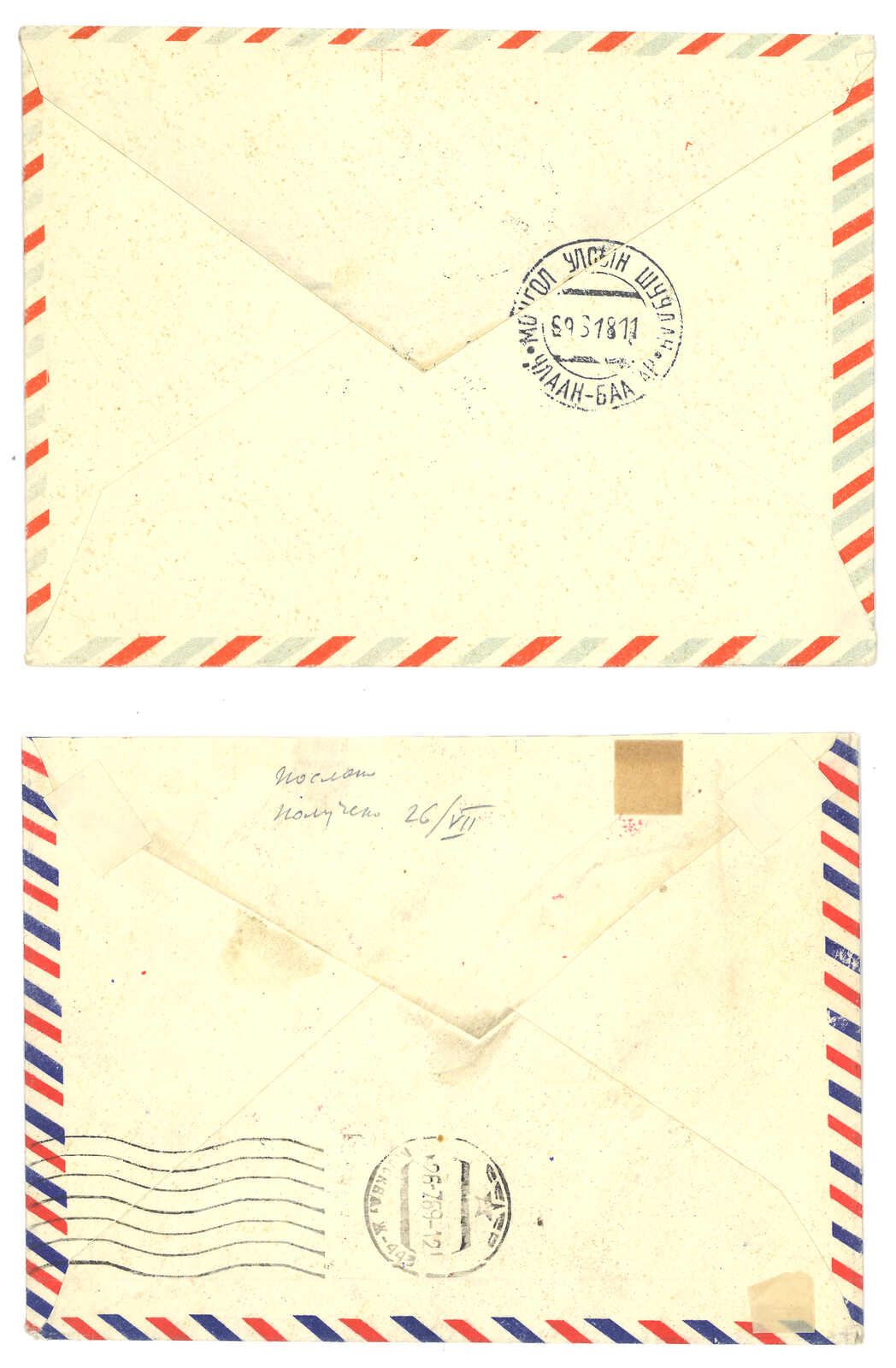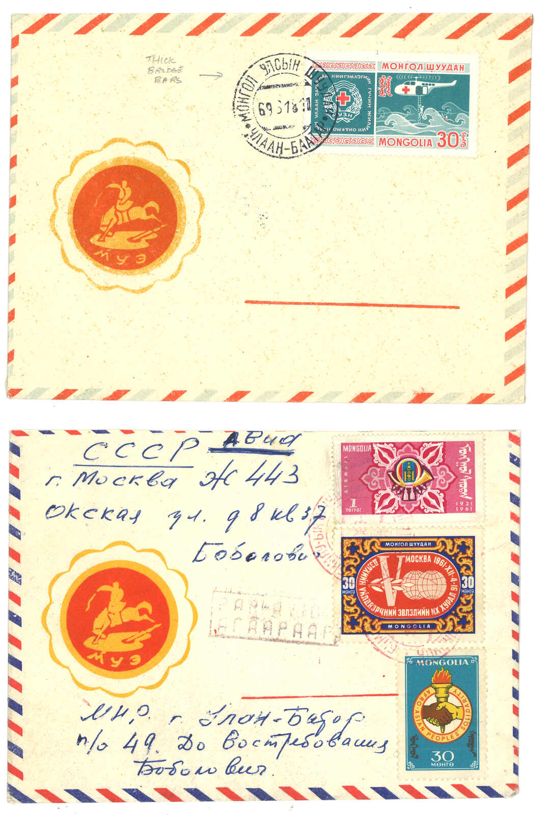 1966-1967 a pair of "Soyombo" illustrative covers in heavier and light shade, both commerically used to USSR. Former's printing shifted to left.