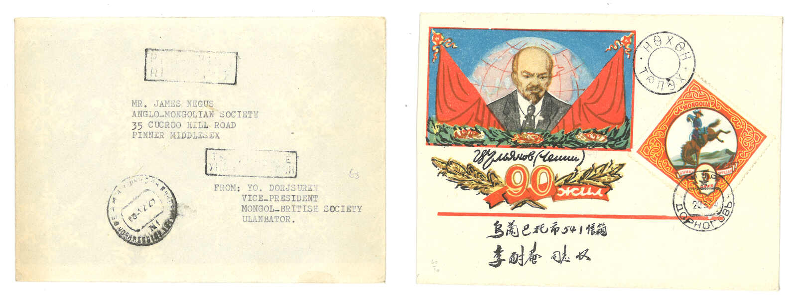 列寧九十週年美術封寄烏蘭巴托,鈐稀罕之“Nokhon / Talbokh”欠資圓戳。此為該戳之存世孤例。另附一件烏蘭巴托寄英國封。(Image 1)