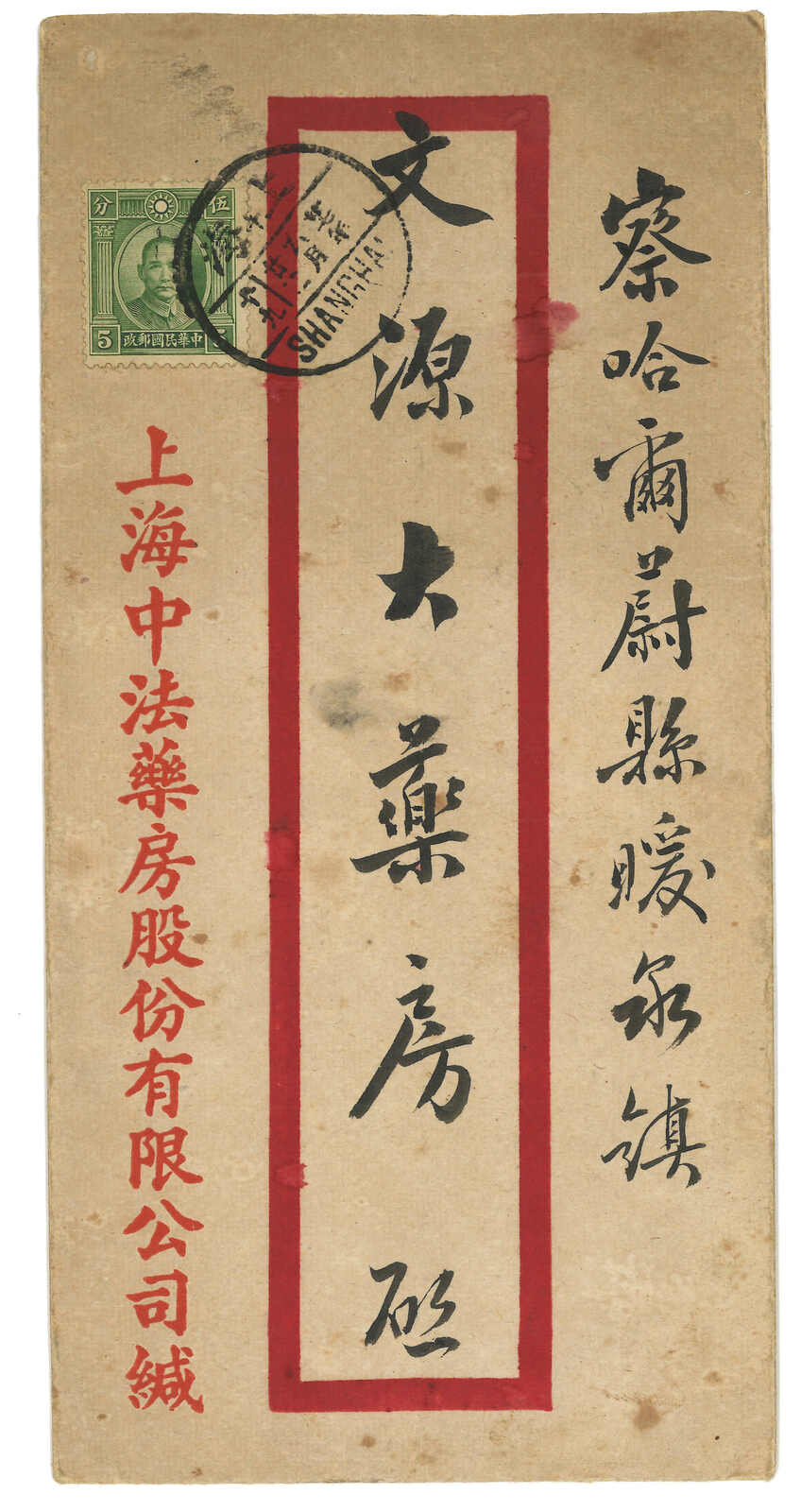 1938.6.22 上海寄暖泉鎮,貼孫像5分,銷上海三格漢英日戳。背面鈐“蔚縣暖泉鎮郵便代辦所”到達直戳。(Image 1) (Image 2)