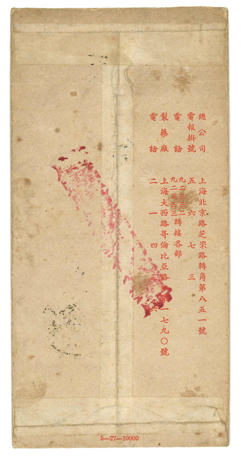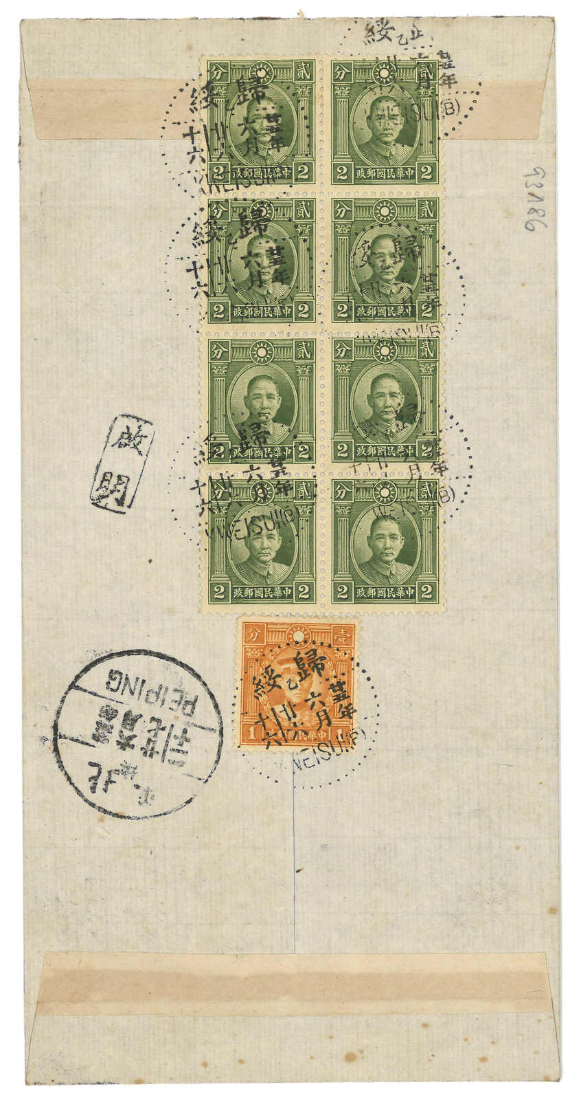 1248 cover image1936 Kweisui (25 Jun) to Peiping. Express cover, f.w. SYS 2c in block of 8 + Martyrs 1c on reverse, tied by Kweisui bilingual cds. Arrived Peiping (27 Jun). On front showing “Opened from Letter Box” cachet.