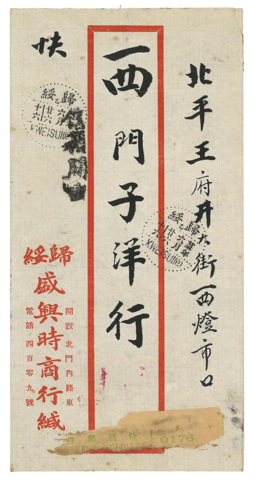 1936.6.25 歸綏寄北平。快信封,背貼孫像2分八方連 + 烈士1分,銷歸綏三格漢英點線日戳。6.27抵北平。正面鈐“信箱開”指示戳。(Image 1) (Image 2)