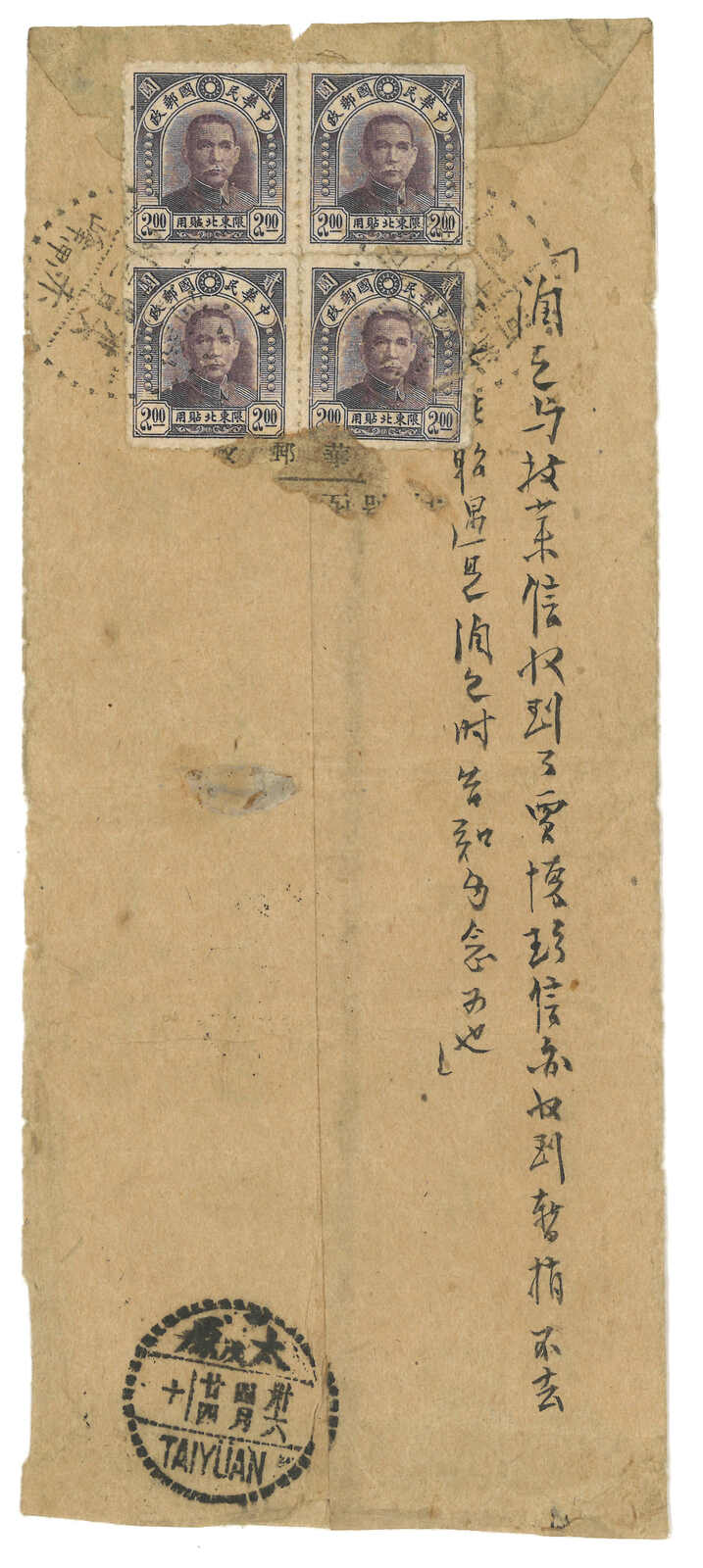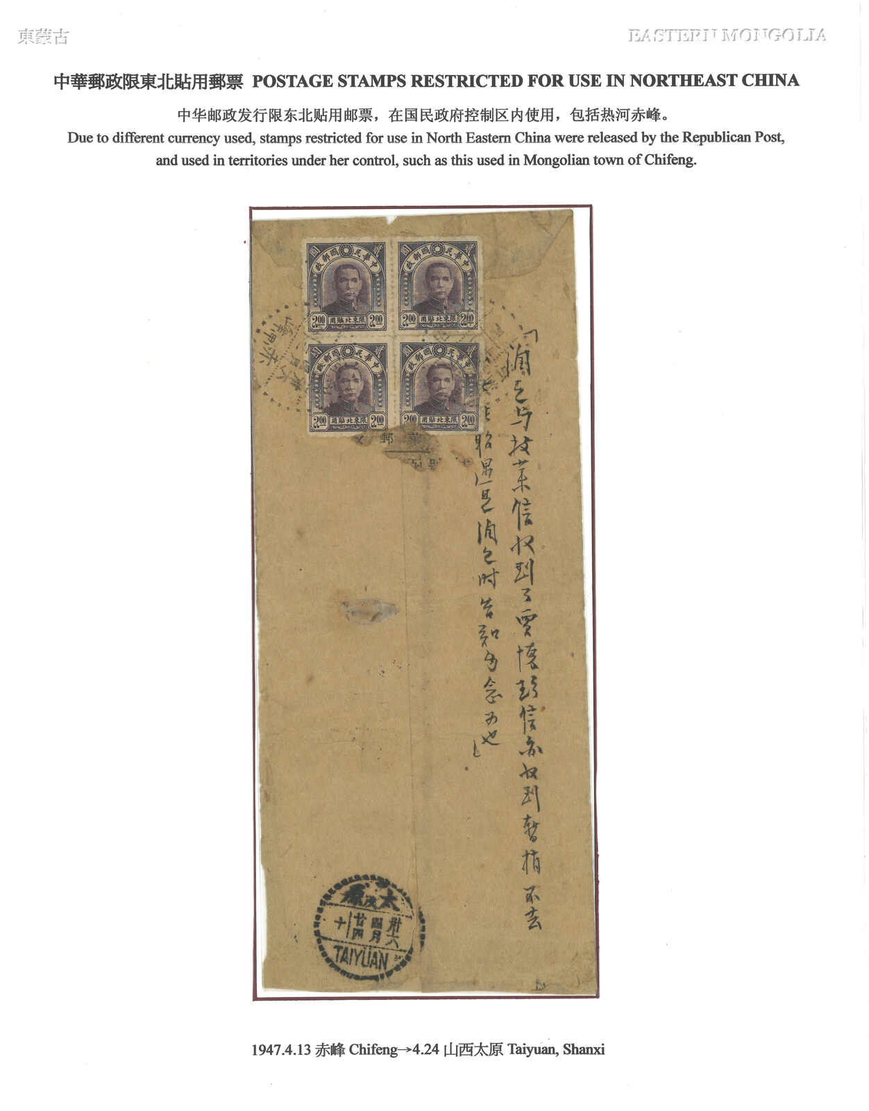 1253 cover image1947 Chifeng (13 Apr) to Taiyuan. Airmail cover, f.w. Peiping Central Print SYS Limited For Use in Northeast $2 in block of 4 on reverse, tied by Jehol Chifeng cds. Arrived Taiyuan (24 Apr).