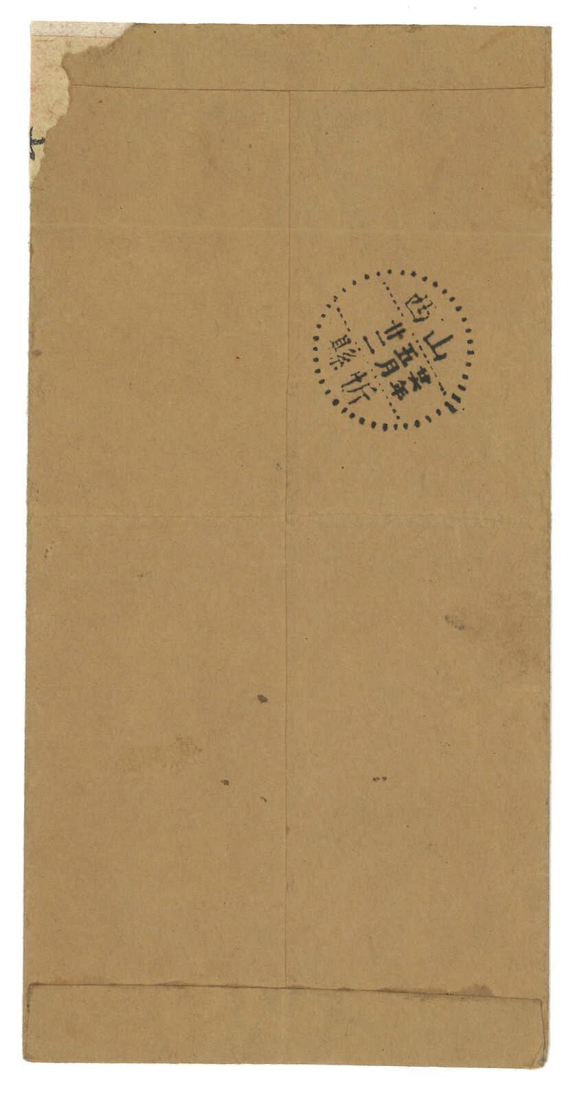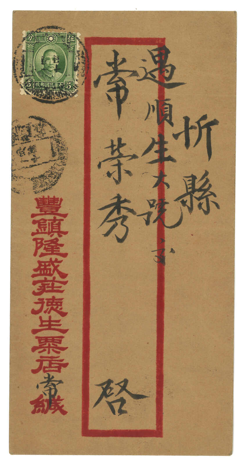 1937.1.10 隆盛莊寄忻縣,貼孫像5分,銷隆盛莊腰框漢英日戳。1.11抵忻縣。(Image 1) (Image 2)
