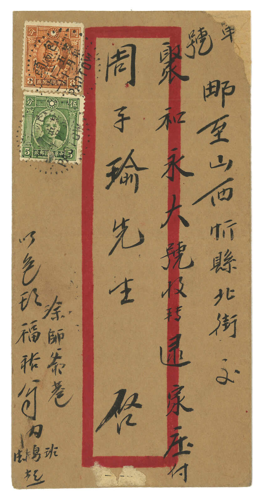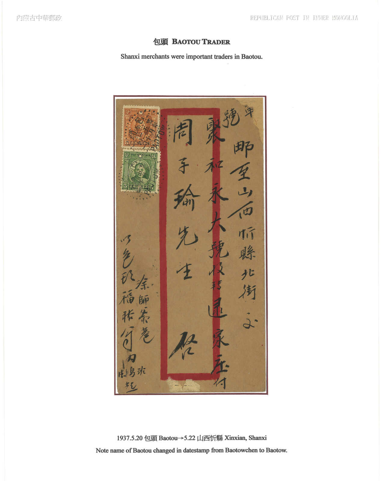 1937.5.20 包頭寄忻縣,貼烈士8分 + 孫像5分,銷包頭三格點線日戳。5.22抵忻縣。日戳為包頭而非包頭鎮。(Image 1) (Image 2) (Image 3)