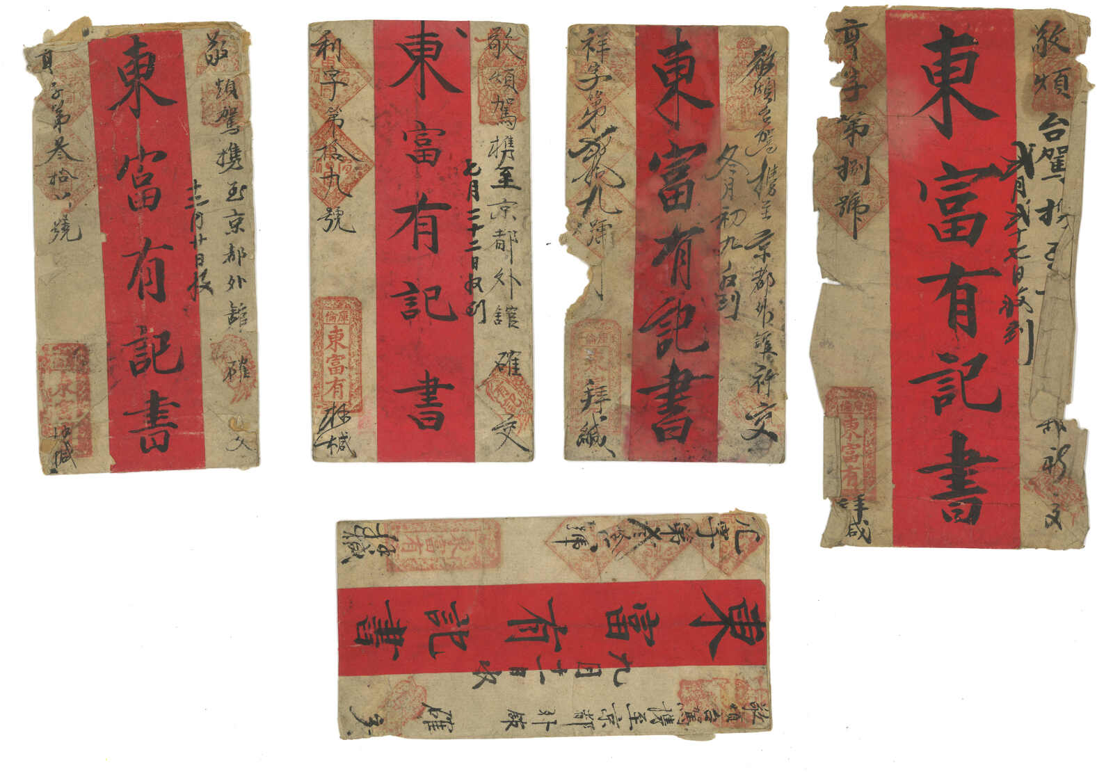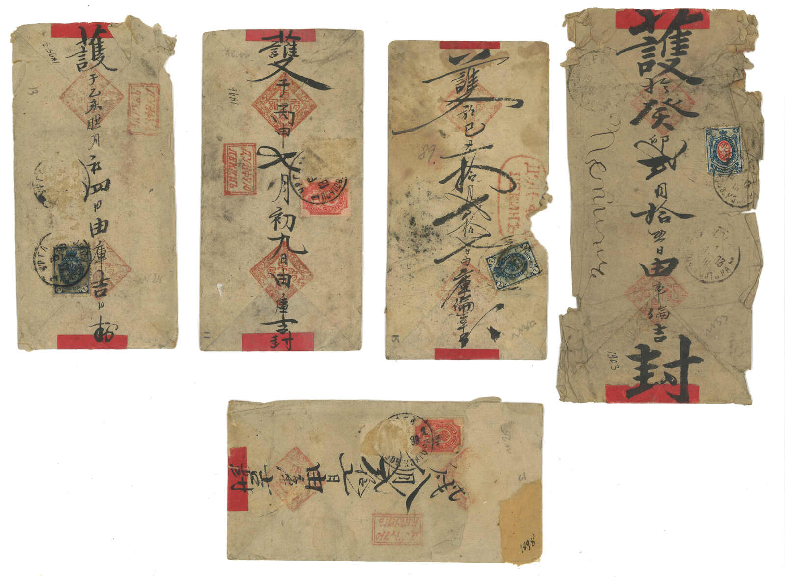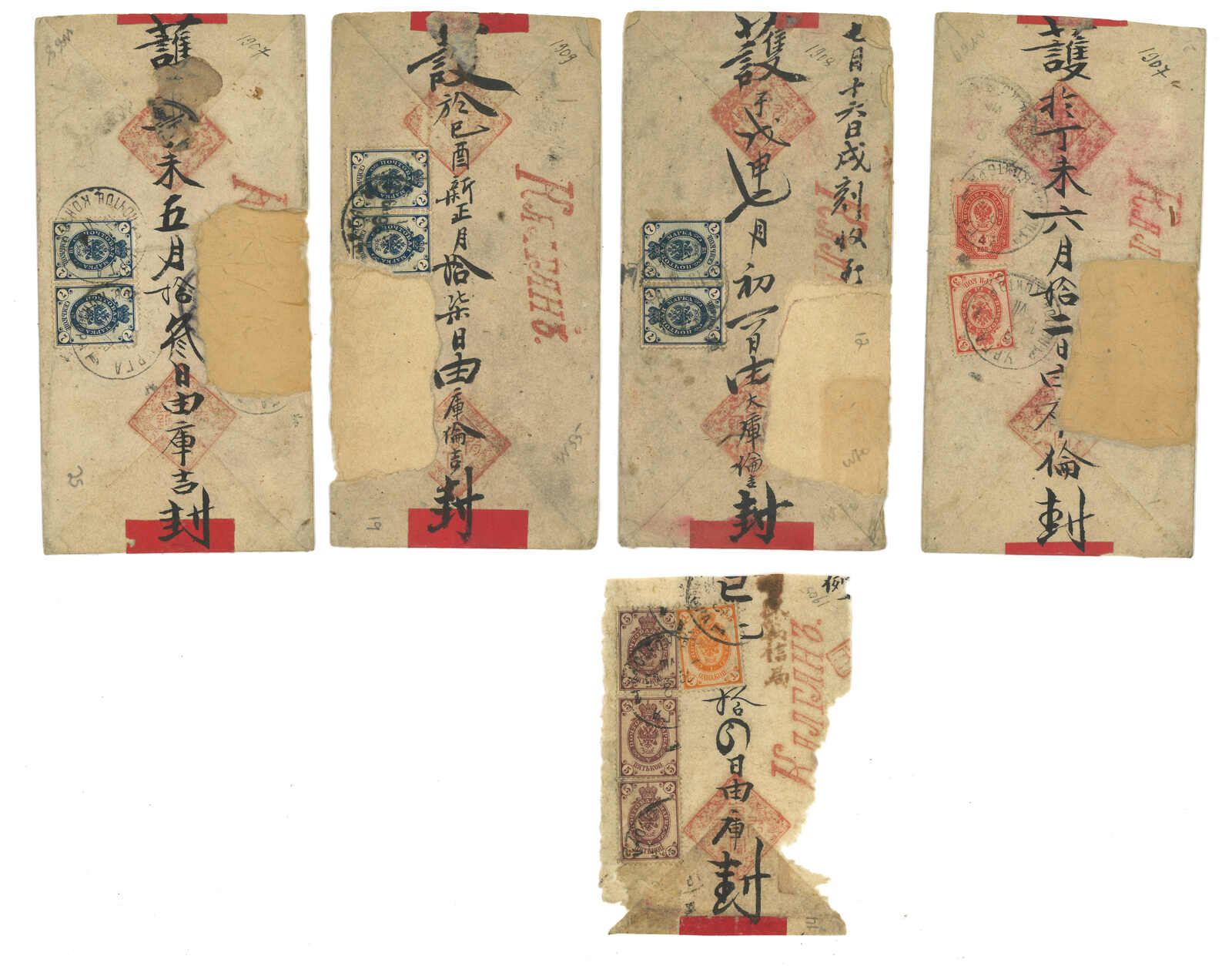 1900年代一組五件庫倫寄出之“東富有”紅條封及封背,其中封背經民信局送遞,貼軍徽圖1戈比 + 5戈比直三連,銷庫倫俄 局日戳,旁鈐民信局直戳,為稀罕難得之蒙古俄局與民信局合作投遞例子。2025年艾華夏拍曾有一件蒙古俄局與民信局合作 投遞之紅條封以港幣3萬4千元落鎚(拍品號2745)。餘四件為中俄混貼封,於張家口加貼蟠龍票寄北京,均被撕除,但仍不 失爲較好的研究資料。(Image 1) (Image 2)