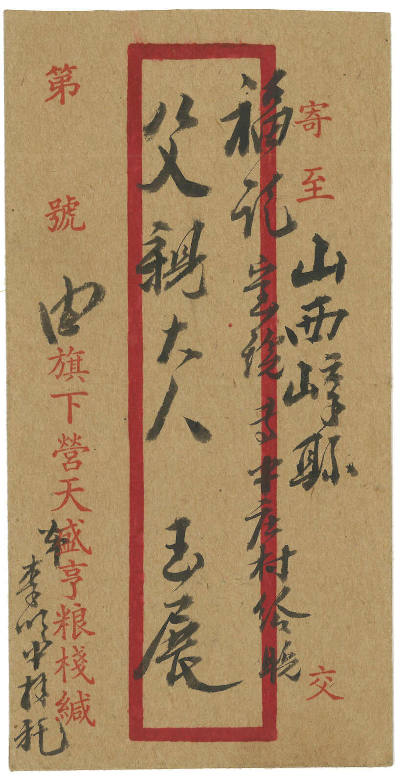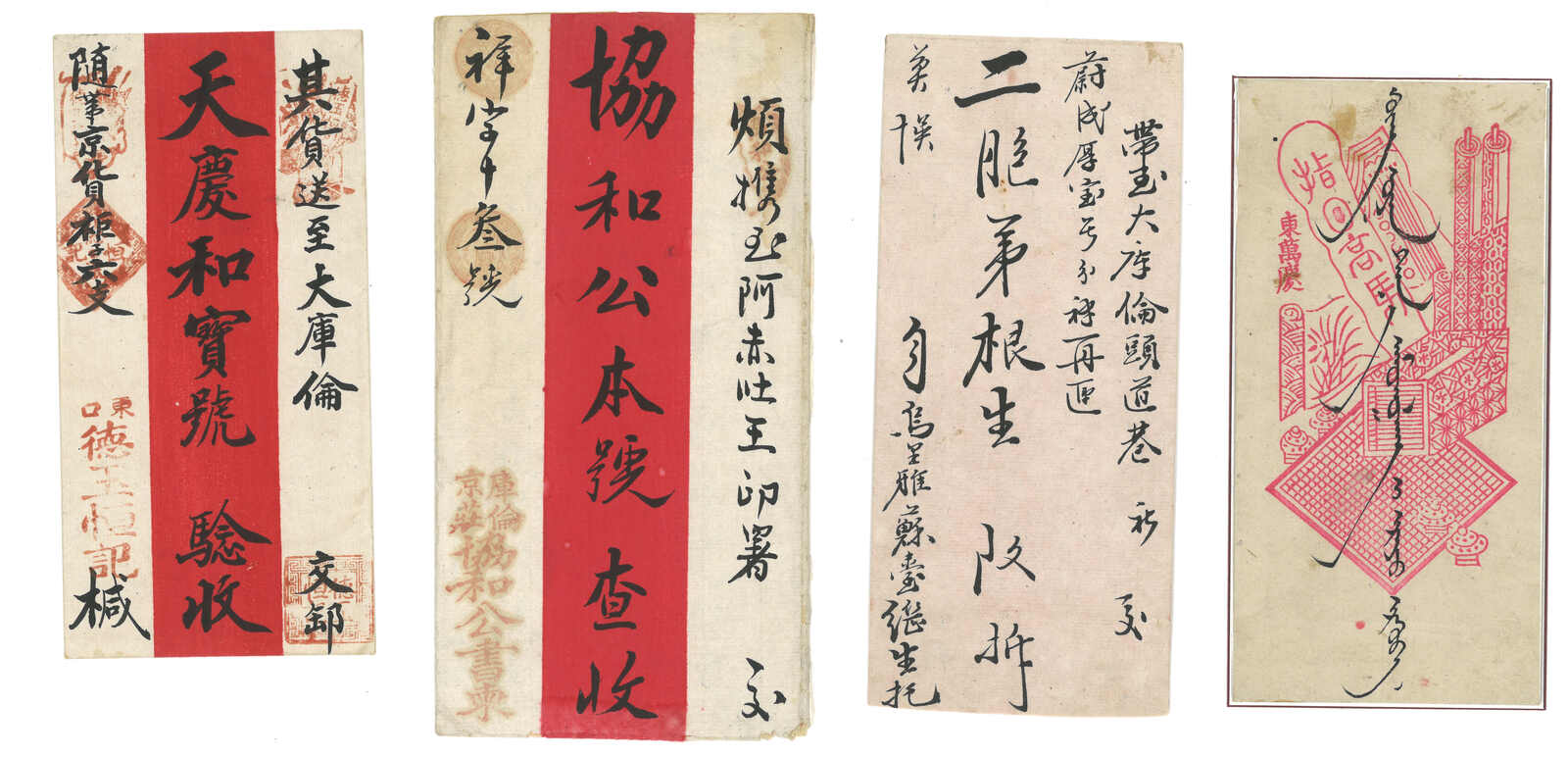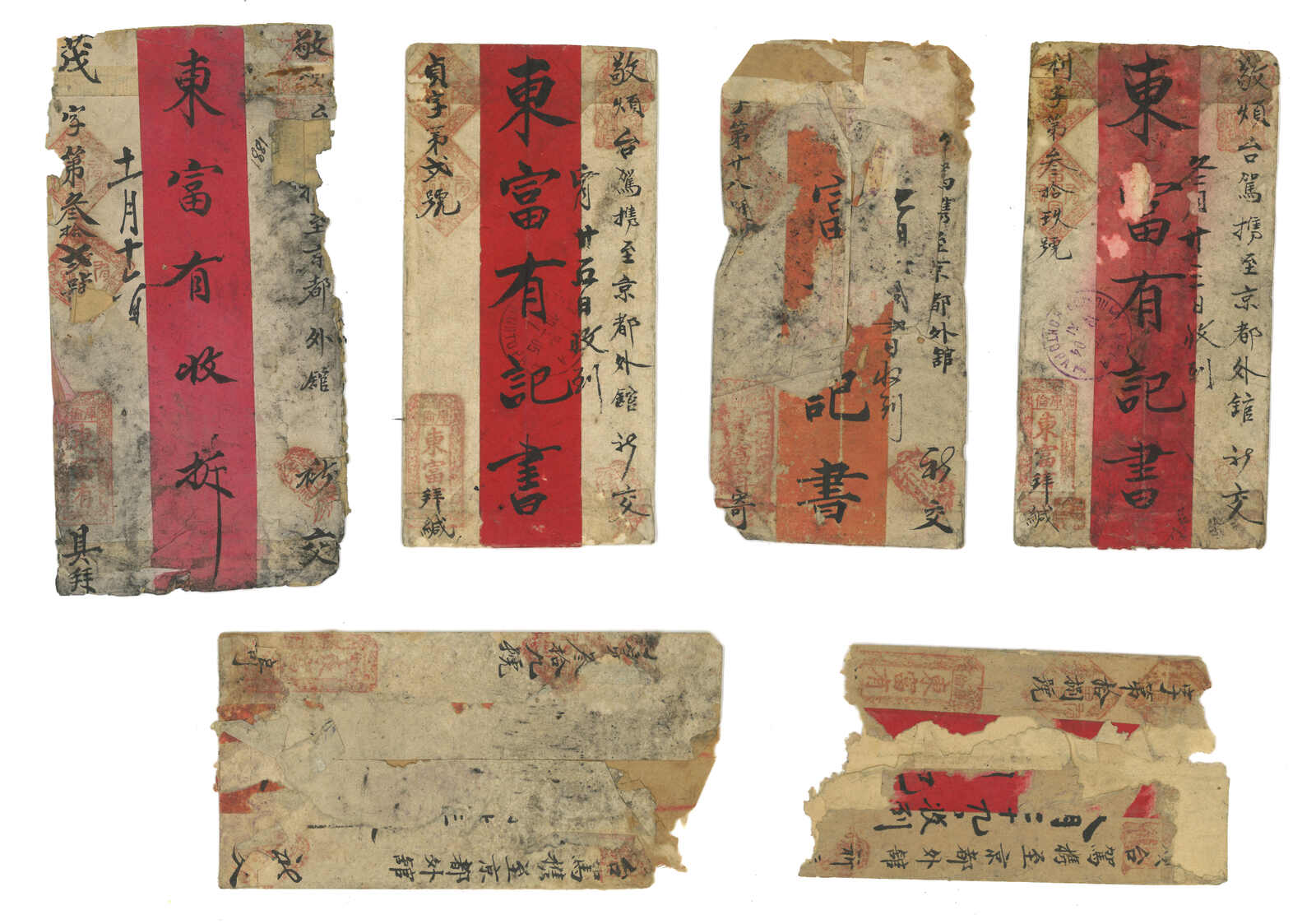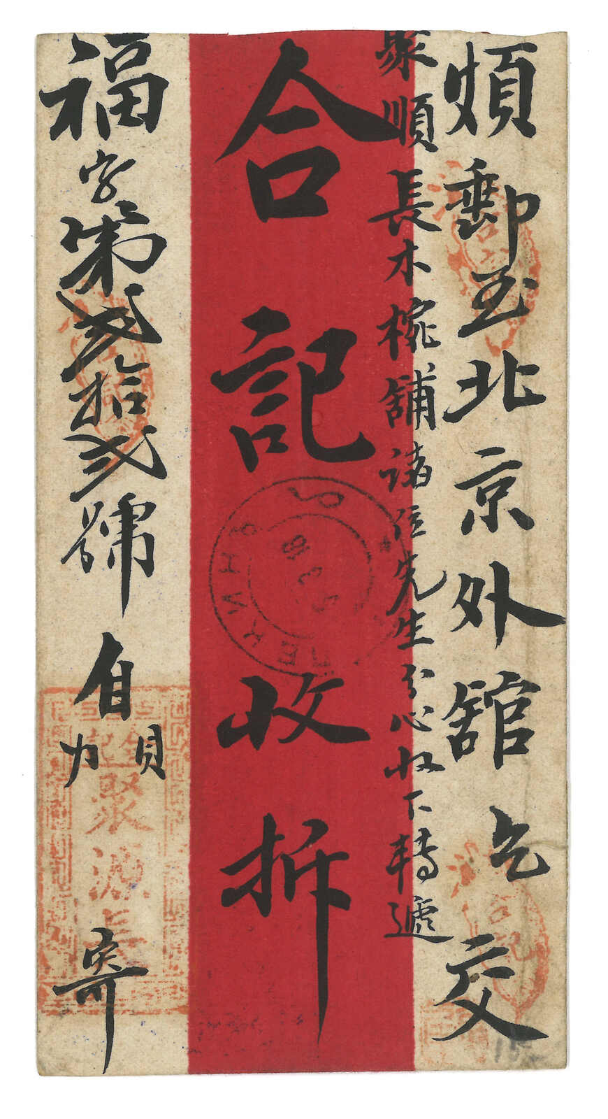 1900年代一組五件庫倫寄出之“東富有”紅條封及封背,其中封背經民信局送遞,貼軍徽圖1戈比 + 5戈比直三連,銷庫倫俄 局日戳,旁鈐民信局直戳,為稀罕難得之蒙古俄局與民信局合作投遞例子。2025年艾華夏拍曾有一件蒙古俄局與民信局合作 投遞之紅條封以港幣3萬4千元落鎚(拍品號2745)。餘四件為中俄混貼封,於張家口加貼蟠龍票寄北京,均被撕除,但仍不 失爲較好的研究資料。(Image 1) (Image 2)