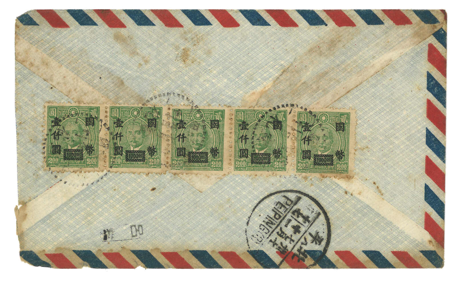 1948.7.9 宣化寄北平。航空封,背貼孫像改值國幣1000元橫五連,銷察哈爾宣化三格點線日戳。7.11抵北平。宣化於同年12月解放。(Image 1) (Image 2)