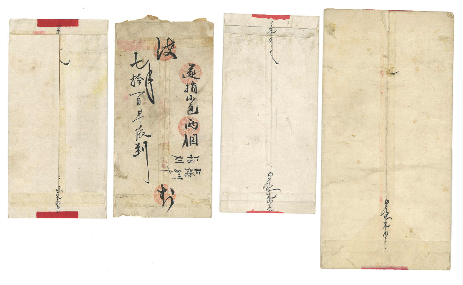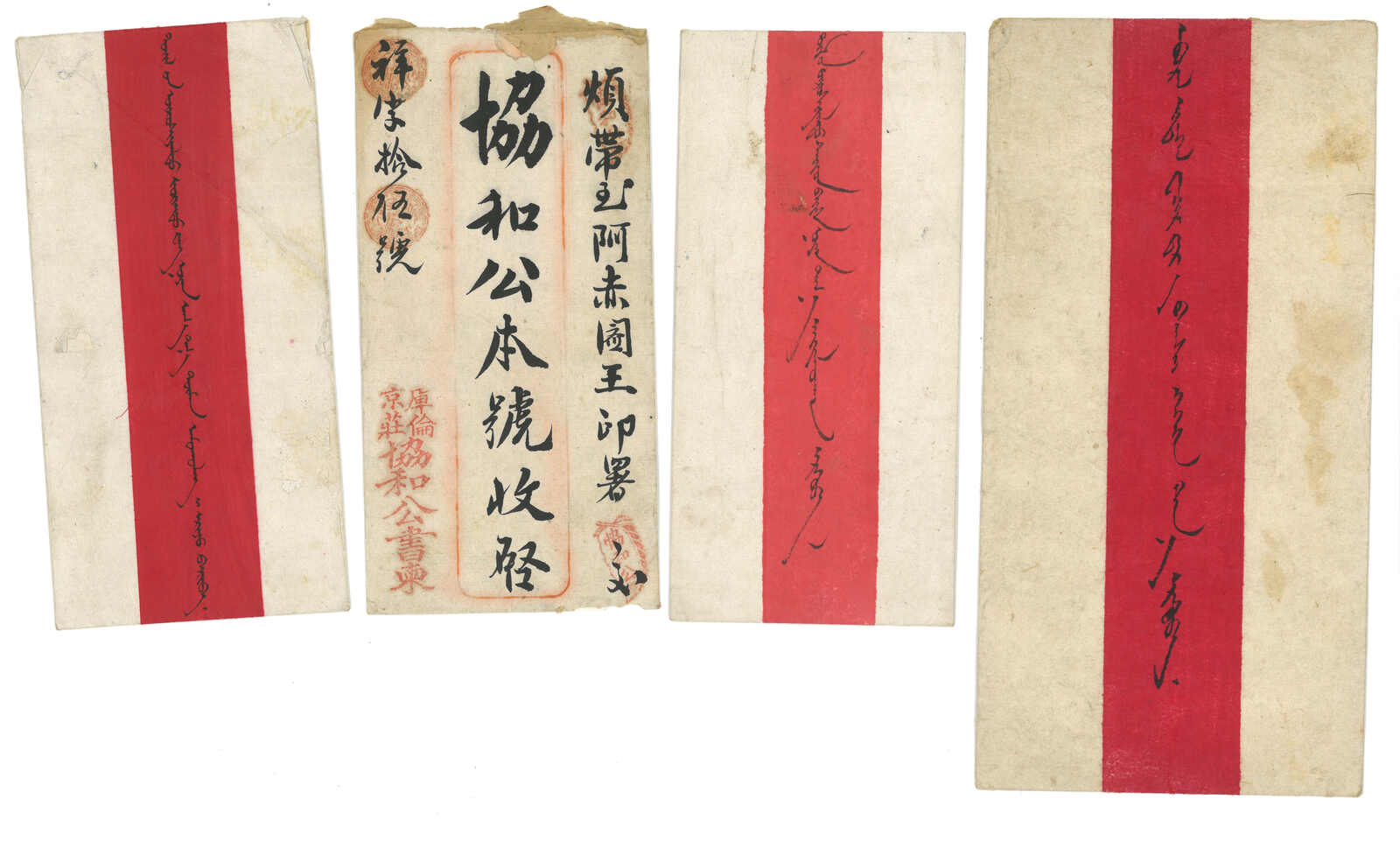 一組八件蒙古紅條封及中式封,均無貼票,經民信局及驛站送遞,大多寄自庫倫,小量出自烏里雅蘇台或偏遠地方。(Image 1) (Image 2) (Image 3) (Image 4) (Image 5)