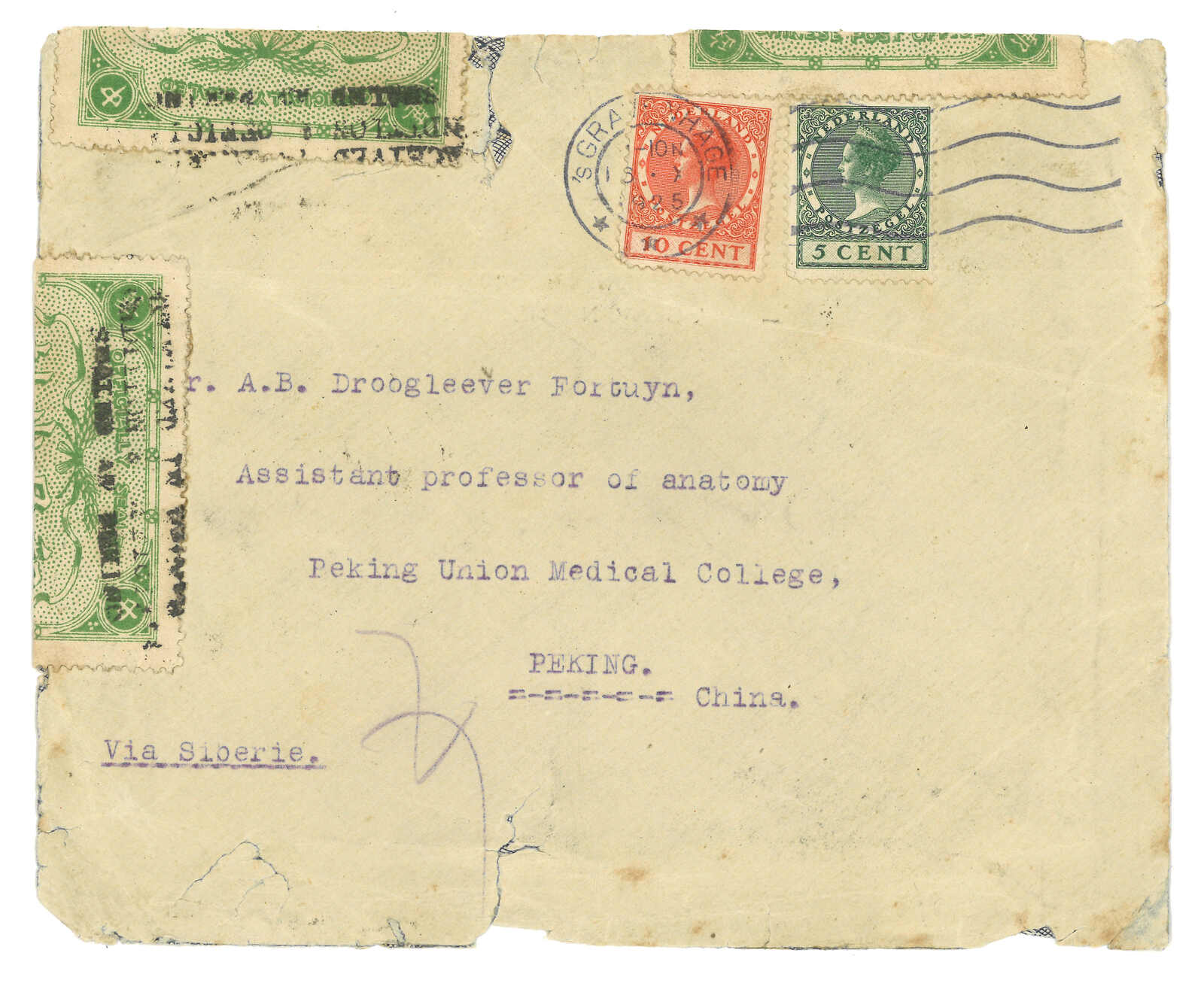1925年荷蘭寄北京,貼荷蘭票5分 + 10分,銷海牙波浪紋機戳。經天津。加貼第二版民國代封票及“RECEIVED IN BROKEN CONDITION & OFFICIALLY SEALED AT PEKING”橫戳。11.2抵北京。底部帶小裂口。(Image 1) (Image 2)